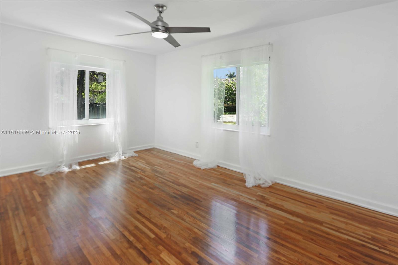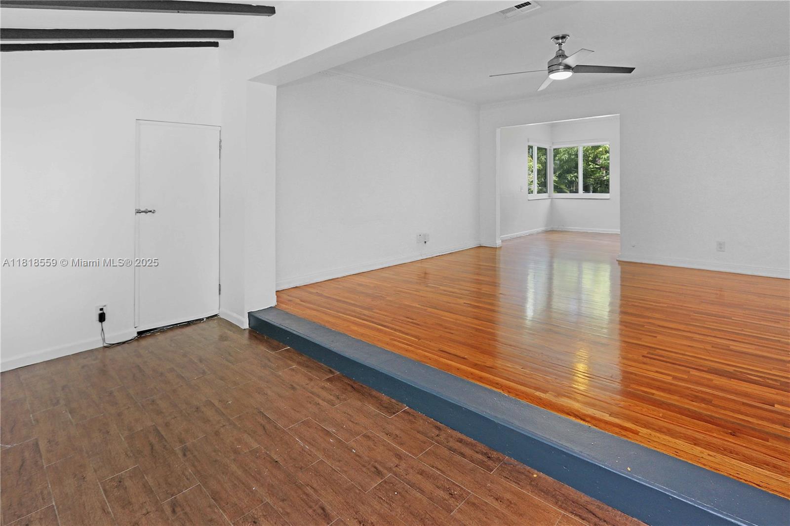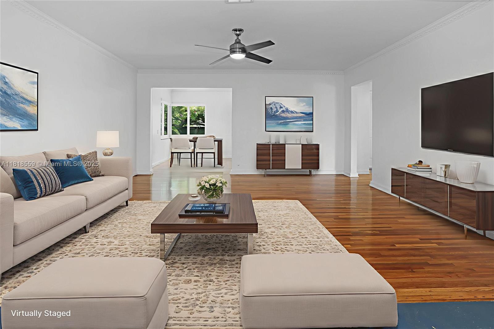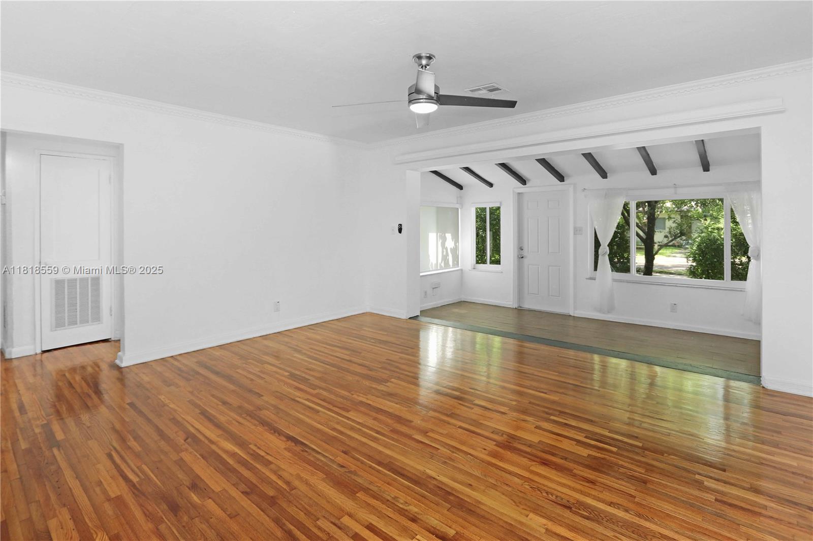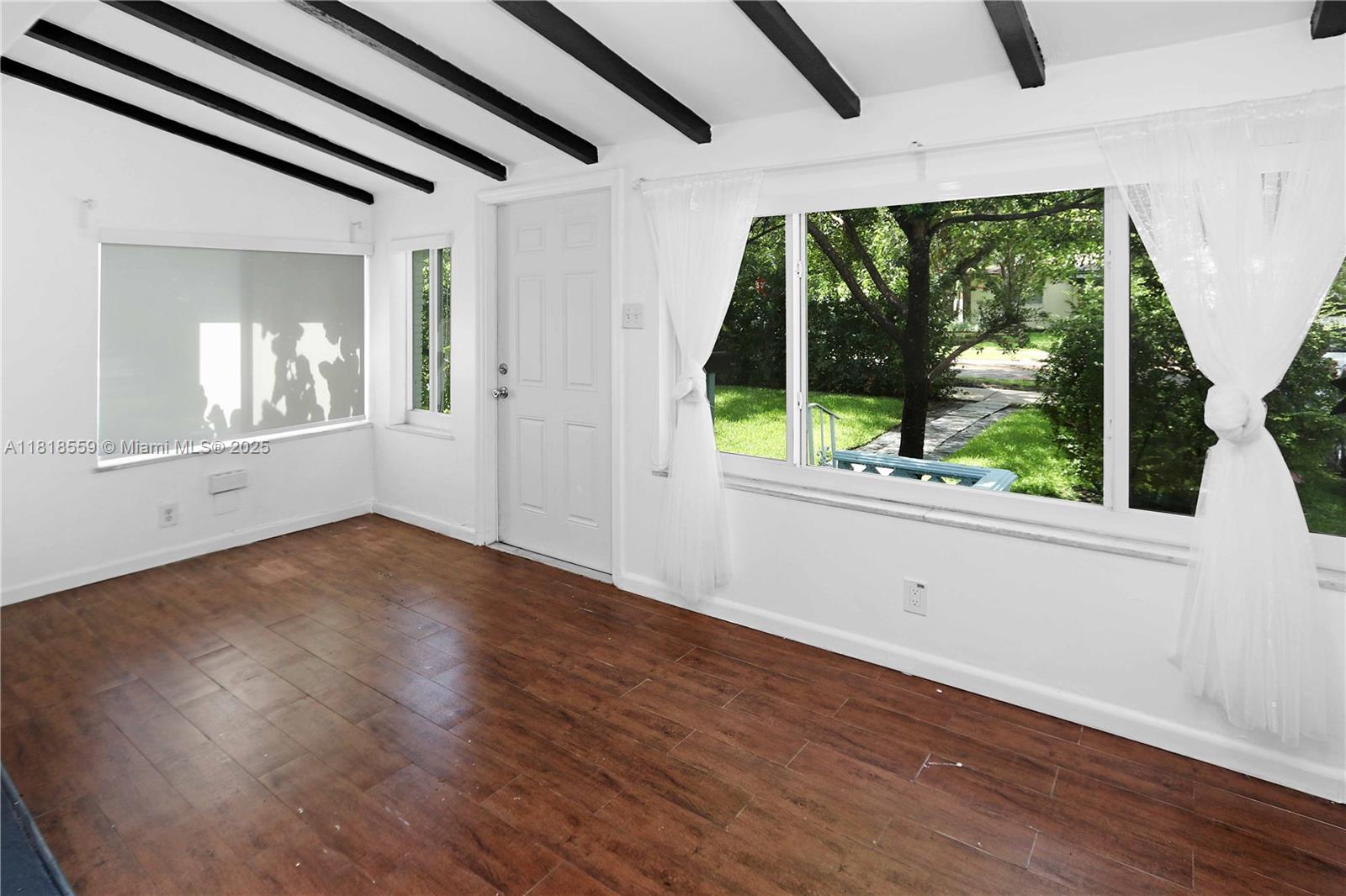 Welcome to this beautiful 2-bedroom, 2-bath home. Situated on a spacious corner lot. This 2-bedroom, 2-bath home includes a versatile additional room with its own cabana bath and private entrance—perfect as a home office. Step inside to original wood floors, crown molding, a kitchen updated with stainless steel appliances, quartz countertops, classic shaker cabinets, and an open living and dining concept. Enjoy the outdoors year-round with an open patio or under the shade of a majestic mango tree. You’ll also find mulberry, banana, and star fruit trees! Extra features include a large utility room, extra storage shed, 2020 shingle roof, and impact windows and doors!! Garage has been converted.