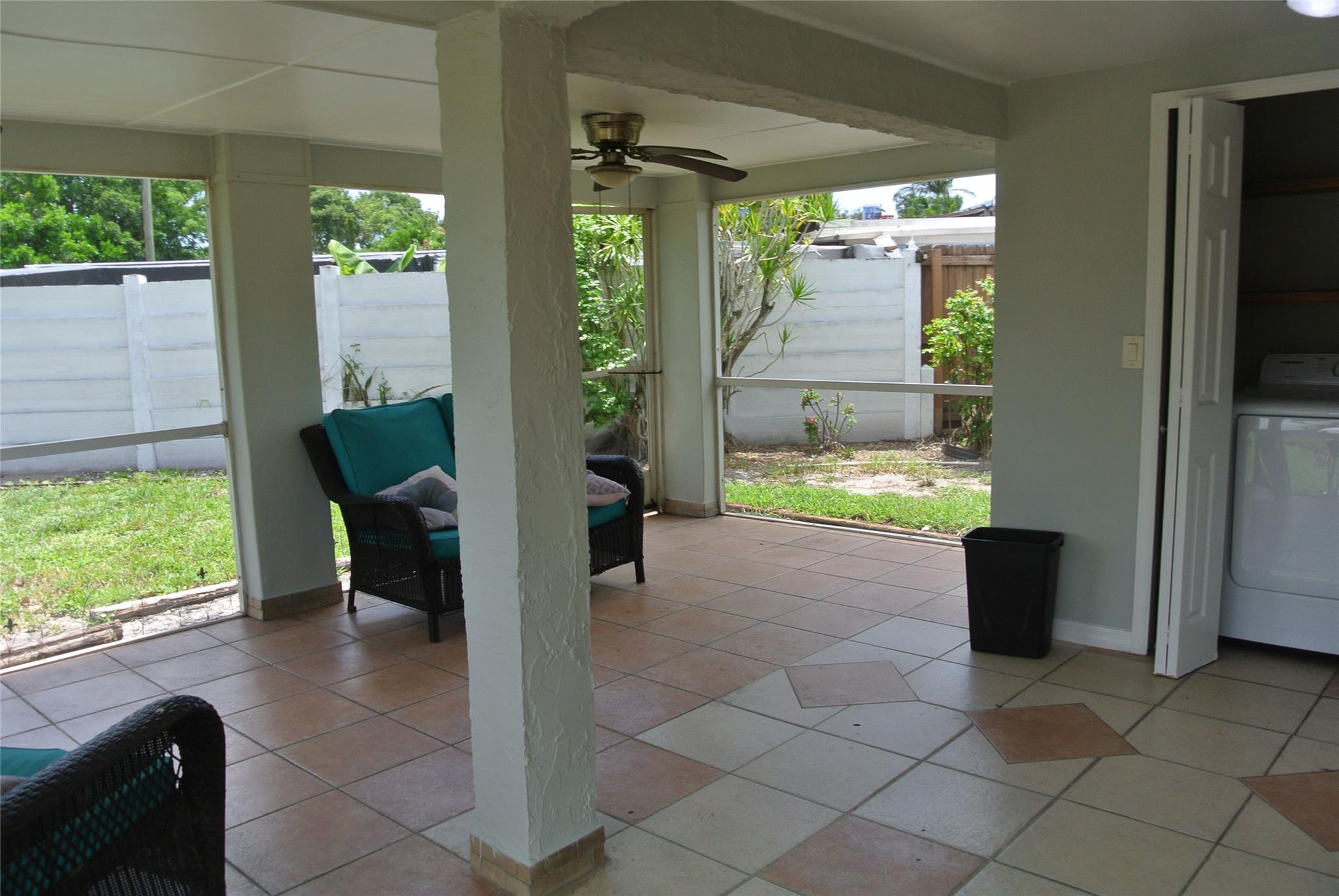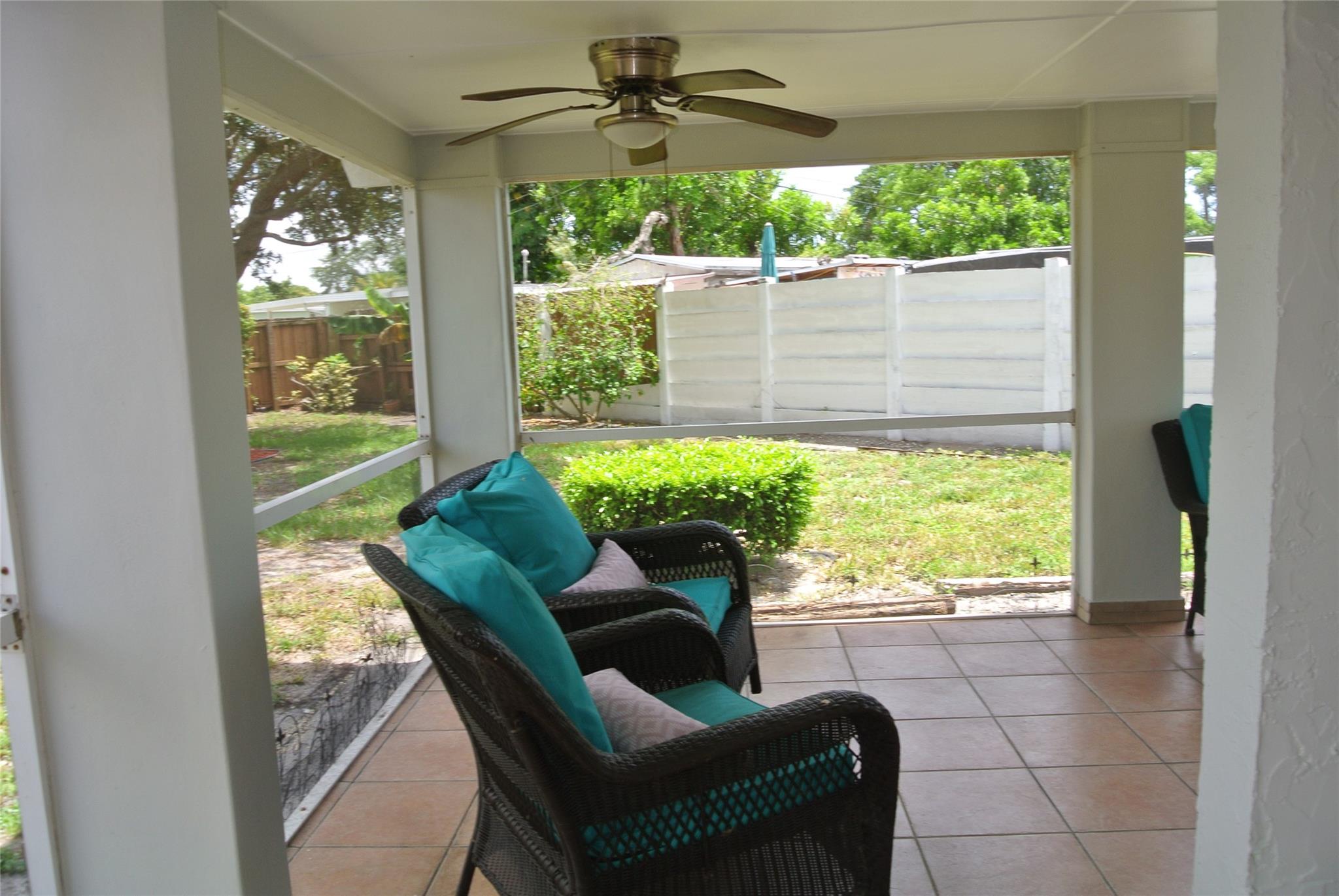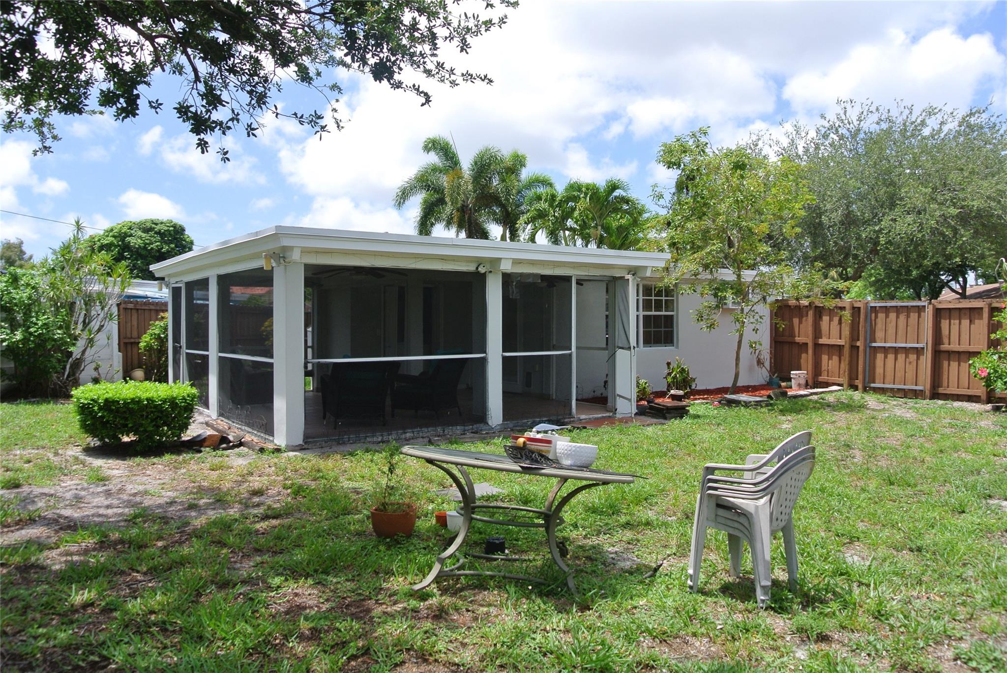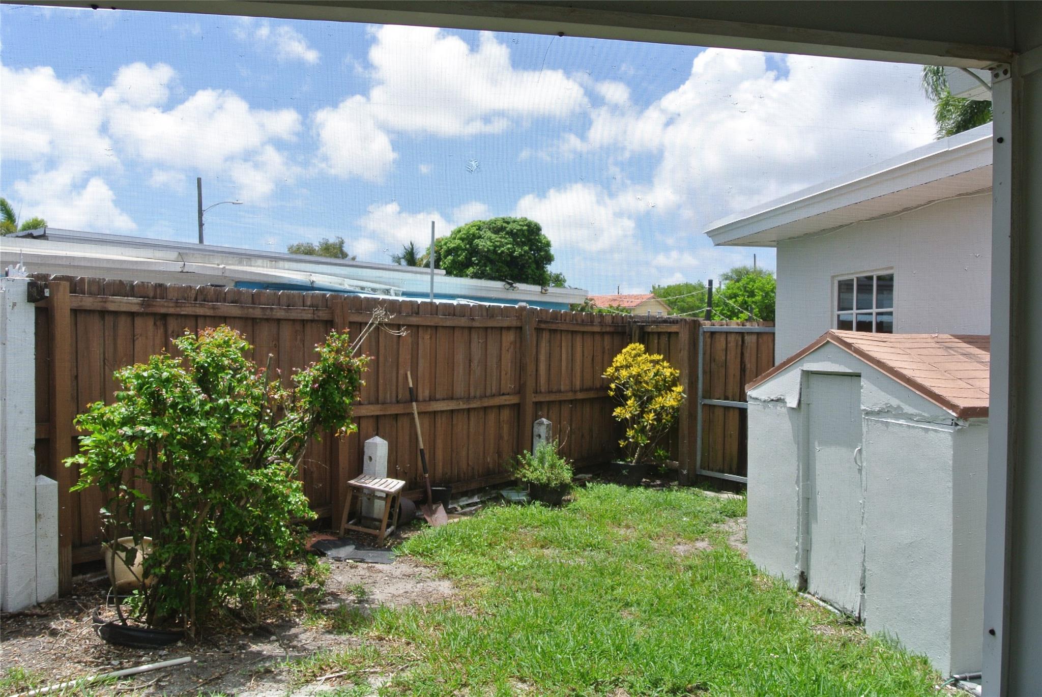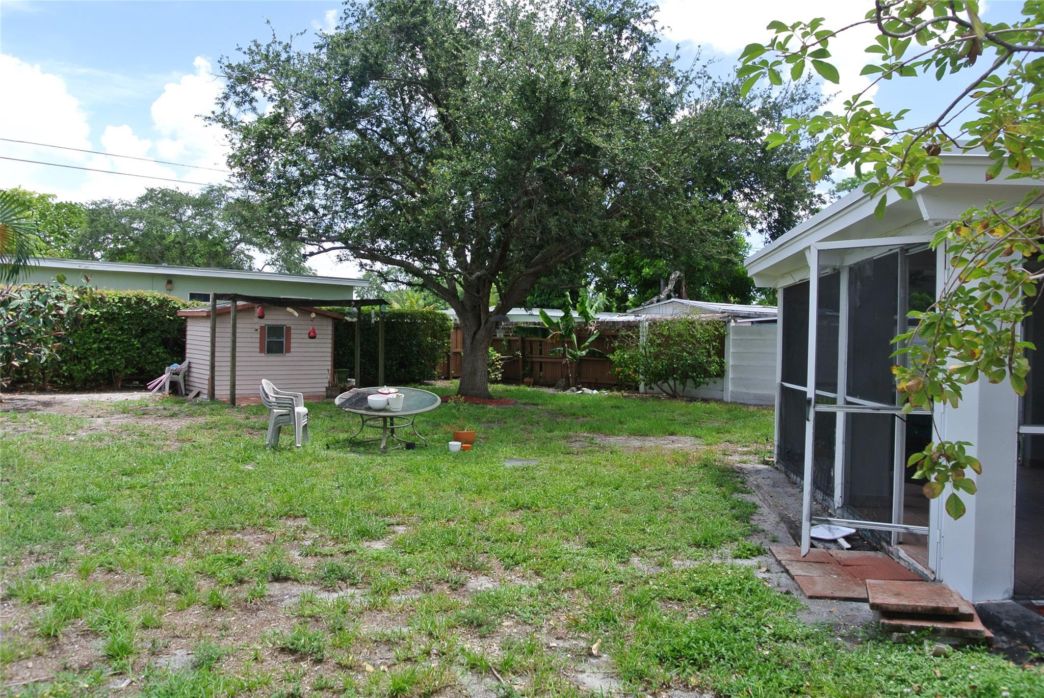 Unlimited possibilities in this charming and cozy single family home on corner lot with large circular driveway. Quiet and quaint neighborhood. Clean and freshly painted with detail trim around doors. Includes washer, dryer, whirlpool refrigerator and nice wood cabinets with tiled backsplash. Beautiful double glass doors lead to generous patio which is tiled and has screen enclosure for pets and children to enjoy. Huge backyard with banana tree, shed and completely fenced in. Room for an expansive pool and more! Roof is 2021. NO HOA. Centrally located. Minutes to the The Hard Rock Casino, amazing restaurants, great shopping and entertainment. Great Opportunity !