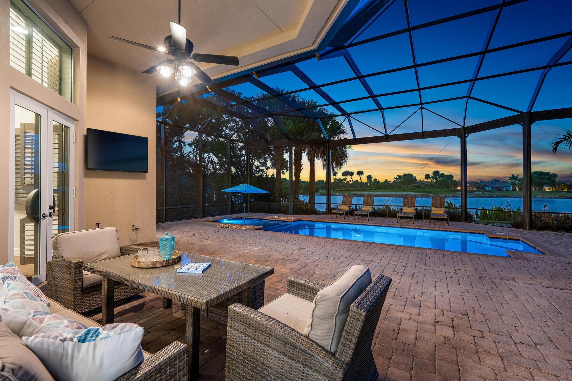 IMMEDIATE ACCESS to a FULL GOLF MEMBERSHIP! Wake up to golden sunrises over still water and views of the signature 16th hole. -- a private estate in Jupiter Country Club where luxury meets lifestyle. Set on one of the most coveted lots in the community, this move-in-ready home offers sweeping water and golf course views, and a freshly painted interior. Designed for both growing families and seasonal residents, the flexible floorplan features a main-level primary suite and guest suite, plus 2 (3) additional guest suites upstairs. Entertain with ease in the beautiful kitchen, unwind in the screened lanai, or take the golf cart for dinner at the club. With a 2-car garage plus dedicated golf cart garage, this home blends elegance with everyday convenience. All within a gated community offering
