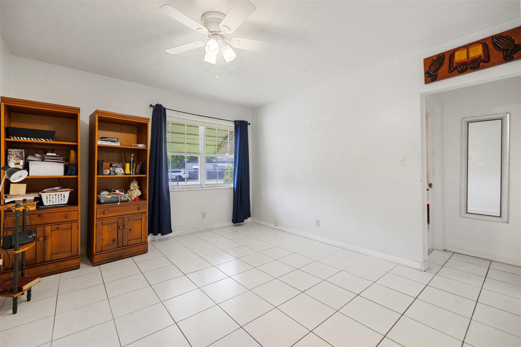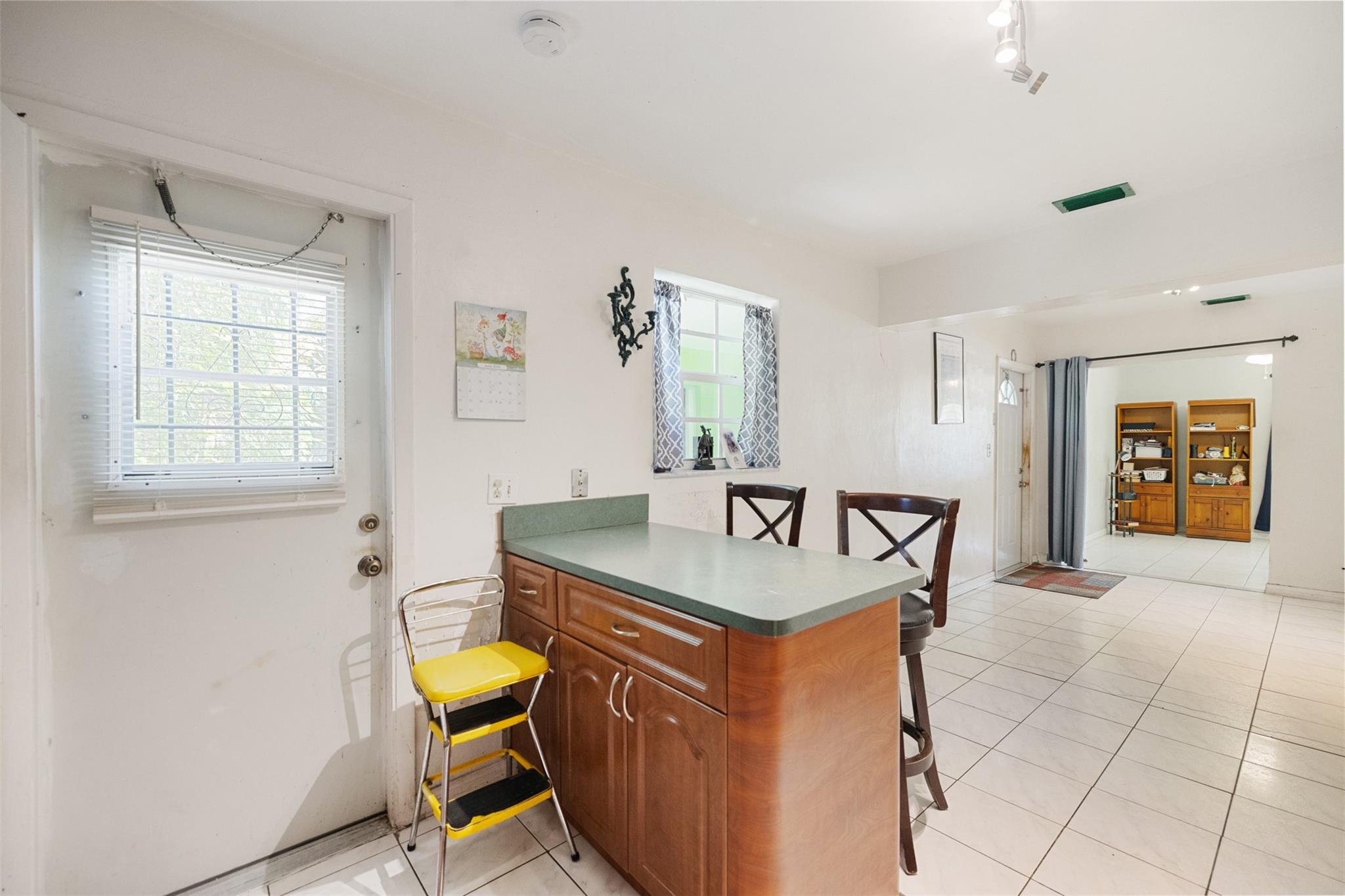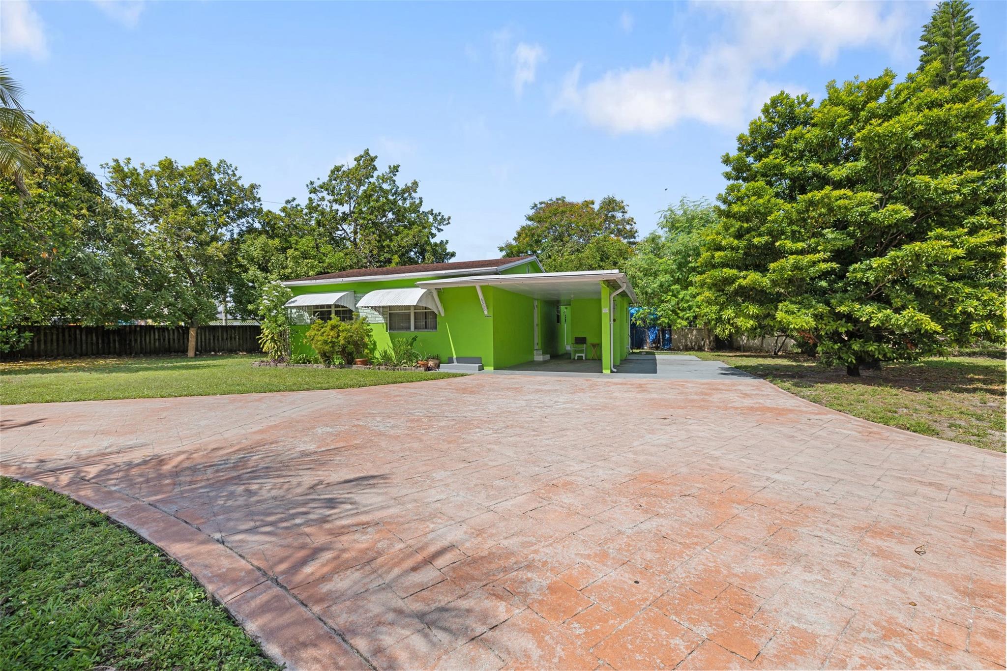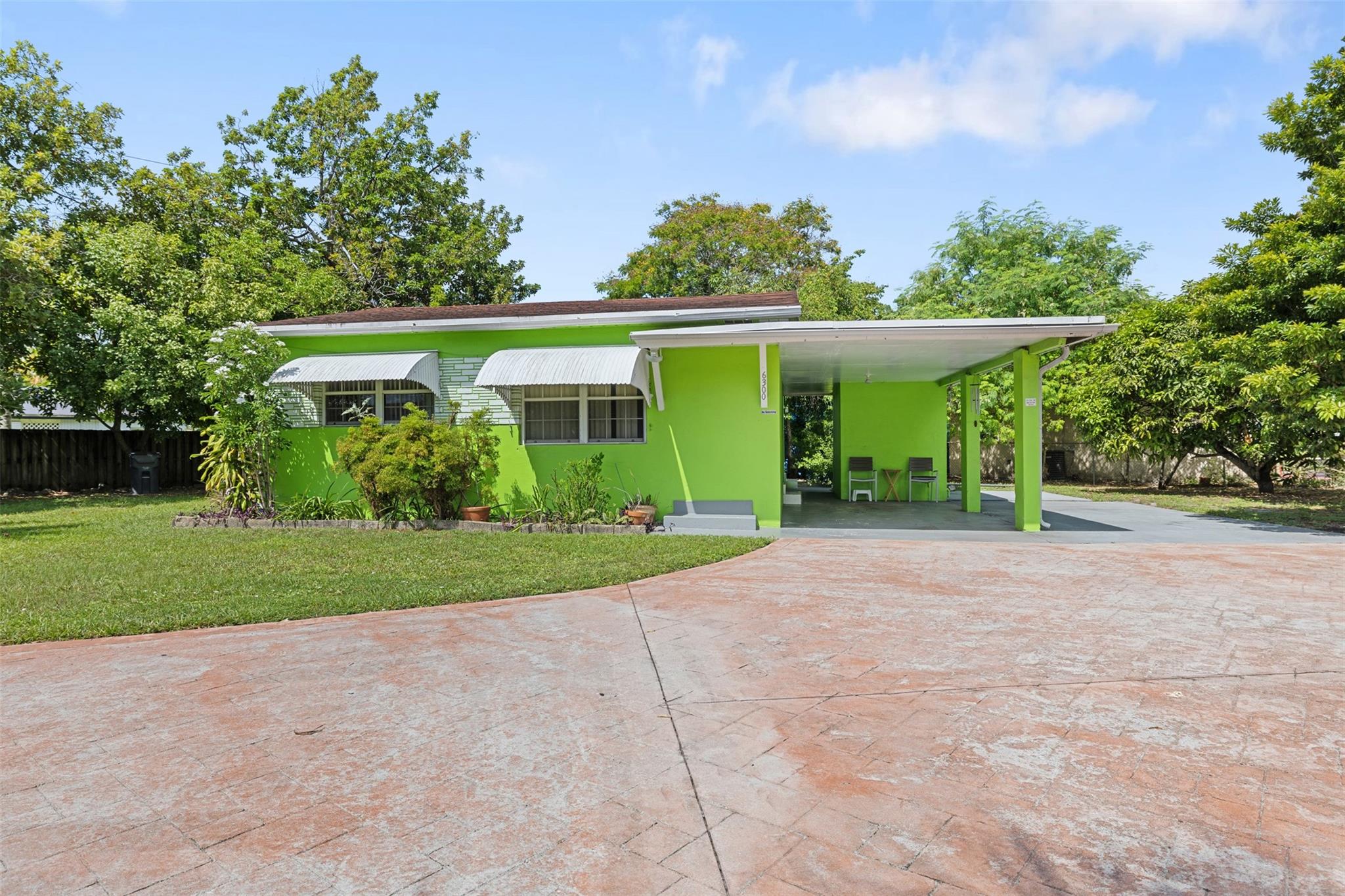 Welcome to this charming 2-bedroom, 2-bathroom home with no HOA! Located on a spacious 10,000+ sq ft corner lot with room for a pool. Property is fully gated, perfect for pets. Includes a 1-car carport and circular driveway for guest parking. A shed in back offers extra storage. The yard features mango, starfruit, jackfruit, guinep, sweet sap, avocado, plum, moringa, Ethiopian apple, lemongrass, and oregano plants. Close to major highways, shopping, dining, Hard Rock Casino & Stadium, FLL Airport, and beaches. Kitchen has wooden cabinets. Tile flooring throughout. Ceiling fans add comfort. The home comes partially furnished. Guest bedroom has a walk-in closet; primary bedroom includes an en-suite bath. Full-size washer and dryer are in a covered, attached area. A/C is 2015. Roof is 2005.