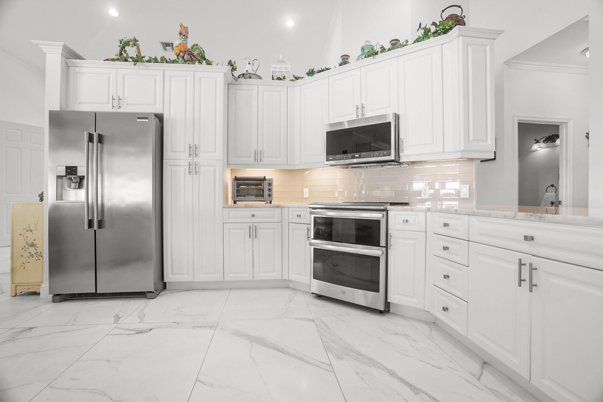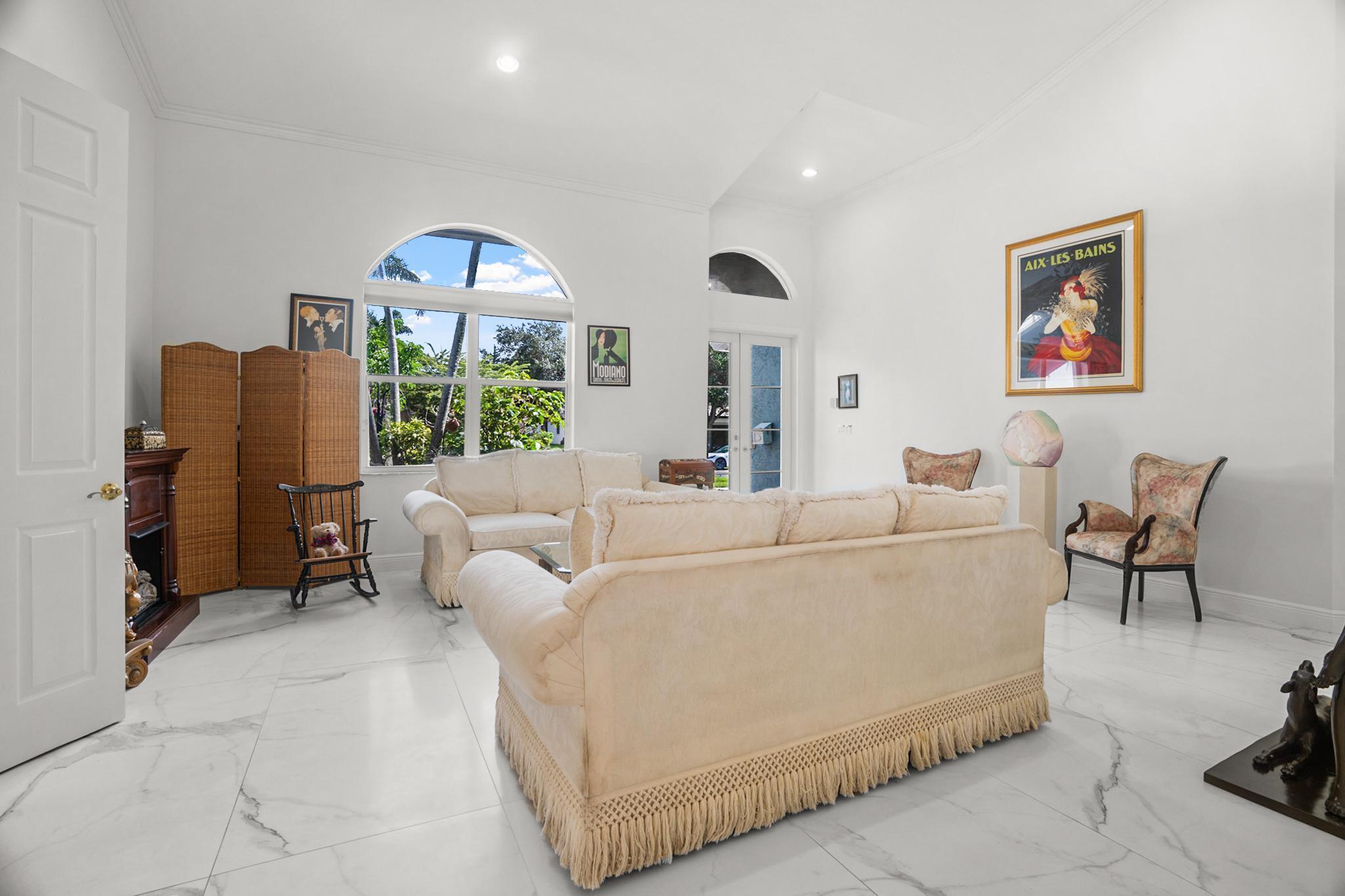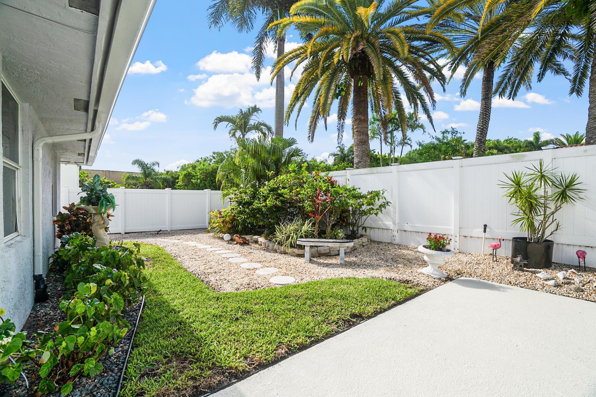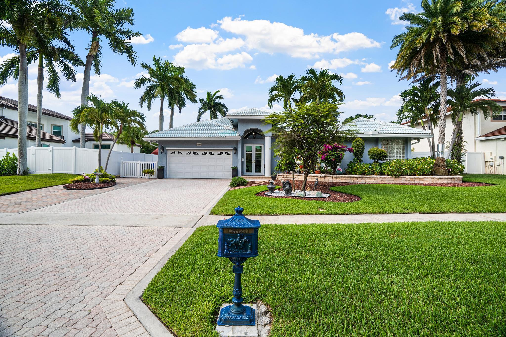 Nestled in a quiet enclave in desirable East Boca Raton, this Mizner Forest home was built in 1998 and offers a thoughtfully designed layout with stylish upgrades throughout. Featuring soaring high ceilings and a renovated white kitchen, the home has modern flooring throughout the main living areas and one guest bedroom & family room. The split bedroom floor plan offers privacy, and the spacious primary suite includes direct access to the covered patio and pool area. Primary bath features a separate soaking tub and shower. Additional highlights include a 3-year-old A/C system, a tankless water heater, and an extra water heater dedicated to the primary suite. Impact doors. Fully fenced backyard is an entertainer's dream, showcasing a stunning pool &expansive patio