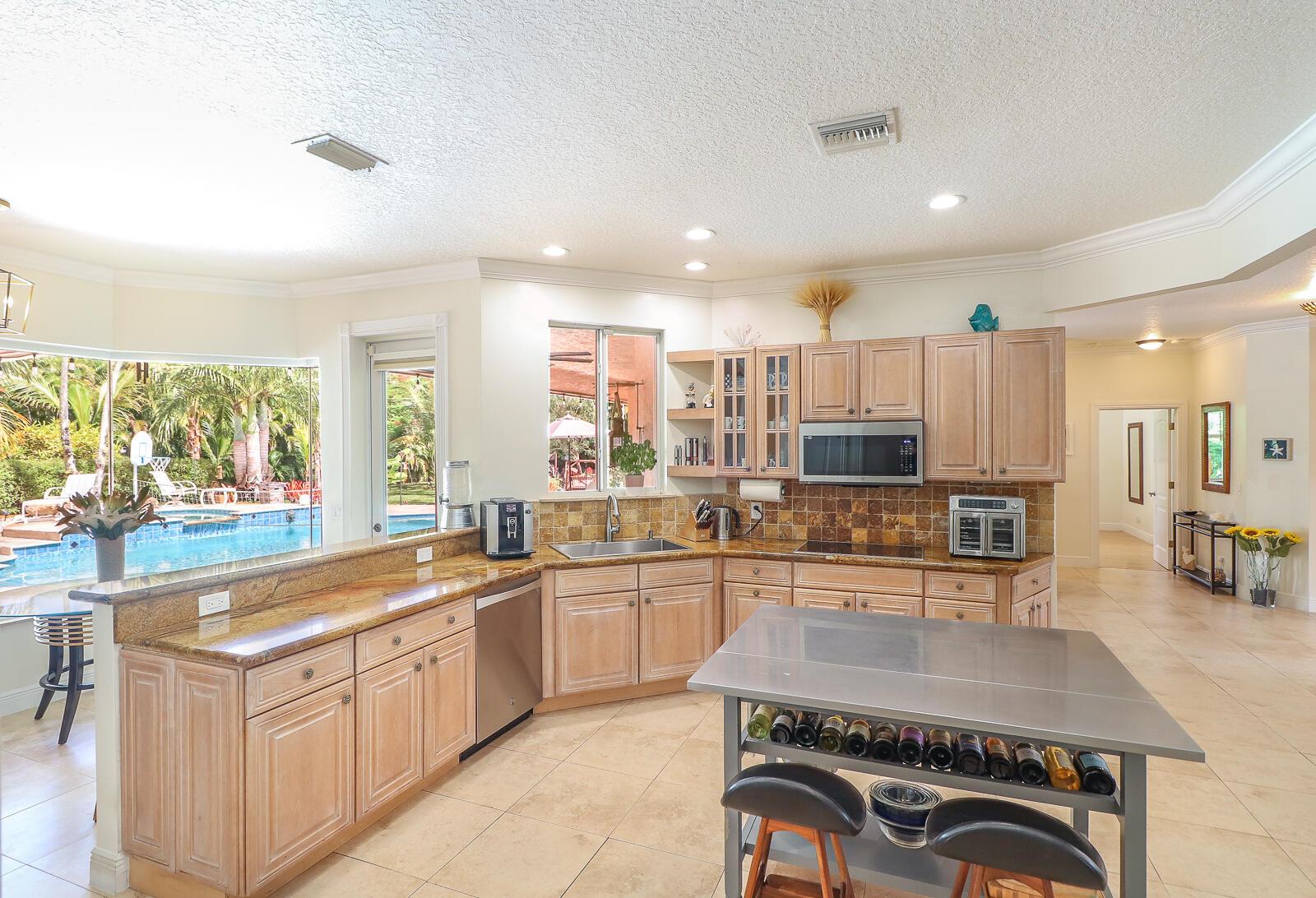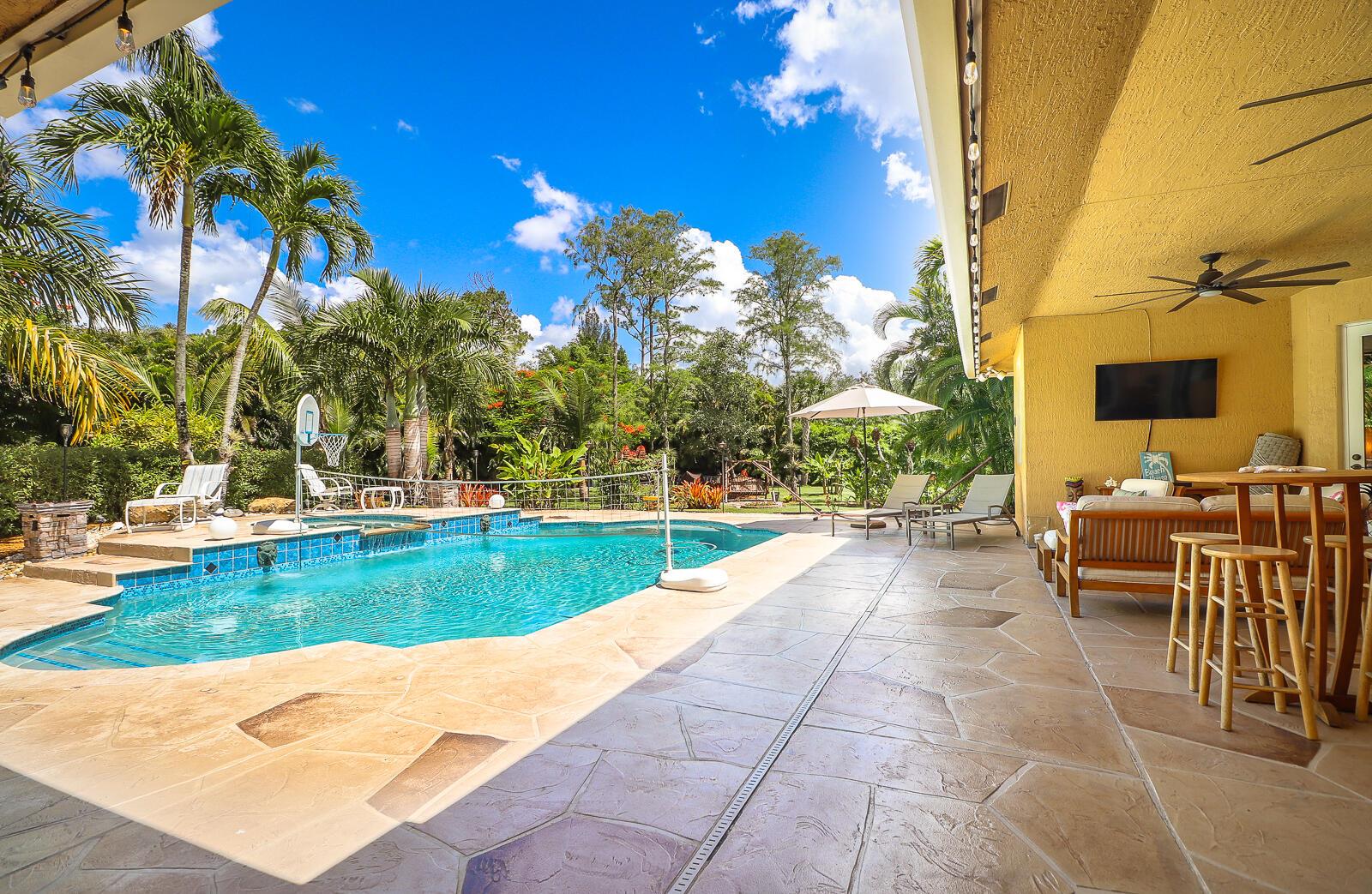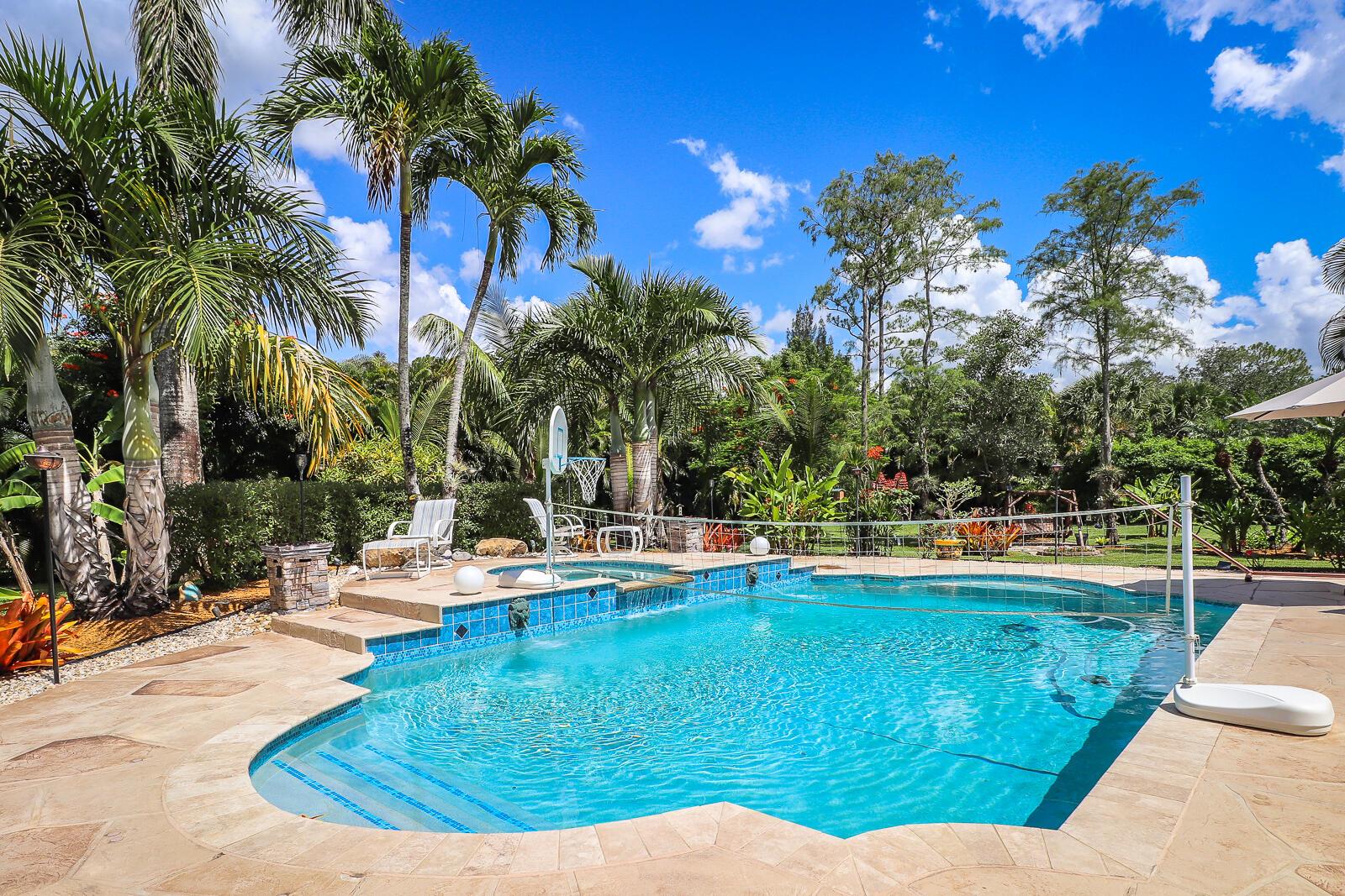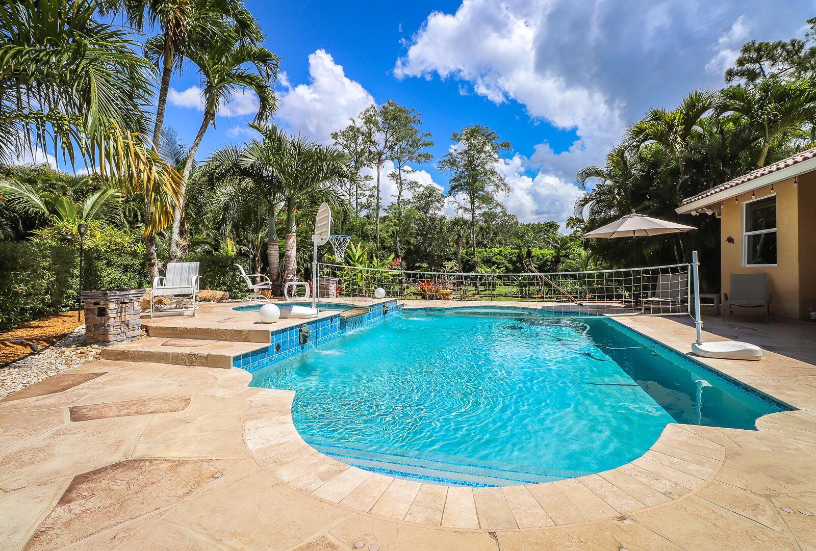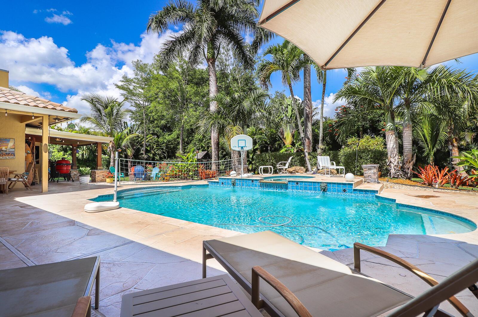 One of the nicest homes on the market! This gorgeous 4 bedroom, 3.5 bath, 2-car garage CBS home with a pool is located on a lushly-landscaped 1.17-acre lot in Palm Beach Country Estates. The stunning back yard with tropical landscaping is fully-fenced with an electric driveway entry gate and additional gate to the yard. Split floorplan with formal dining room, separate living and family rooms, high ceilings, and two cabana baths. Impact glass and hurricane doors. Newer A/C. Gourmet kitchen features granite countertops, wood cabinets, stainless steel appliances, and breakfast nook with panoramic seamless-glass window overlooking the pool area. Fully-renovated pool and jacuzzi with covered porch and spacious patio deck. Extra covered porch for grilling with exhaust fan.