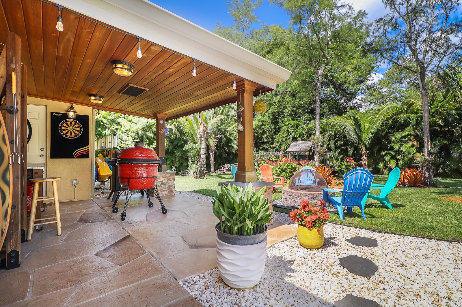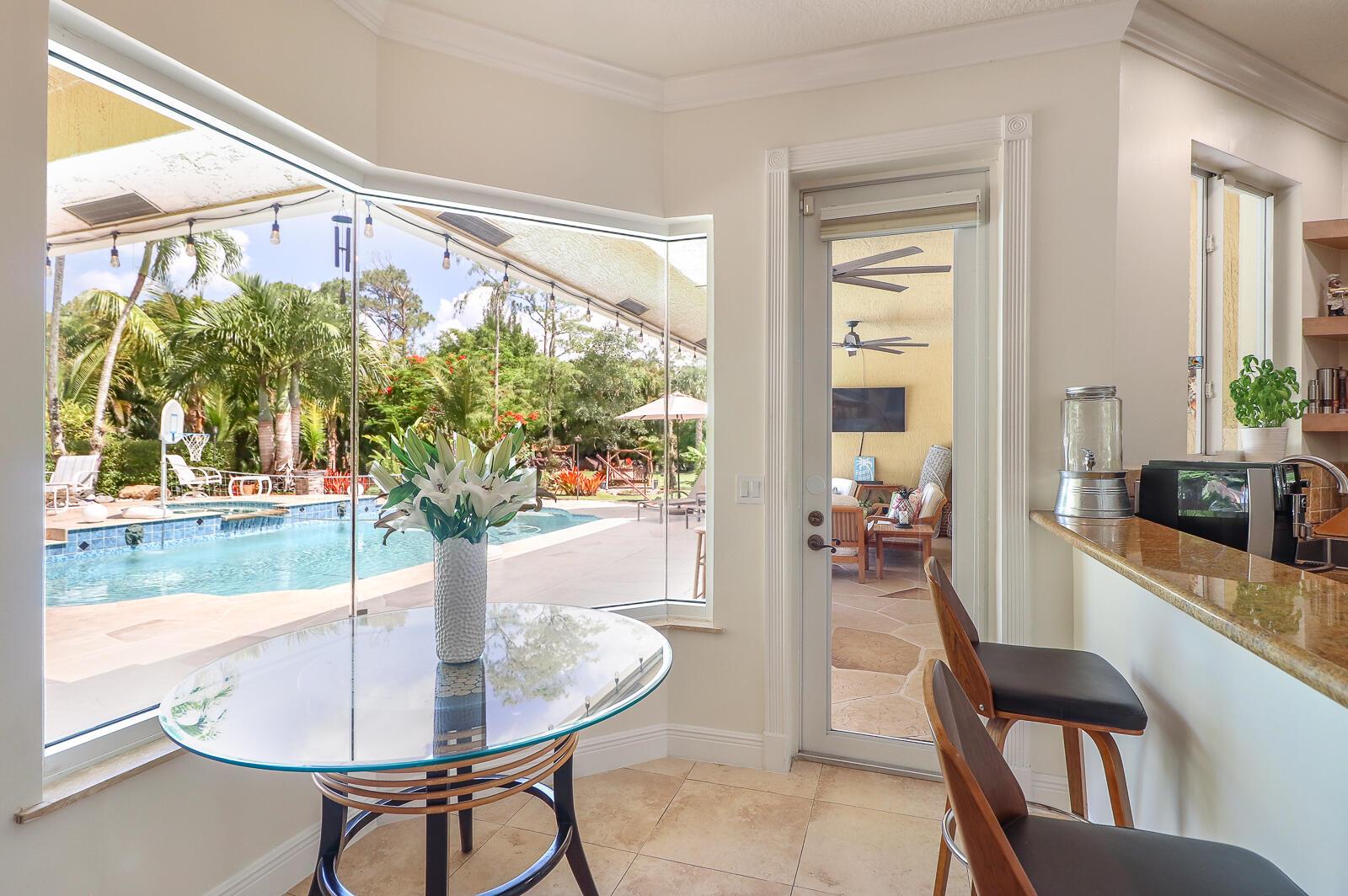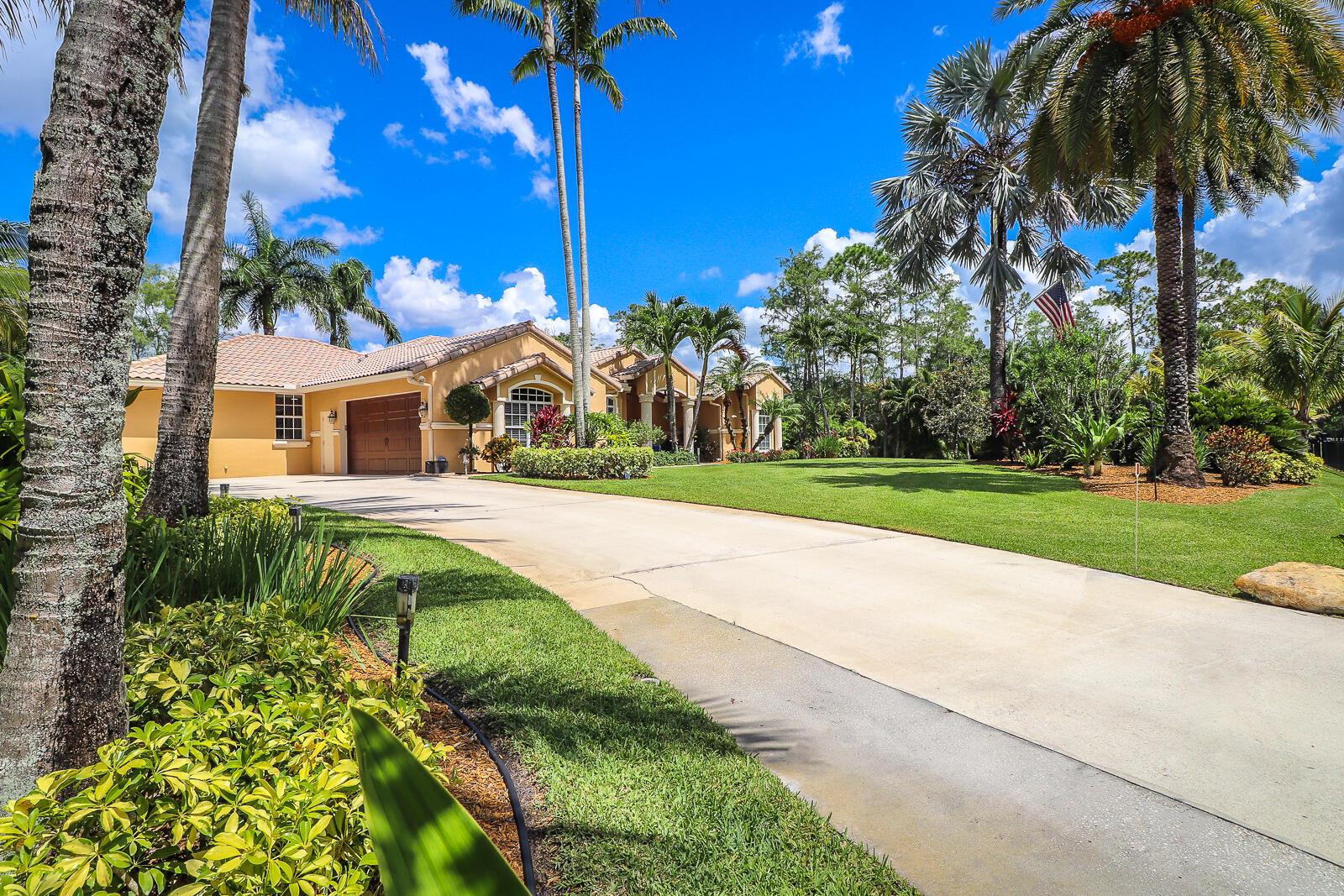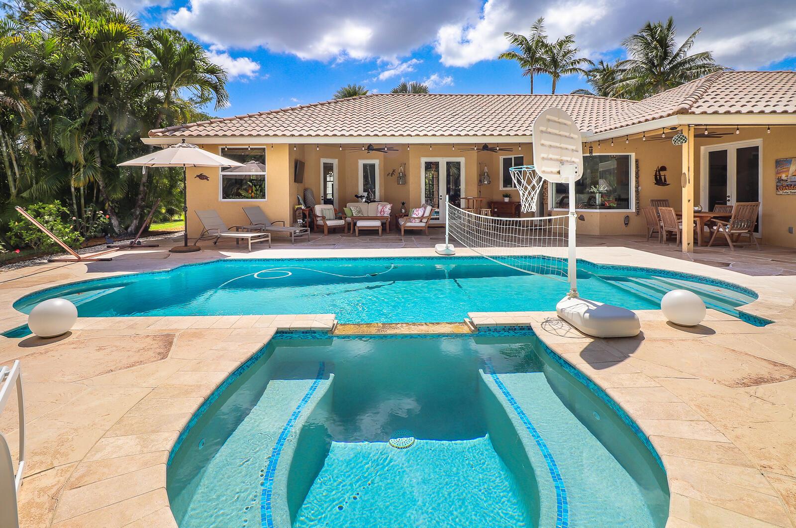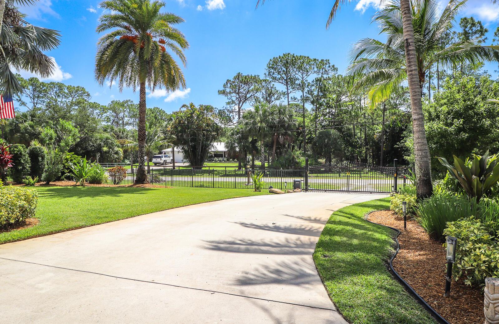 One of the nicest homes on the market! This gorgeous 4 bedroom, 3.5 bath, 2-car garage CBS home with a pool is located on a lushly-landscaped 1.17-acre lot in Palm Beach Country Estates. The stunning back yard with tropical landscaping is fully-fenced with an electric driveway entry gate and additional gate to the yard. Split floorplan with formal dining room, separate living and family rooms, high ceilings, and two cabana baths. Impact glass and hurricane doors. Newer A/C. Gourmet kitchen features granite countertops, wood cabinets, stainless steel appliances, and breakfast nook with panoramic seamless-glass window overlooking the pool area. Fully-renovated pool and jacuzzi with covered porch and spacious patio deck. Extra covered porch for grilling with exhaust fan.