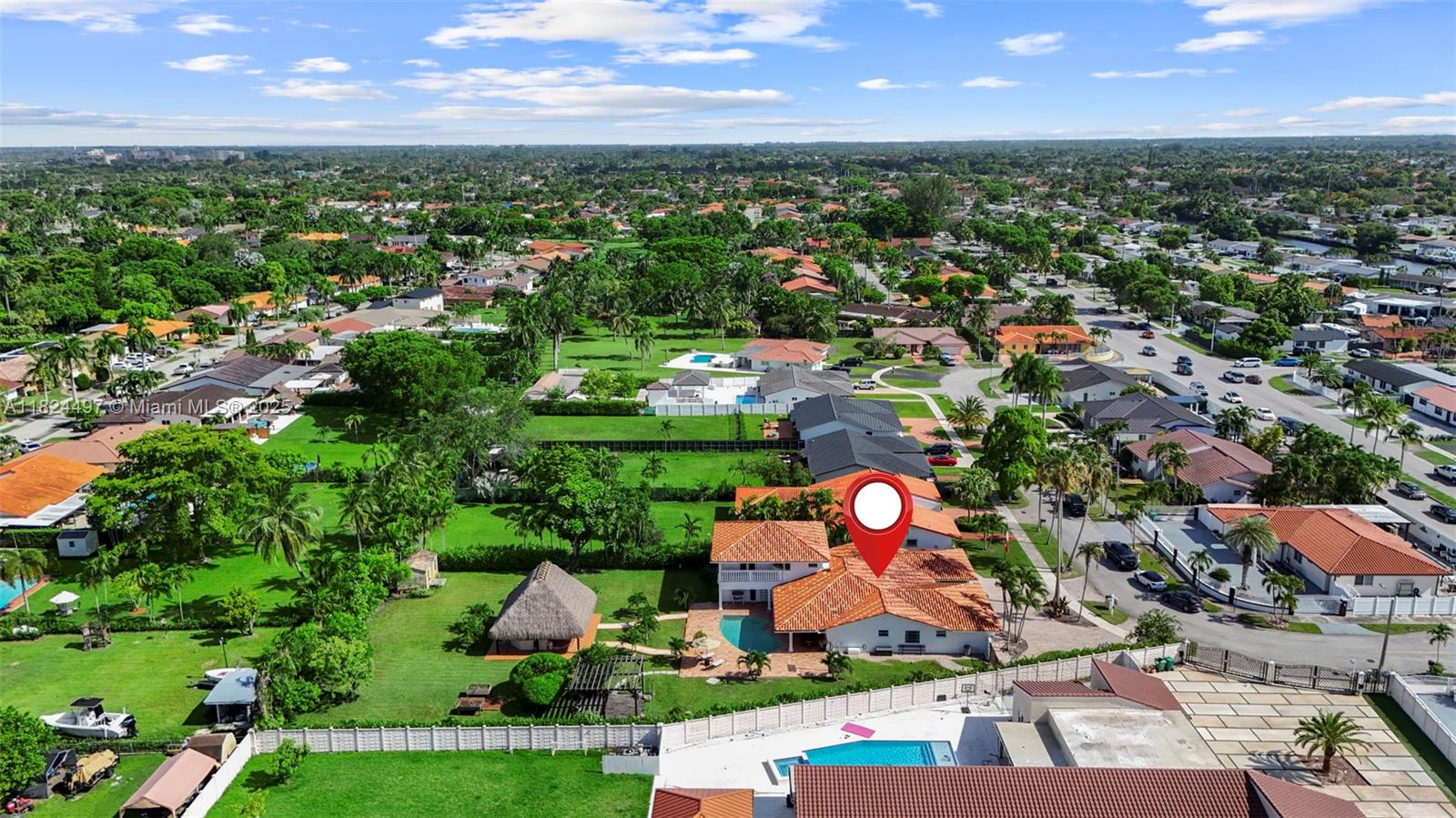 Beautiful executive home in the heart of Tamiami, just 7 min to FIU, 2 min to Belen Jesuit, and 5 min from the Miami-Dade County Fairgrounds. This spacious 6-bed, 4.5-bath residence features a brand-new kitchen, separated family room, and two suites—one junior primary downstairs and a luxurious upstairs primary with a private office. Situated on an oversized 23,000+ sq ft lot, the backyard is a true oasis with a pergola, 24x24 ft tiki hut, and full outdoor cooking area—perfect for entertaining or relaxing with family. A rare gem in a prime location!