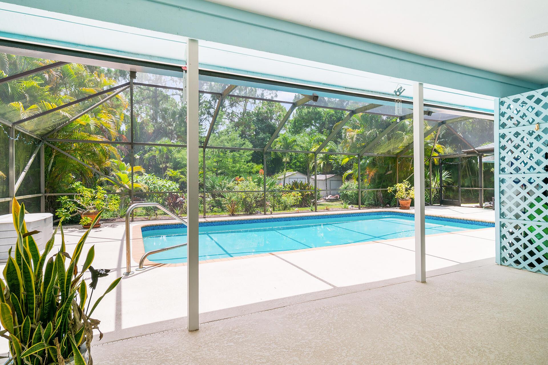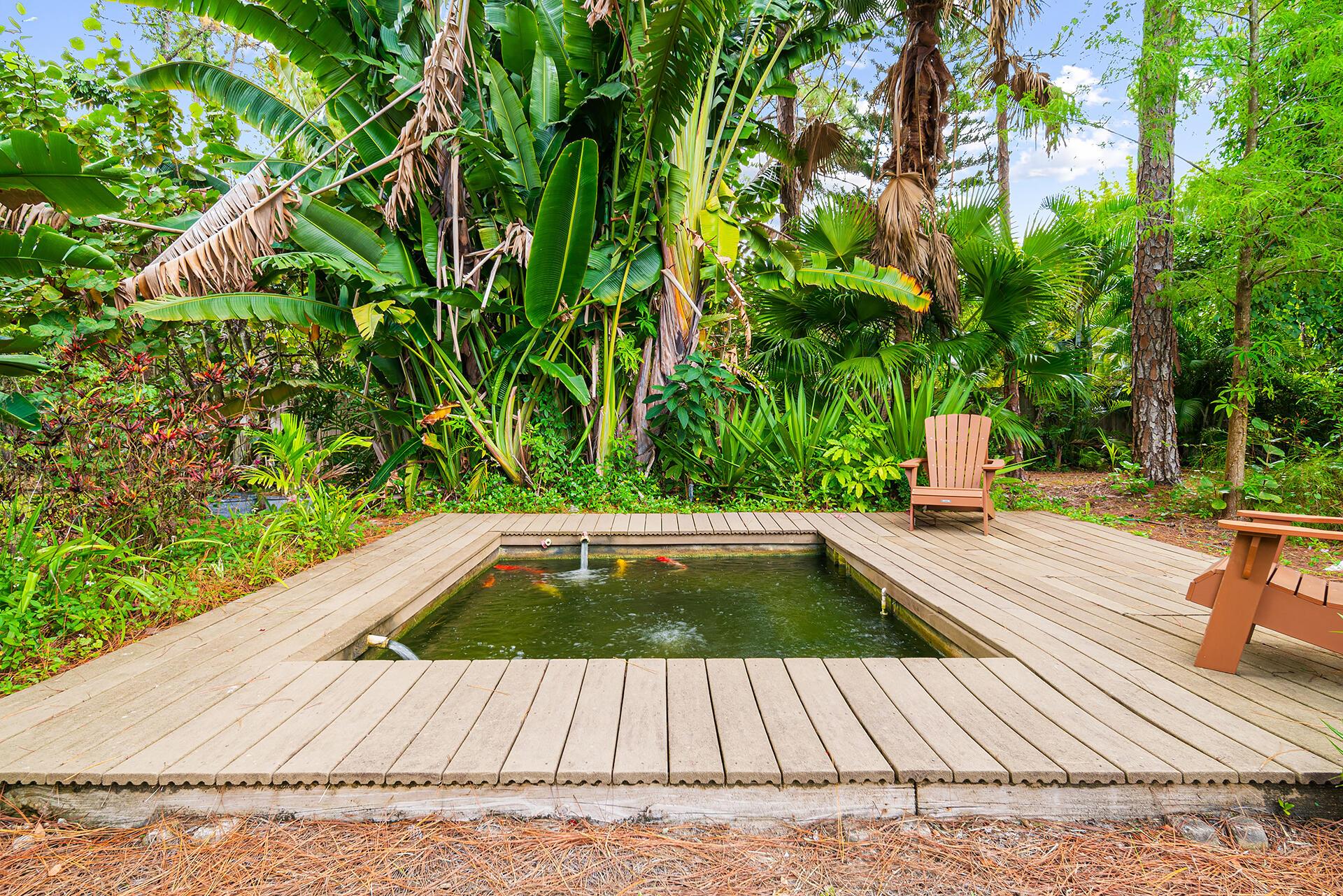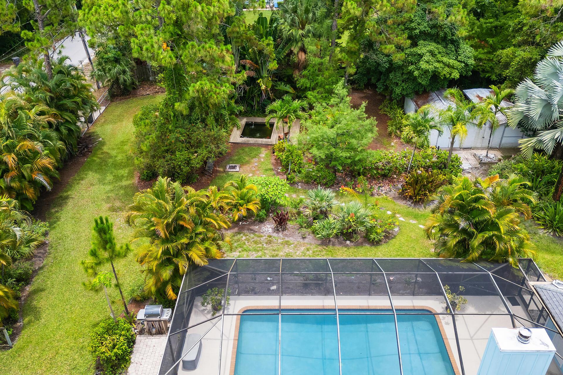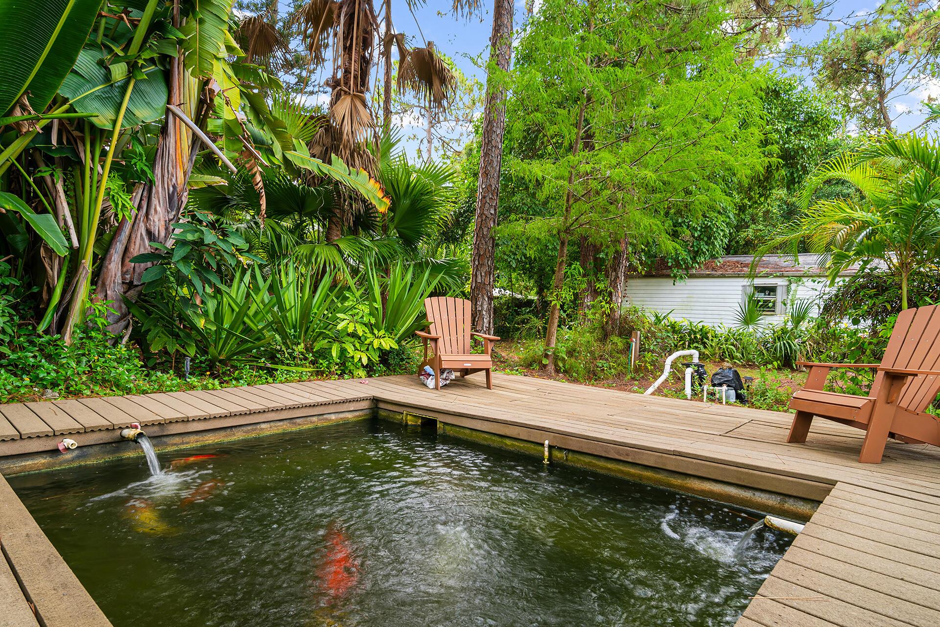 1.25 Tropical acre corner lot featuring double cement driveway holds approx 8 cars, glass sliders to covered lanai from Master Bd, Dining, Family Rm & 2nd bd, vaulted ceilings, wood burning fireplace, abundance of kitchen cabinetry & counters, oversized kitchen center island , perfect In Law arrangement with full kitchen, separate exterior entry plus door entry from main house, Possible 5th Bedroom, Screened in lanai and pool, Kitchen & Breakfast rm as well as very large family room is all open, very bright and lots of natural light, partial impact windows, maintenance free flooring thru out, bay windows in Living Room, KOI pond, in ground pool heated by solar panel and so much more!