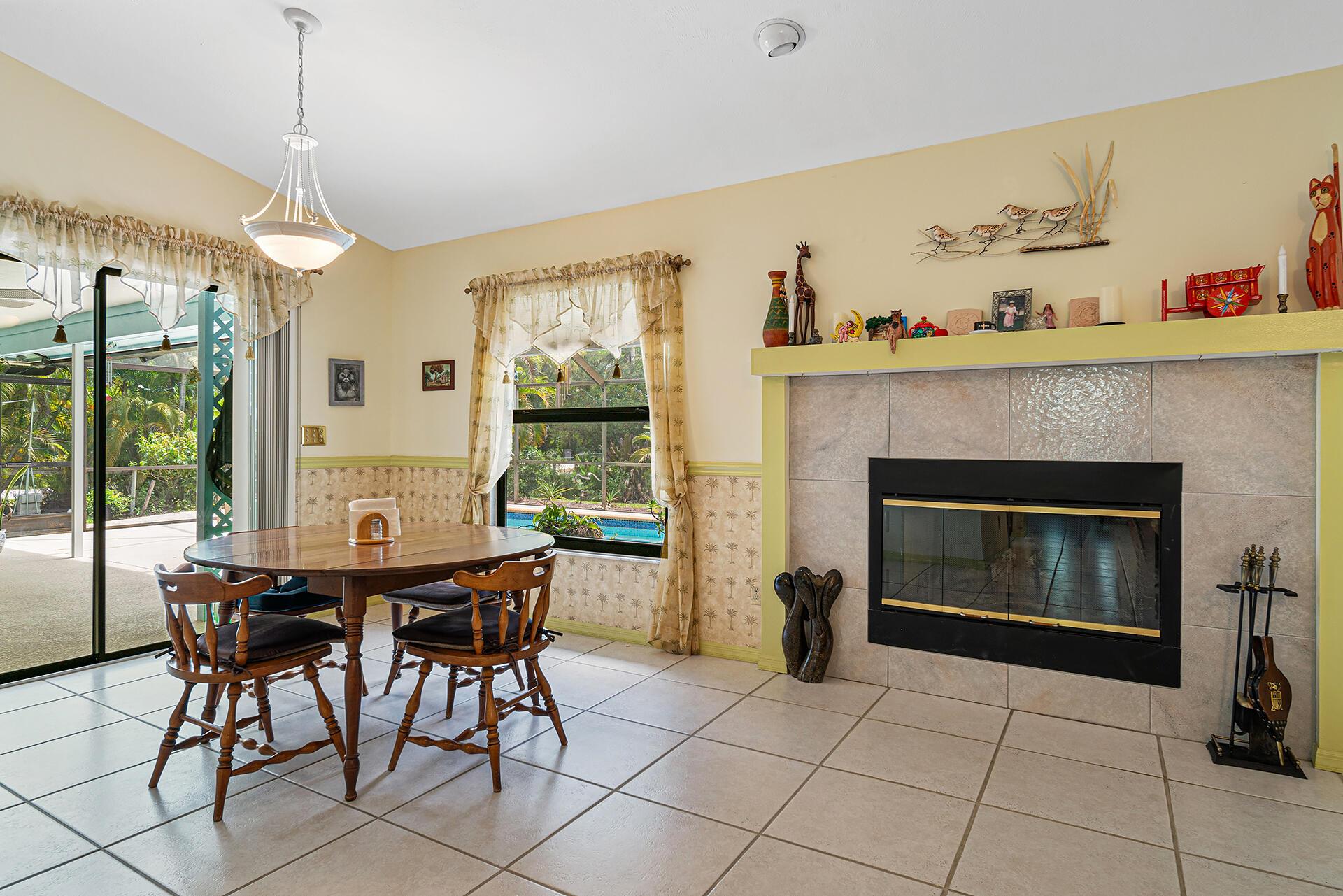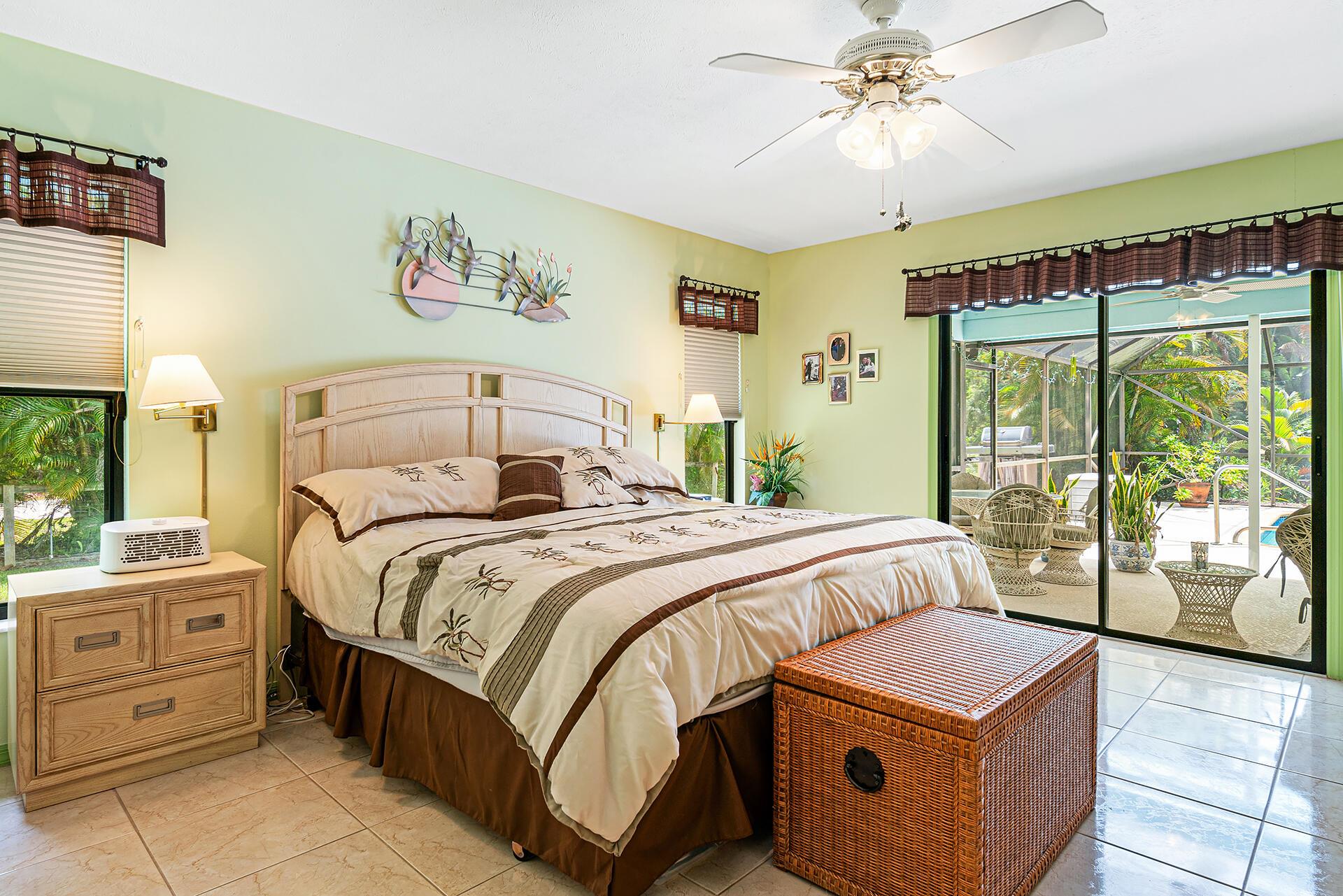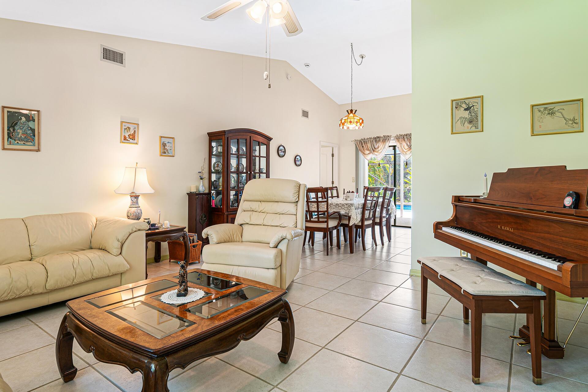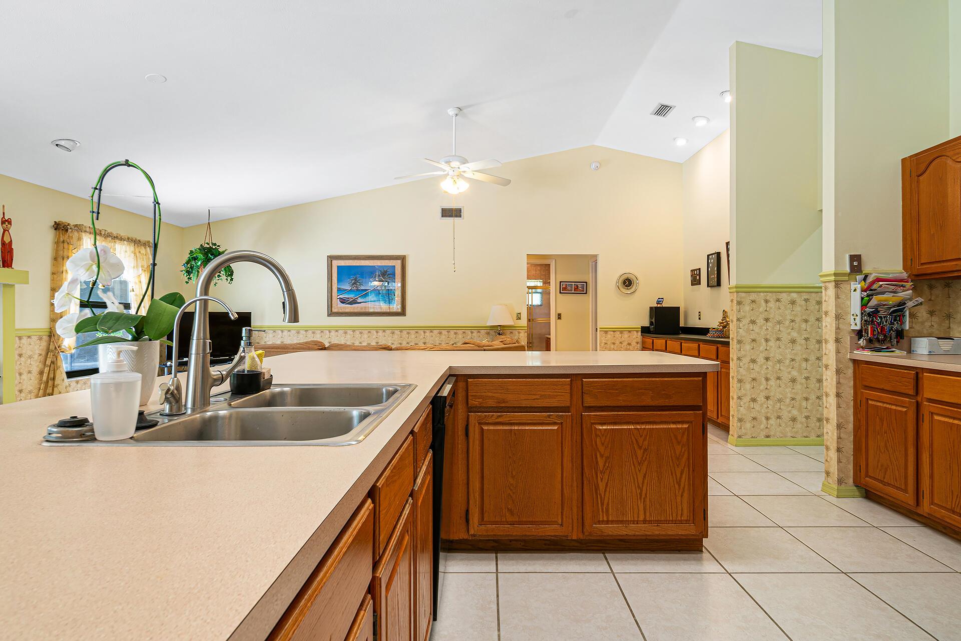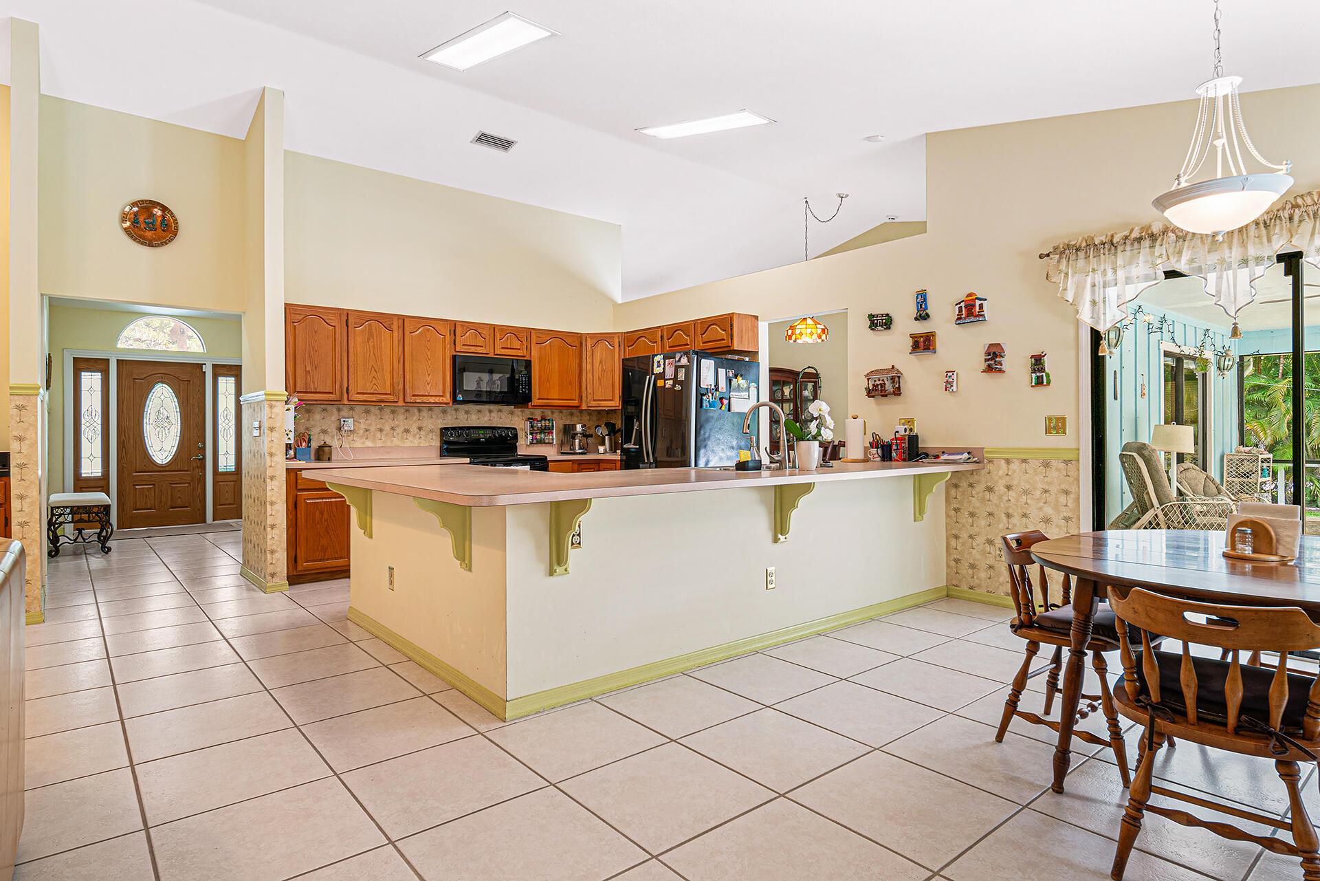 1.25 Tropical acre corner lot featuring double cement driveway holds approx 8 cars, glass sliders to covered lanai from Master Bd, Dining, Family Rm & 2nd bd, vaulted ceilings, wood burning fireplace, abundance of kitchen cabinetry & counters, oversized kitchen center island , perfect In Law arrangement with full kitchen, separate exterior entry plus door entry from main house, Possible 5th Bedroom, Screened in lanai and pool, Kitchen & Breakfast rm as well as very large family room is all open, very bright and lots of natural light, partial impact windows, maintenance free flooring thru out, bay windows in Living Room, KOI pond, in ground pool heated by solar panel and so much more!