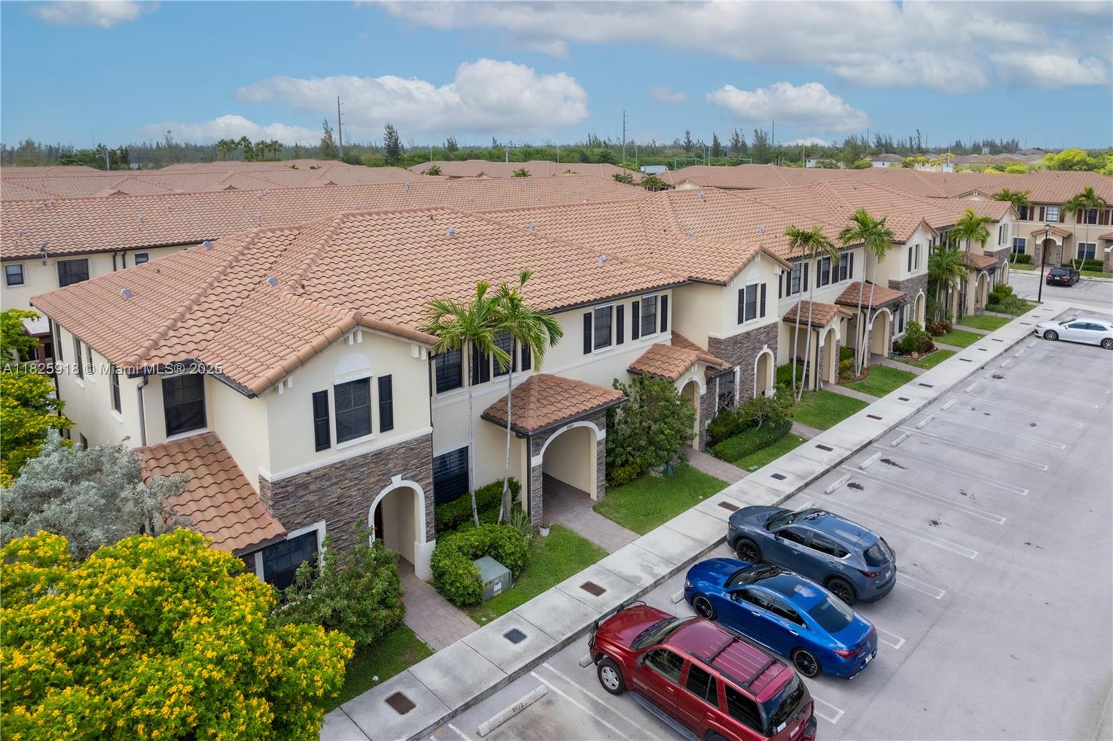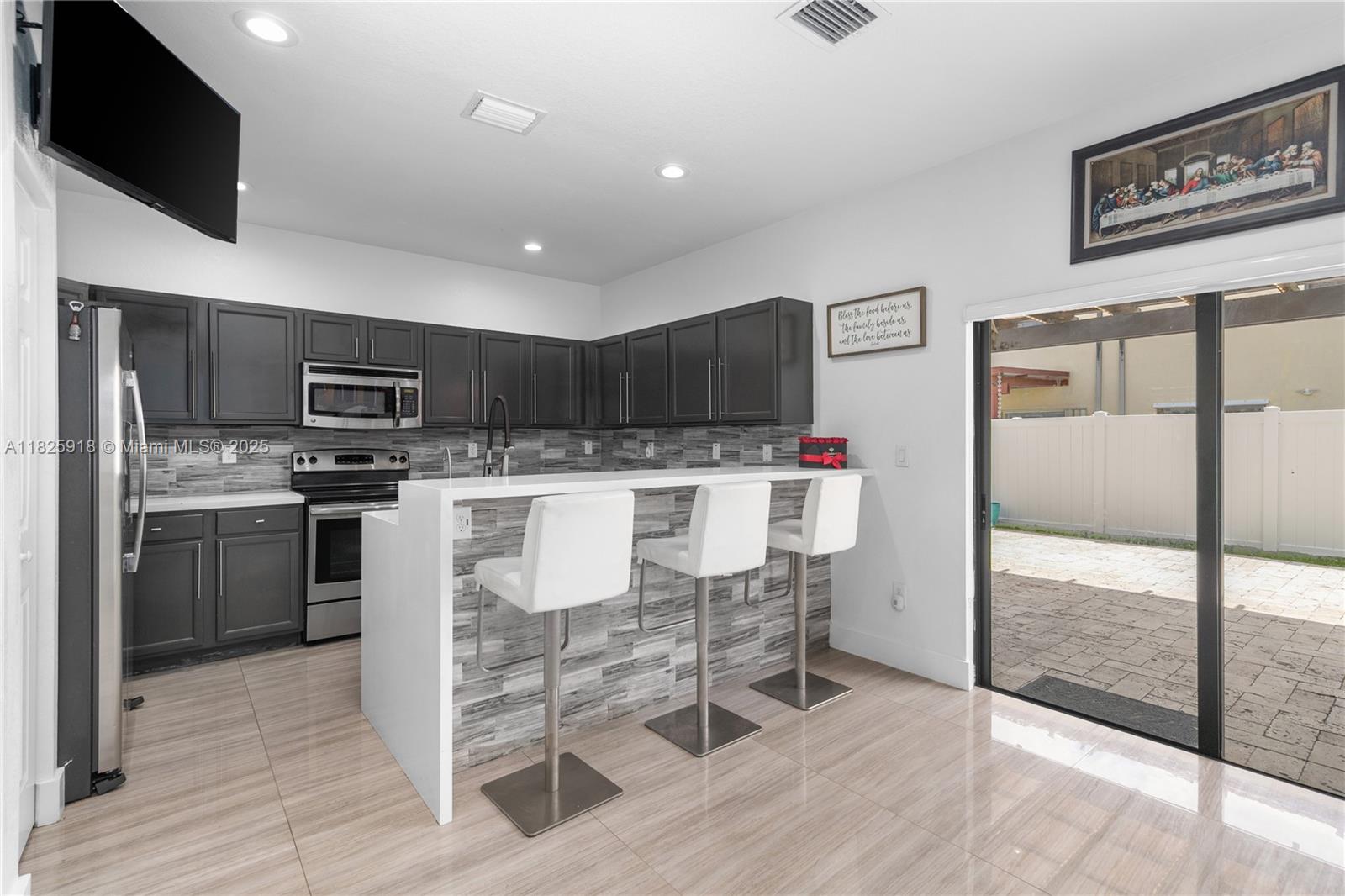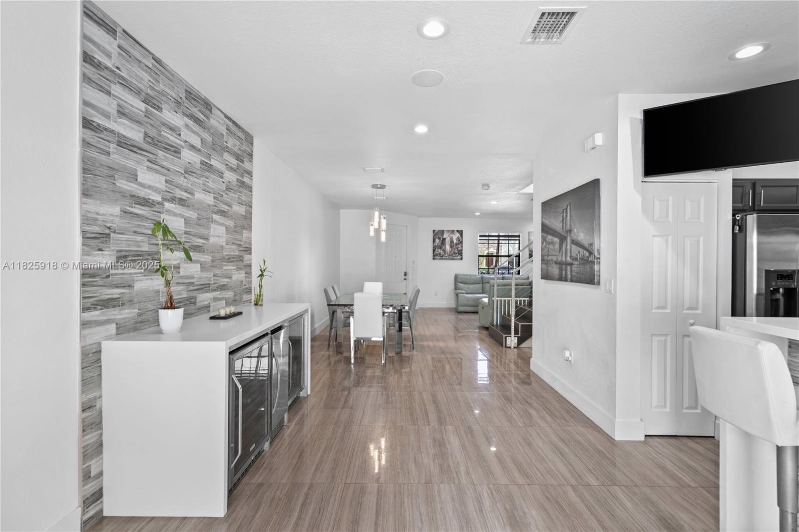 In the stunning Aragon community you will find this beautiful 3 bedroom 2 1/2 bathroom townhome that you don't want to miss. This lovely home features a modern and contemporary design throughout with an open floor plan perfect for entertaining. Equipped with a beautifully designed wine bar and beverage station. The gorgeous kitchen has quartz countertops and a porcelain backsplash. When you step into the backyard area, you are welcomed by a huge pergola with travertine flooring, artificial turf and a wall mounted tv. Additionally, the house has surround sound wiring, a sound bar and SONOS sound system throughout.