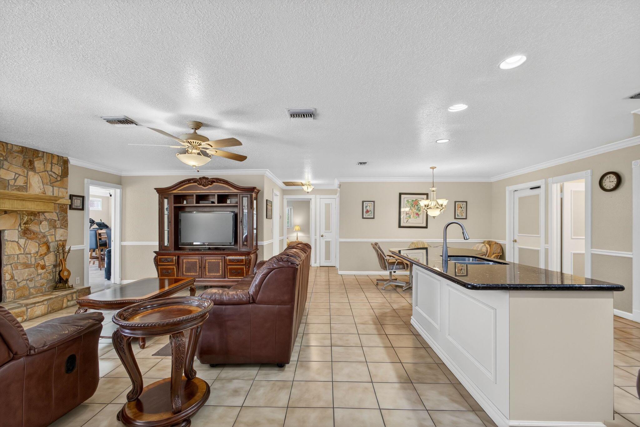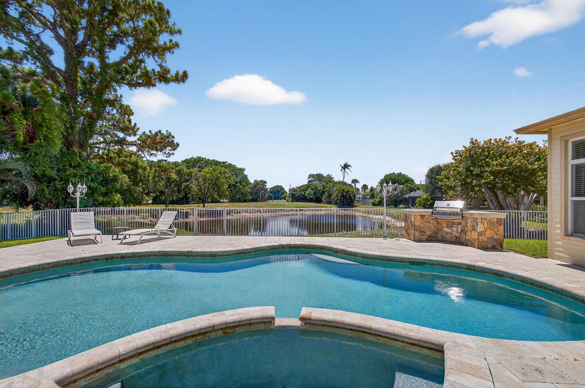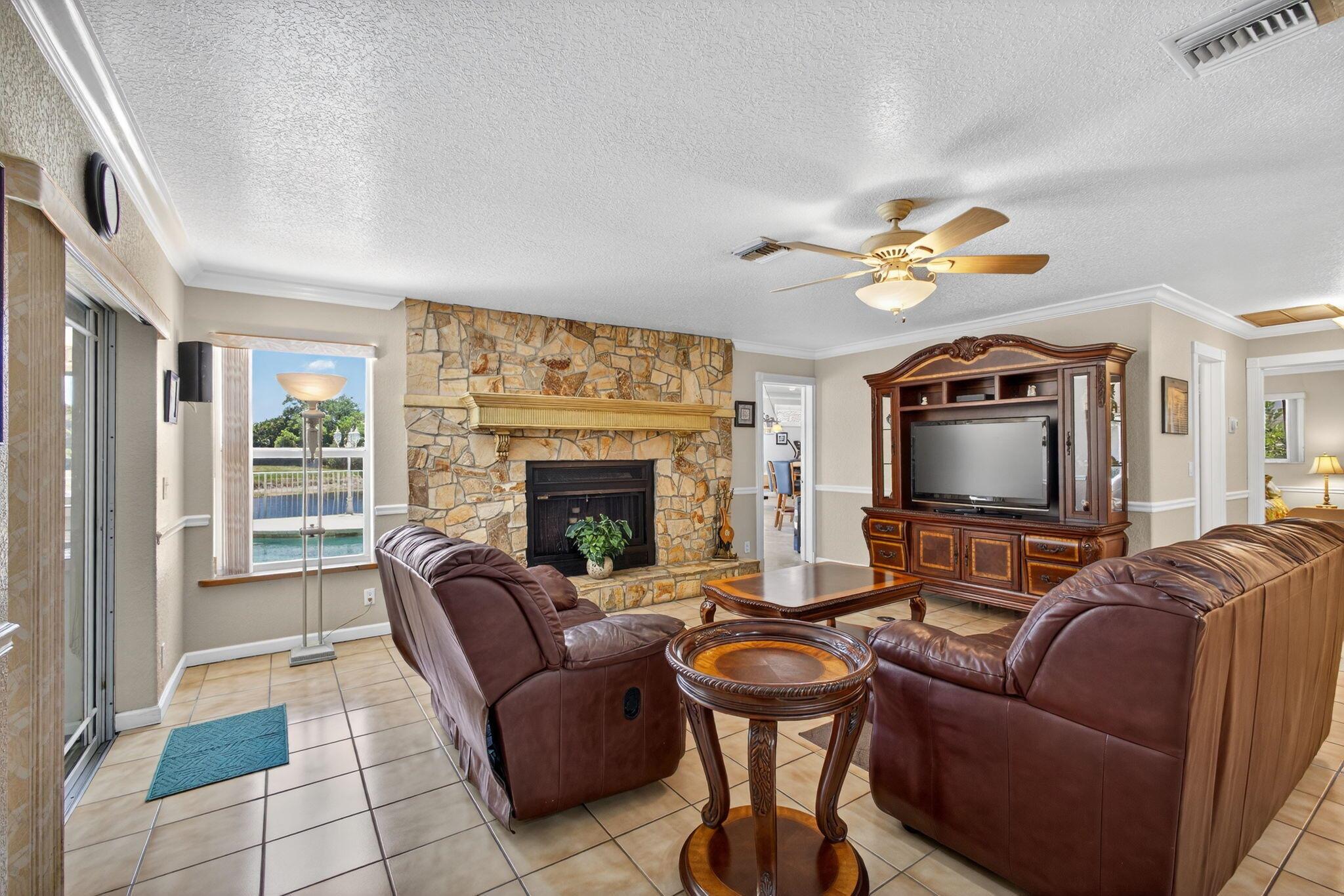 Spacious lakefront ranch home in a gated community with large, oversized rooms filled with abundant natural light The gourmet kitchen boasts granite counters and opens to a family room with a cozy fireplace. Conveniently located off the family room is a massive bonus/great room--perfect for entertaining. Enjoy serene water views, a sparkling pool, and a custom outdoor bar perfect for gatherings. Additional features include tons of large closets throughout and a circular driveway for added curb appeal. The ROOF was re-done in 2022 and the home is secure with impact windows and doors. This home has it all--comfort with space to live and entertain plus the low HOA dues make this home a rare find! CHECK OUT THE 3D WALK THRU.