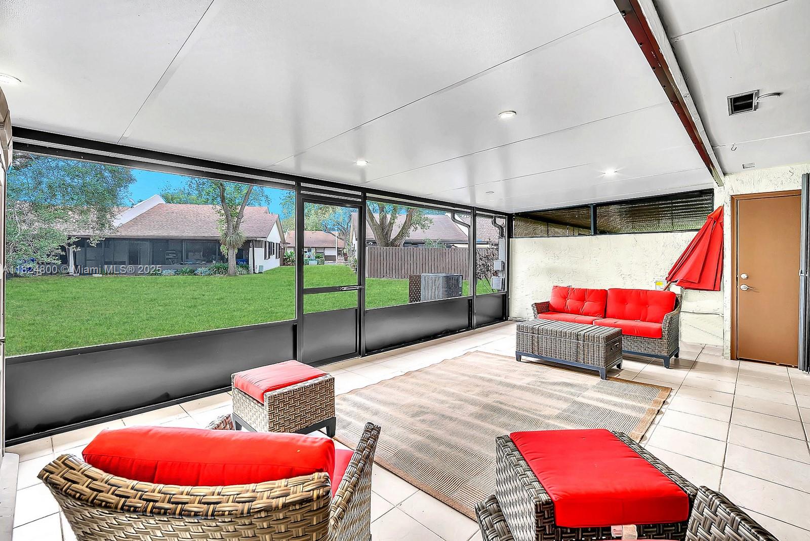 Awesome 2 bed 2 bath, one level townhome located in the East Lake community in the highly desirable Pembroke Lakes neighborhood. Adorable front patio with a front entry that leads to this sought-after villa. Offering 1,168 square feet of living area with tile throughout, beautifully updated baths, open kitchen w gorgeous ceiling, open to the living area. Spacious primary suite with a walk-in closet & second bath with a jetted tub. Entertain outdoors on your very own covered and screened huge patio w weather resistant composite decking opens the greenery and lake. Home is double protected w impact windows + accordion shutters & 3 year old roof. Community amenities include pool & tennis. Enjoy Pembroke Pines schools, close proximity to great shops, dining, Memorial West Hospital, and I-75.