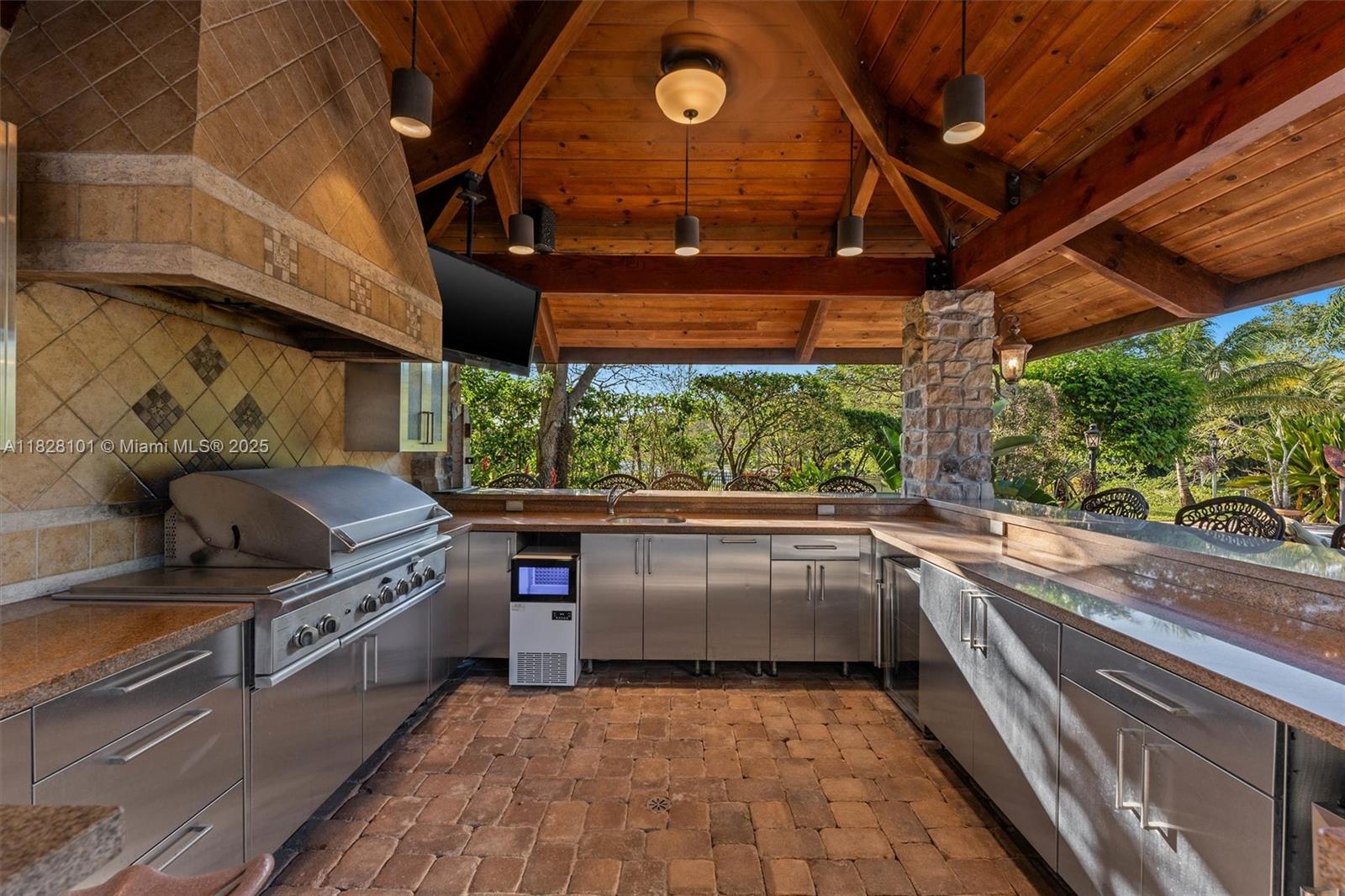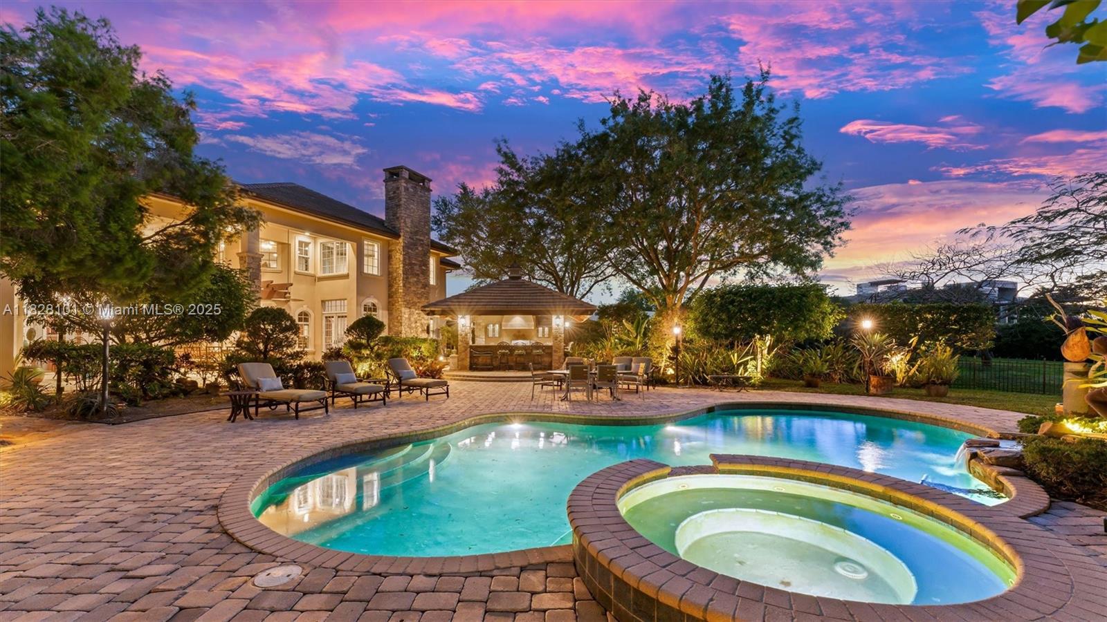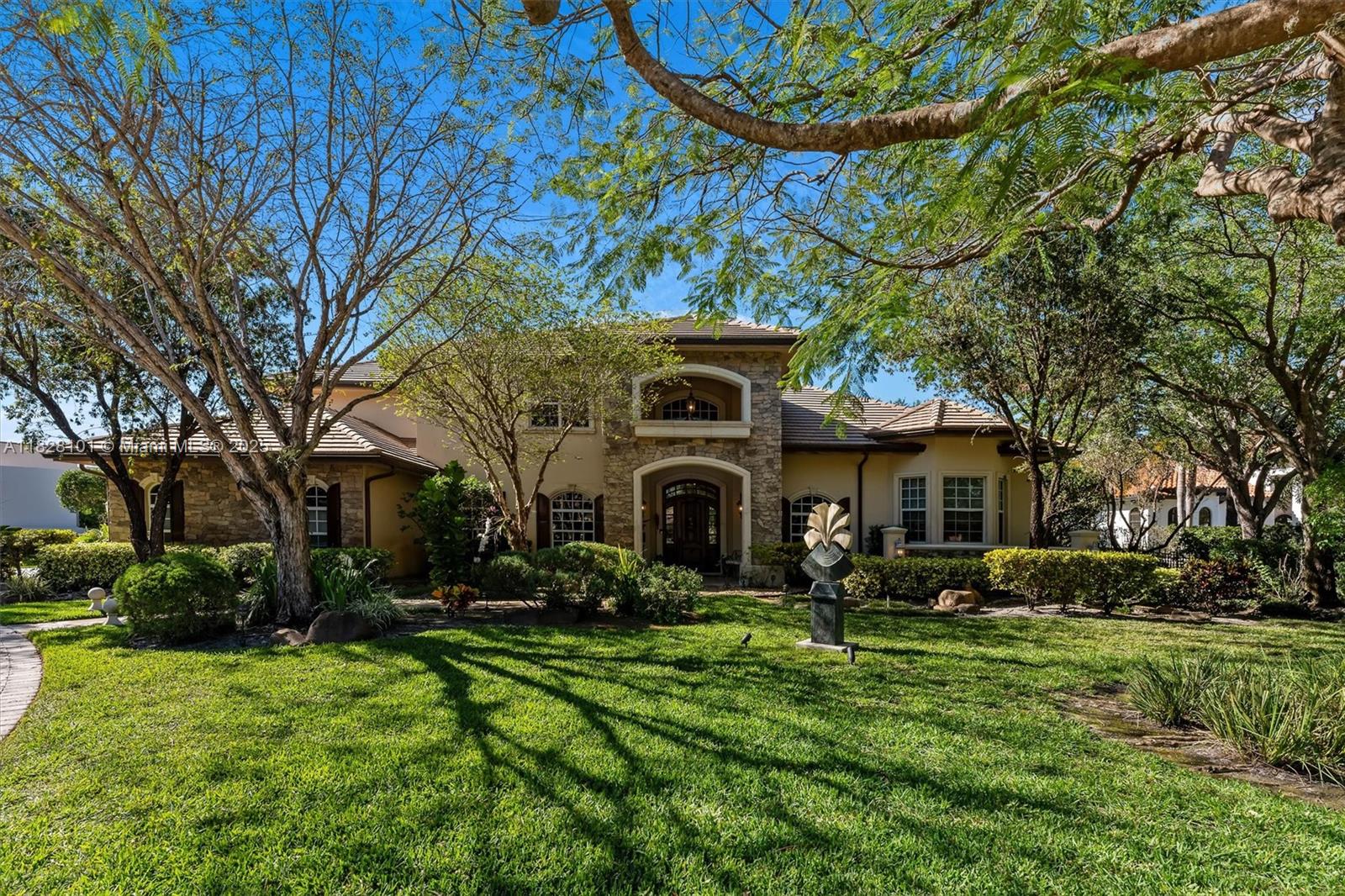 This custom French Country home on a builder’s acre with water frontage is in Davie’s secluded gated Grand Oaks Estates. Hurricane infrastructure includes whole house new 48KW generator/1,000-gal tank, impact doors and windows; also NEW AC'S and Water heater. It features: 5 ensuite BRMS; office; loft; 5.5 baths; 20’ ceilings; 2 gas/wood FirePLs; hardwood South FL Pine, Tigerwood, Marble, and Jerusalem stone floors. Chef’s kitchen and custom bistro bar with brick accents, 2 ovens, 3 wine frigs, and Thermador gas cooktop/grill. In-law suite has a private alarmed entry, kitchen, cabana bath and Murphy bed. Enjoy lush landscaping, resort-style pool with waterfall spa, full summer kitchen with a separate 250-gal tank for the BBQ, cooktop, and fireplaces. Local equestrian availability.
