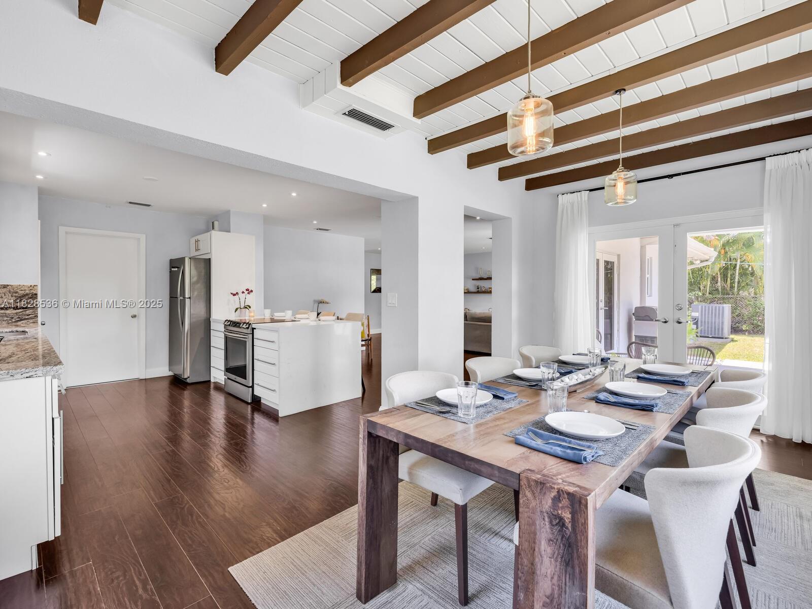 Welcome to The Island Pine Hideaway! Live large with three bedrooms, two full baths, ~1,800 SF of spacious interiors, and a massive two-car garage on a large 8,305 SF lot, just three blocks to Downtown Miami Shores. Enter through a welcoming foyer into the smartly-updated open-flow living with eat-in peninsula bar kitchen and wood-beamed ceiling dining room, opening through French doors to the covered entertainment patio and sprawling gardens. All bedrooms are tucked away in the south wing, including the main ensuite retreat with walk-in closet and spa-like bath, plus two bright guest rooms. Great features: impact windows-doors, recessed lighting, great entertainment and relaxation areas inside and out, plus room for a pool. All in a fantastic non-flood zone location on a quiet cul-de-sac!