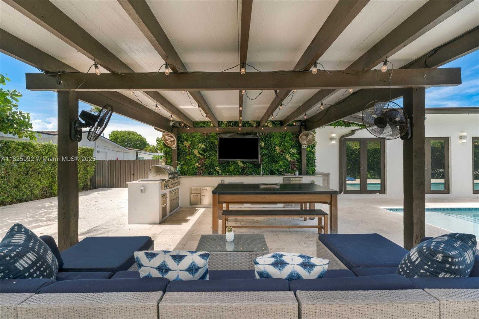 Located in the desirable gated community of Highland Lakes, this beautifully renovated 5BD/4BA home spans 3,000+ SF and offers the perfect blend of modern luxury and thoughtful functionality. Expanded and fully remodeled in 2013, the home features impact windows, new roof, electric, plumbing, plus new A/Cs (2021). Enjoy indoor-outdoor living with an oversized pool, gas + solar heaters, outdoor kitchen, covered patio & pet-friendly turf yard. The custom kitchen includes a dining built-in with wine cooler, while the spacious spa-like primary suite offers a luxurious two-person shower & massive walk-in closet. Other highlights: wellness space with gym, sauna, cold plunge, maid’s quarters, security system, water softener & 2 built-in sheds. Minutes from A-rated schools, Aventura Mall, & I-95.