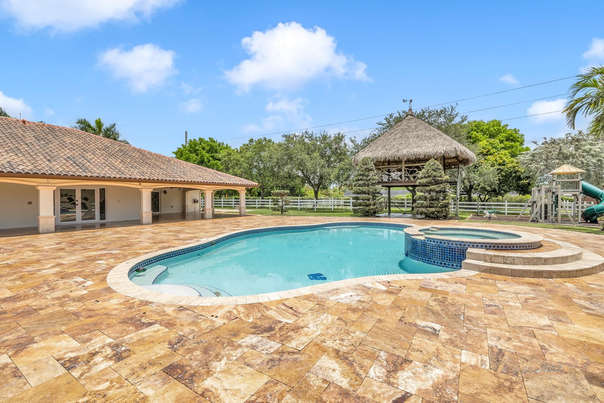 Welcome to this ultra-luxury estate in prestigious Southwest Ranches, set on 2.03 meticulously maintained acres. Fully renovated with no expense spared, this exceptional property is a true masterpiece. The estate includes 8 horse stables & a separate 4,000 sqft garage featuring a private upstairs office with A/C, ideal for conversion into a guest house and another 1,000 sqft garage/storage area. The main residence spans 4,000 sq ft under air and showcases 5 bedrooms, 4 bathrooms, impact windows, a redesigned private gated driveway, and a laundry/utility/mudroom for added functionality. Step outside to your private resort-style oasis, complete with a large pool, Brazilian teak wood ceilings, a summer kitchen, a pool house, and a stunning two-story tiki hut with electric and lighting.
