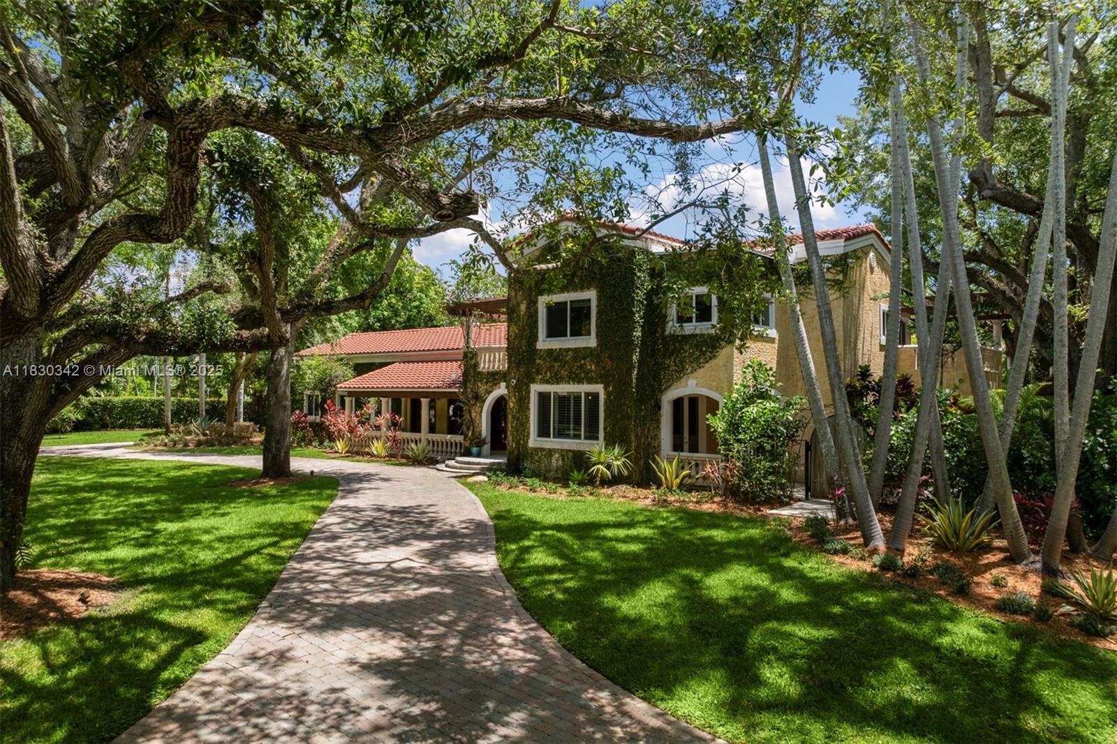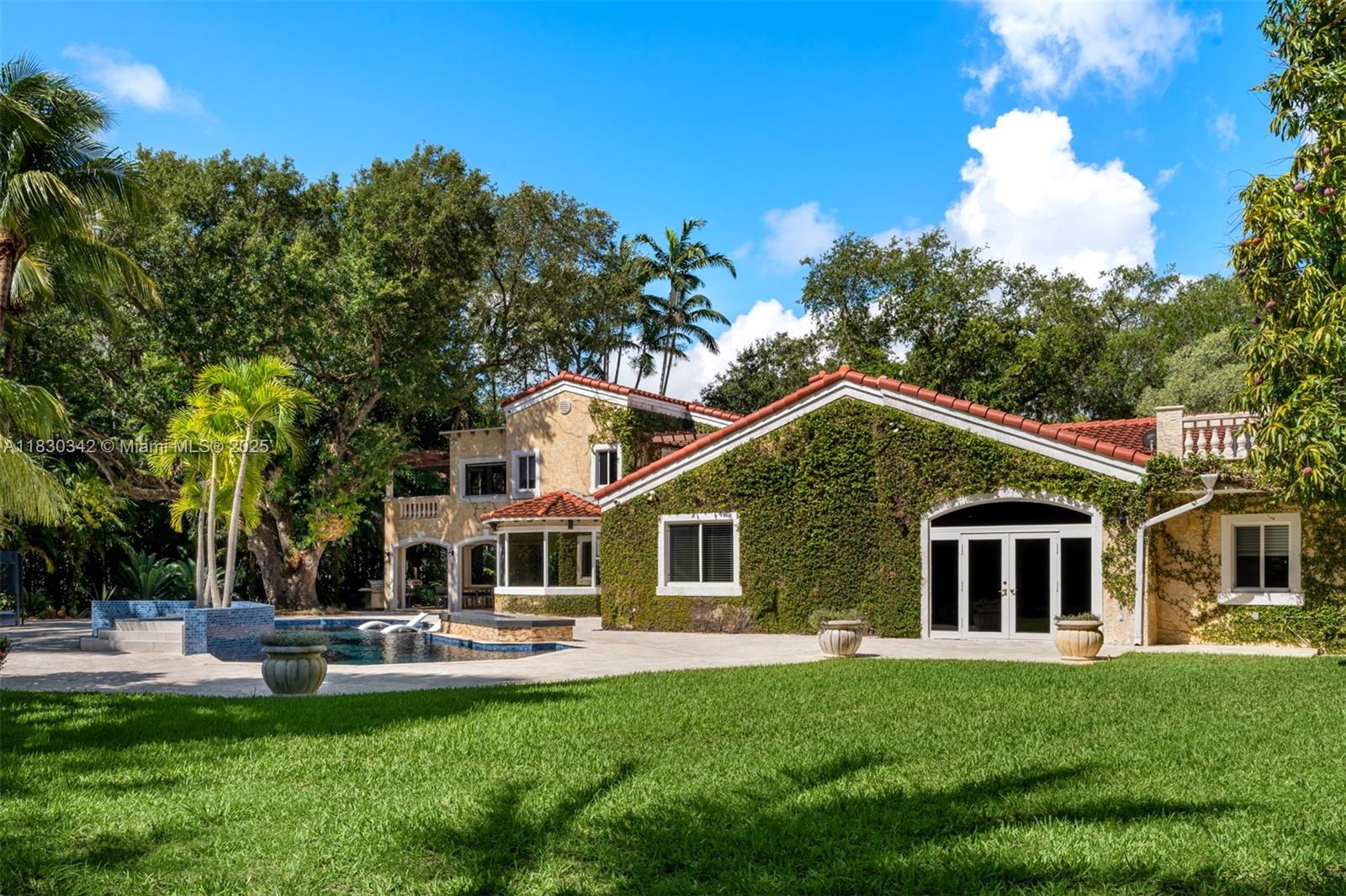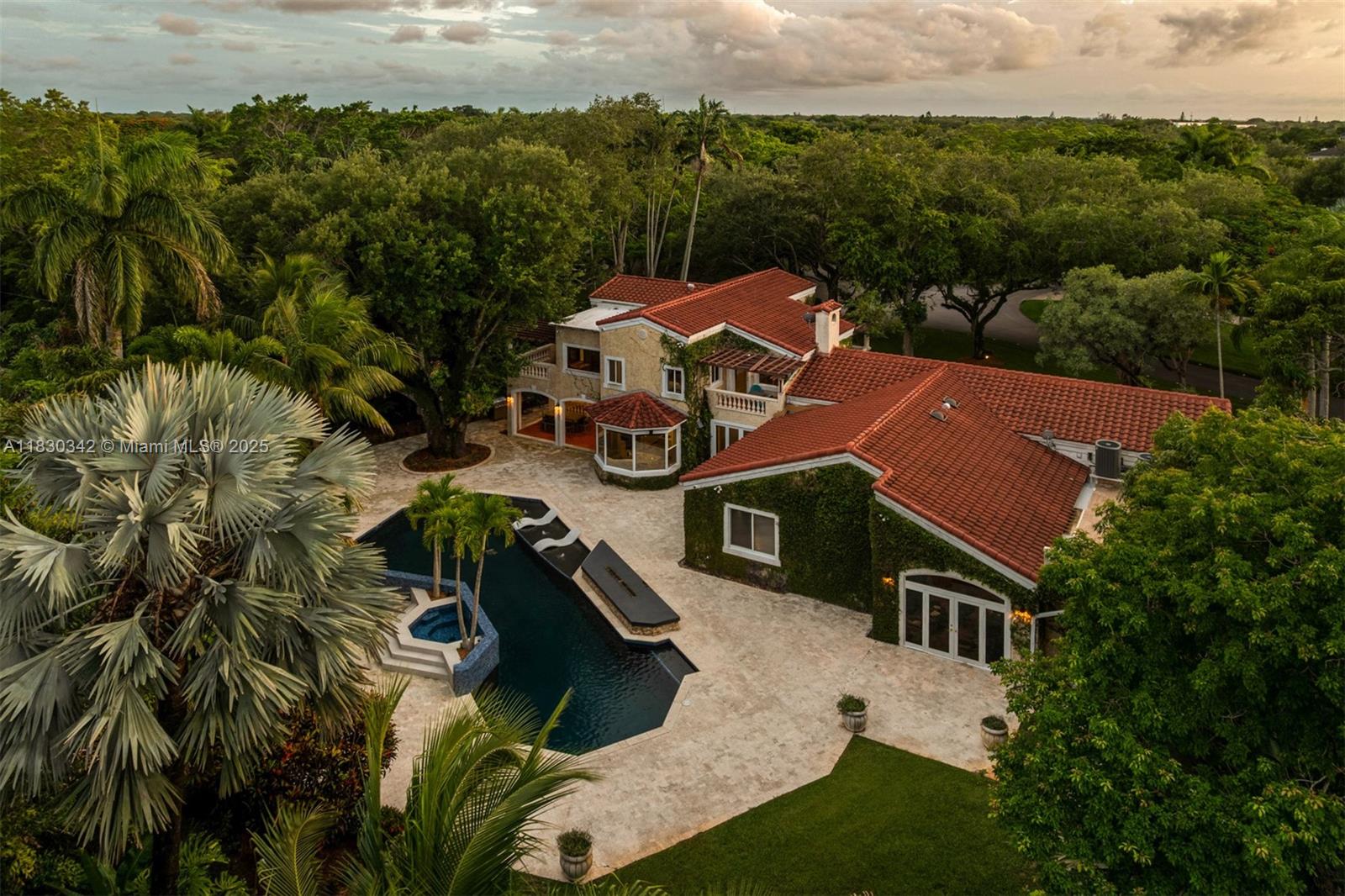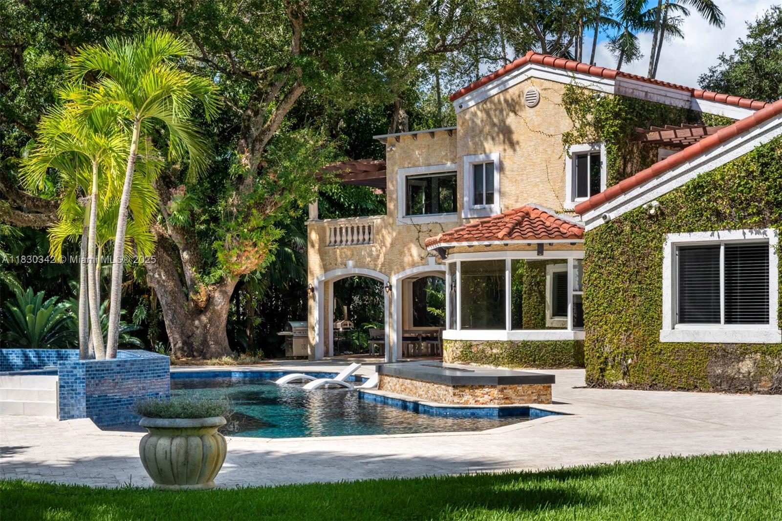 Stunning Mediterranean Revival home with ivy-covered facade on a tree-lined street in Pinecrest. This romantic estate features balconies and porches with balustrades, 6 beds, 5.5 baths including a service room. Renovated with porcelain floors, impact windows, resurfaced pool, and new clay barrel tile roof. The kitchen offers marble counters, wood cabinetry, Wolf/Subzero appliances, and a wine cellar. Breakfast area with bay window overlooks the pool/spa, lush palms, and fire pit. Upstairs primary suite has a dual shower, soaking tub, and walk-in closet. Formal living room with wet bar and wood-burning fireplace.
