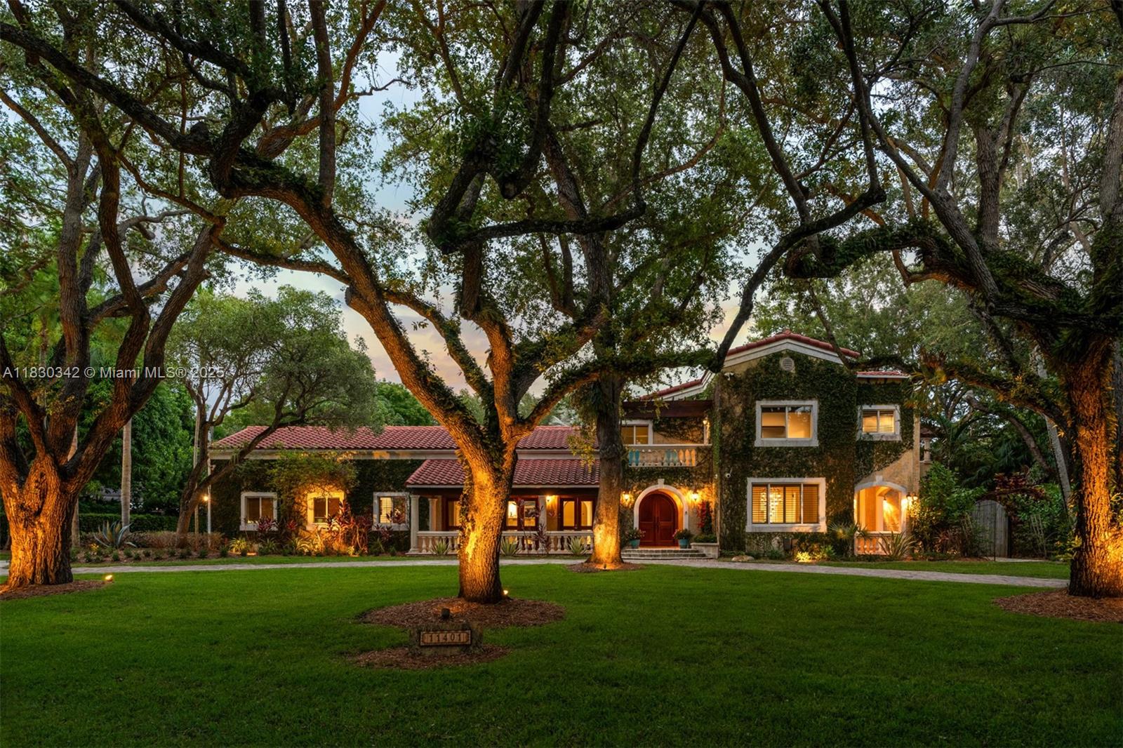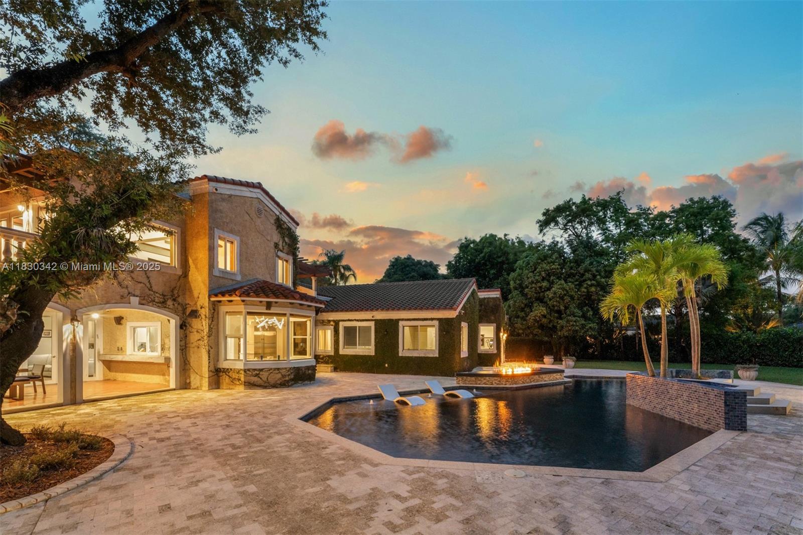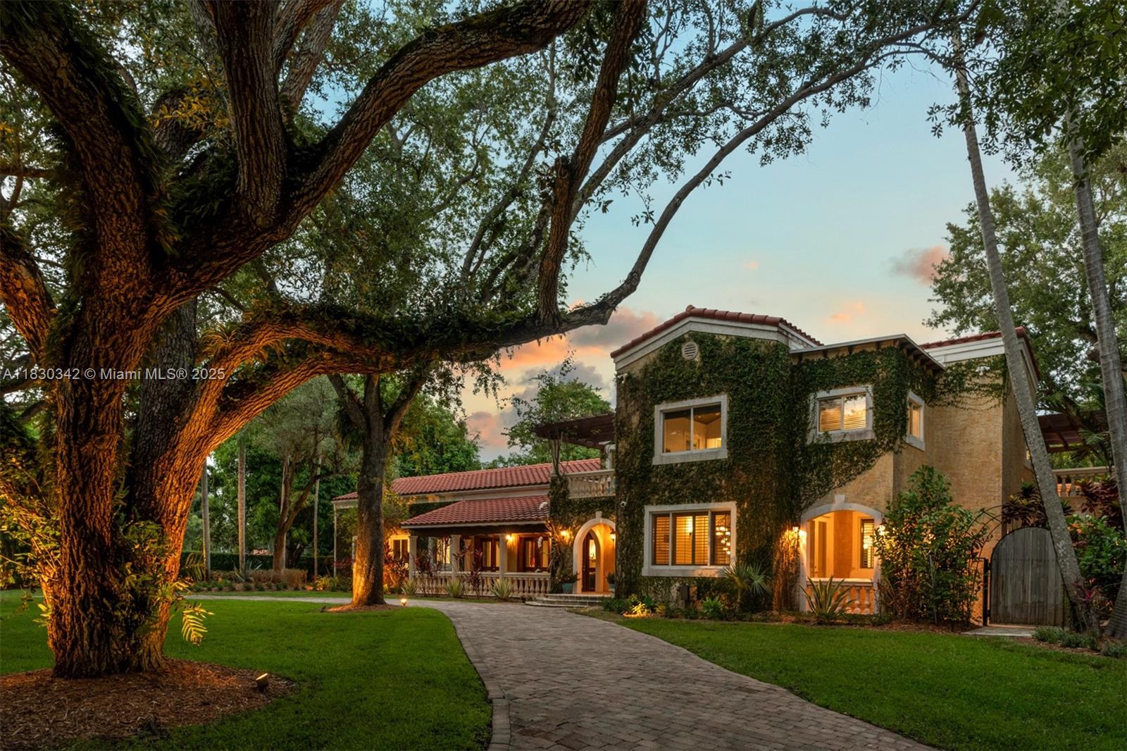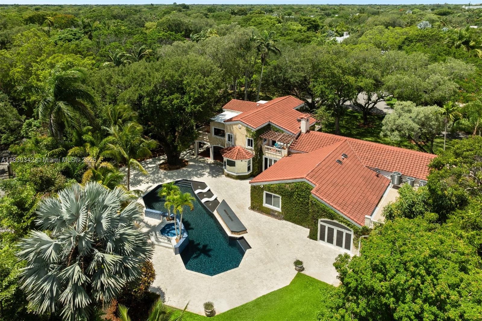 Stunning Mediterranean Revival home with ivy-covered facade on a tree-lined street in Pinecrest. This romantic estate features balconies and porches with balustrades, 6 beds, 5.5 baths including a service room. Renovated with porcelain floors, impact windows, resurfaced pool, and new clay barrel tile roof. The kitchen offers marble counters, wood cabinetry, Wolf/Subzero appliances, and a wine cellar. Breakfast area with bay window overlooks the pool/spa, lush palms, and fire pit. Upstairs primary suite has a dual shower, soaking tub, and walk-in closet. Formal living room with wet bar and wood-burning fireplace.