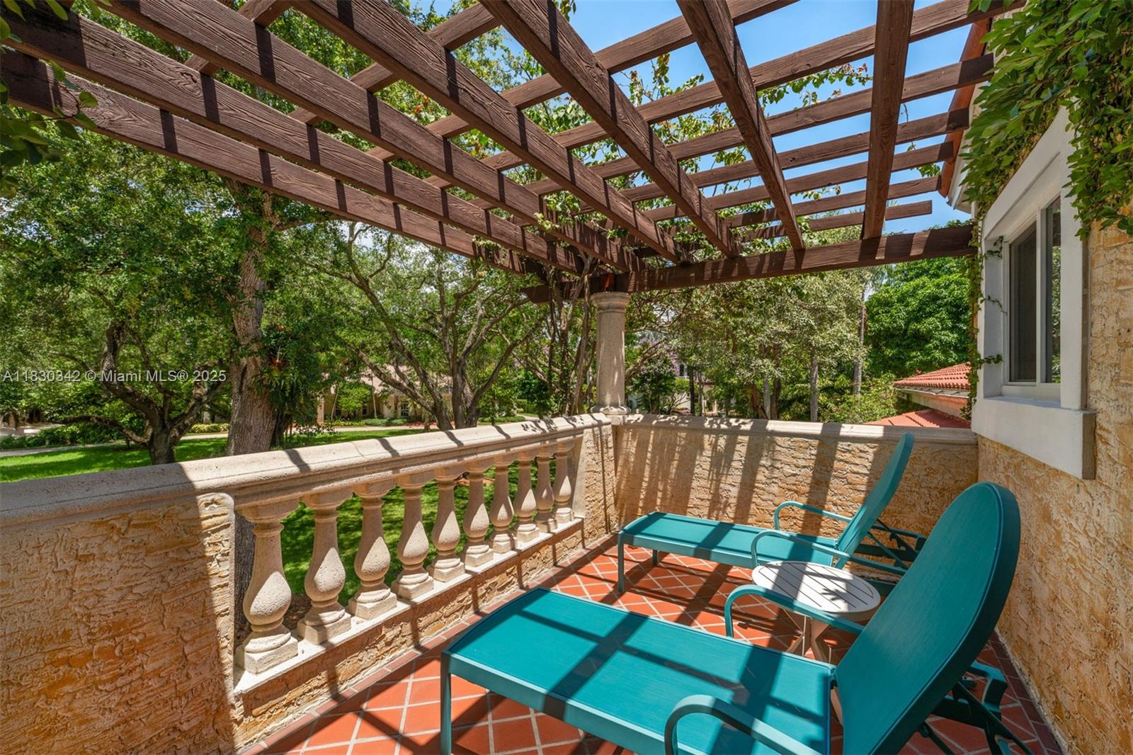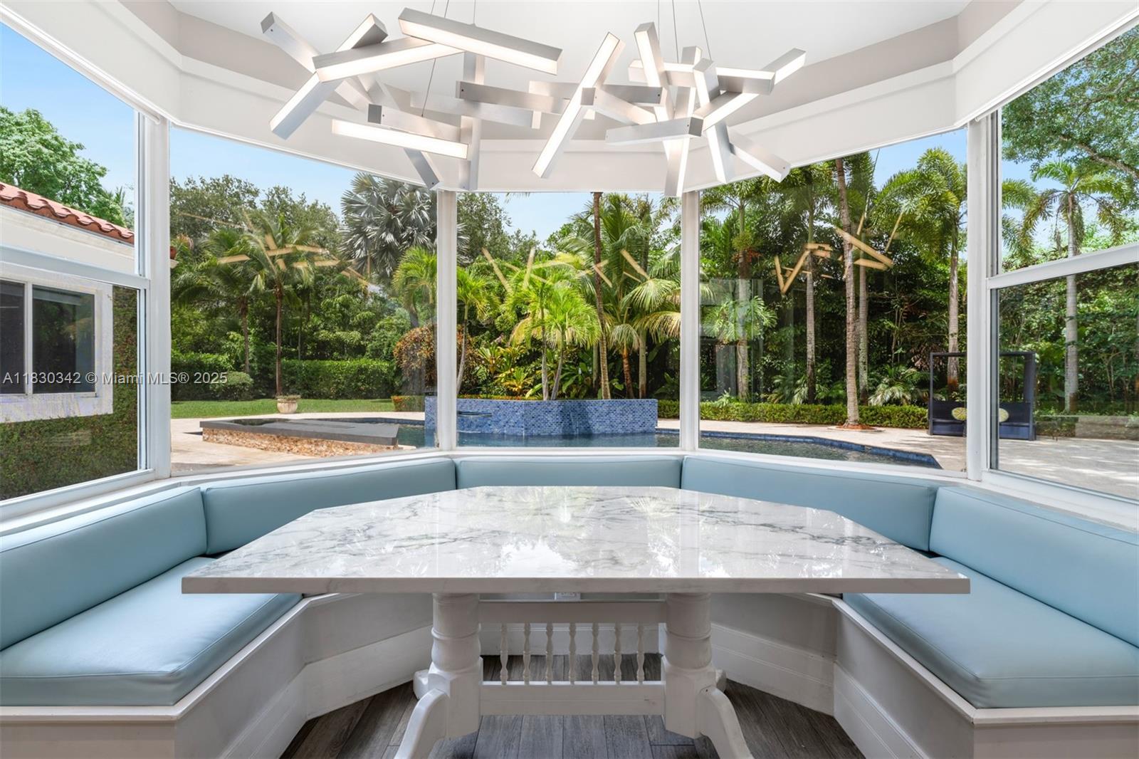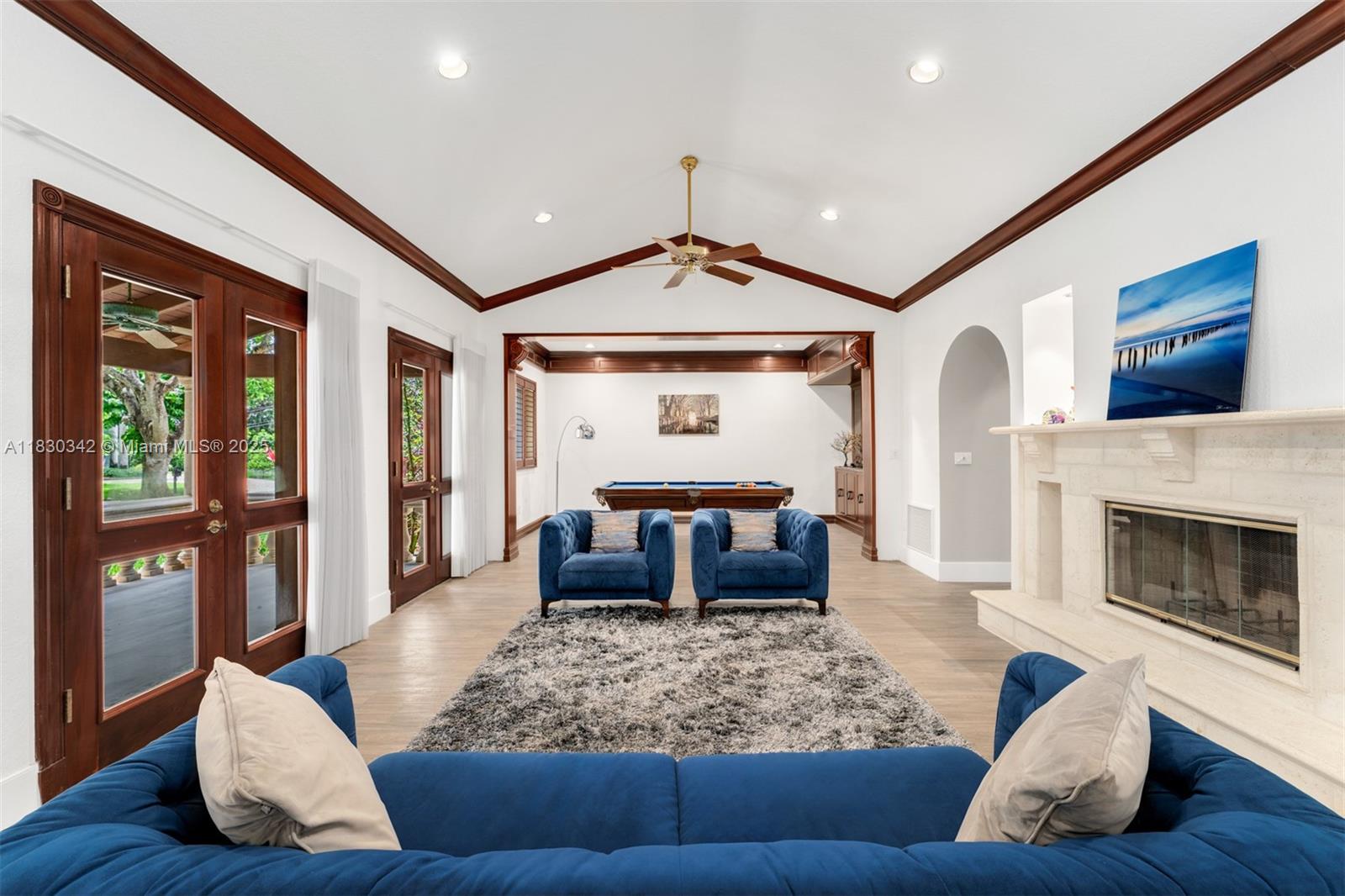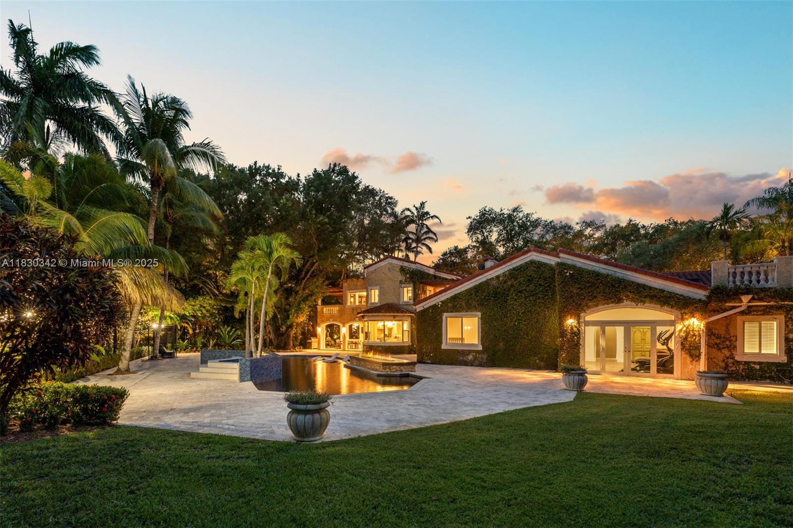 Stunning Mediterranean Revival home with ivy-covered facade on a tree-lined street in Pinecrest. This romantic estate features balconies and porches with balustrades, 6 beds, 5.5 baths including a service room. Renovated with porcelain floors, impact windows, resurfaced pool, and new clay barrel tile roof. The kitchen offers marble counters, wood cabinetry, Wolf/Subzero appliances, and a wine cellar. Breakfast area with bay window overlooks the pool/spa, lush palms, and fire pit. Upstairs primary suite has a dual shower, soaking tub, and walk-in closet. Formal living room with wet bar and wood-burning fireplace.