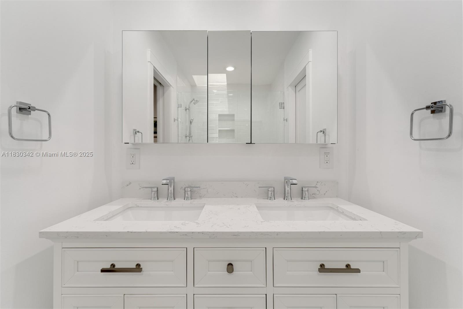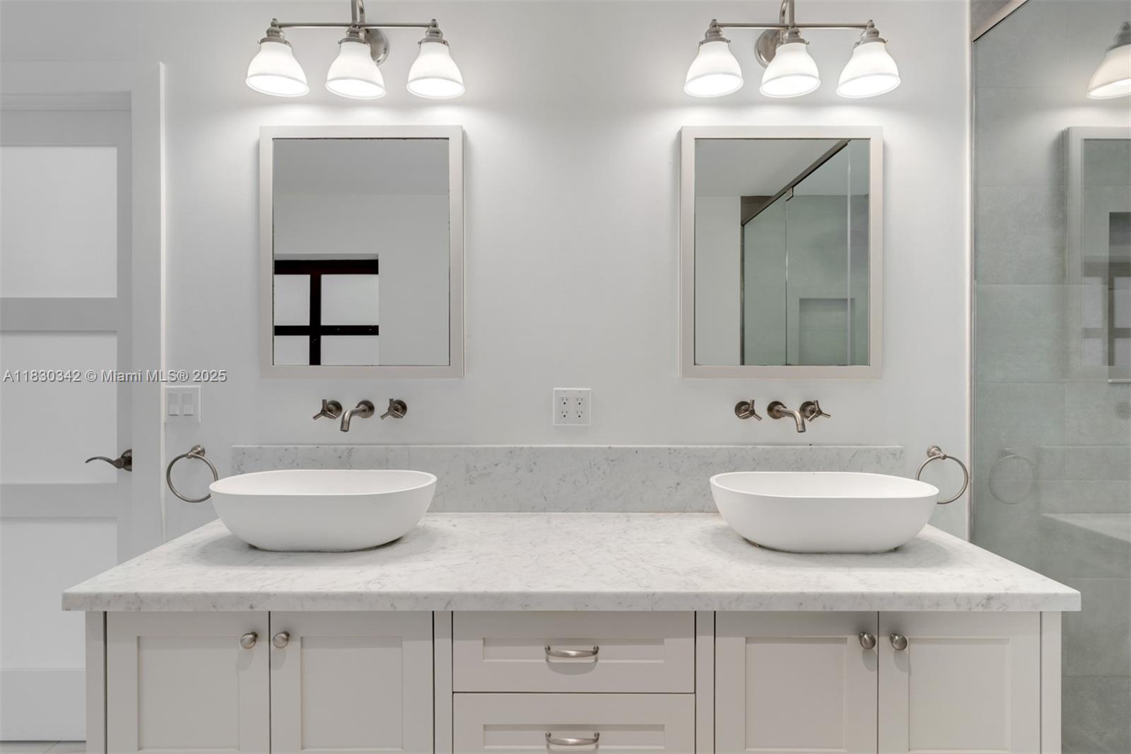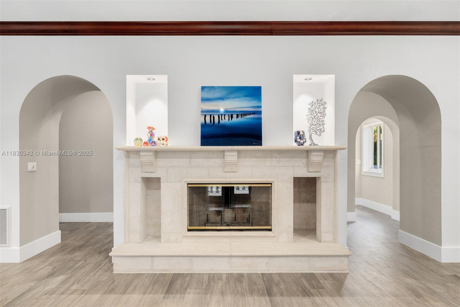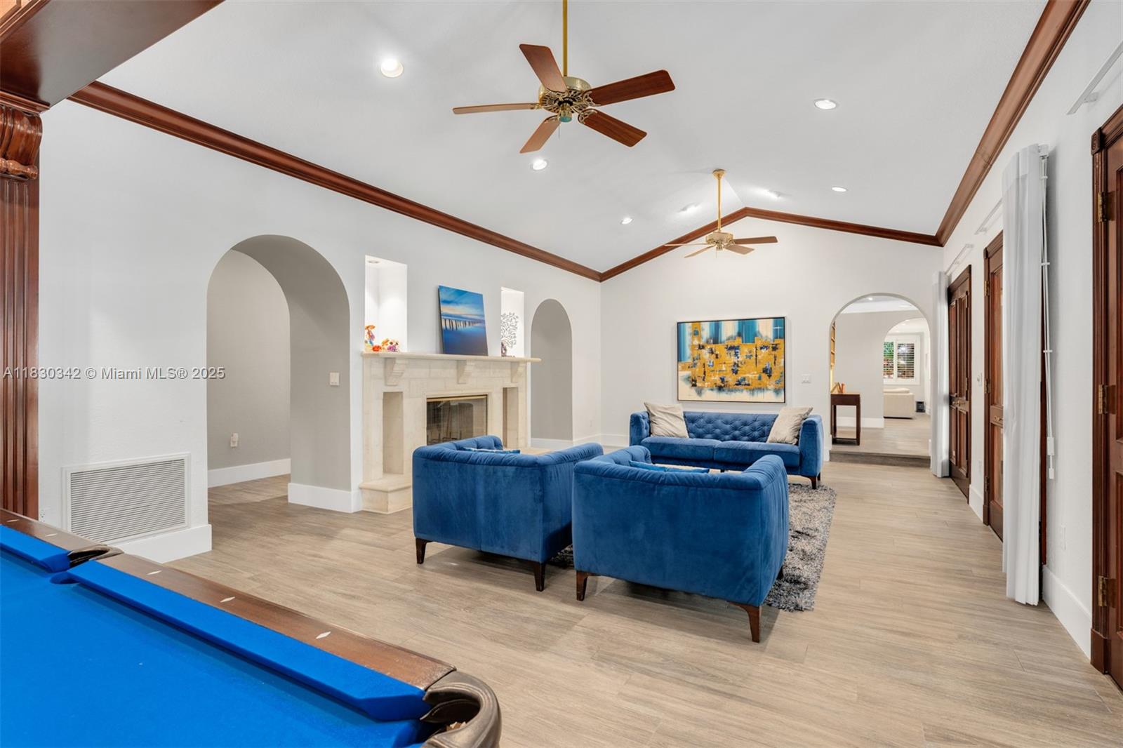 Stunning Mediterranean Revival home with ivy-covered facade on a tree-lined street in Pinecrest. This romantic estate features balconies and porches with balustrades, 6 beds, 5.5 baths including a service room. Renovated with porcelain floors, impact windows, resurfaced pool, and new clay barrel tile roof. The kitchen offers marble counters, wood cabinetry, Wolf/Subzero appliances, and a wine cellar. Breakfast area with bay window overlooks the pool/spa, lush palms, and fire pit. Upstairs primary suite has a dual shower, soaking tub, and walk-in closet. Formal living room with wet bar and wood-burning fireplace.