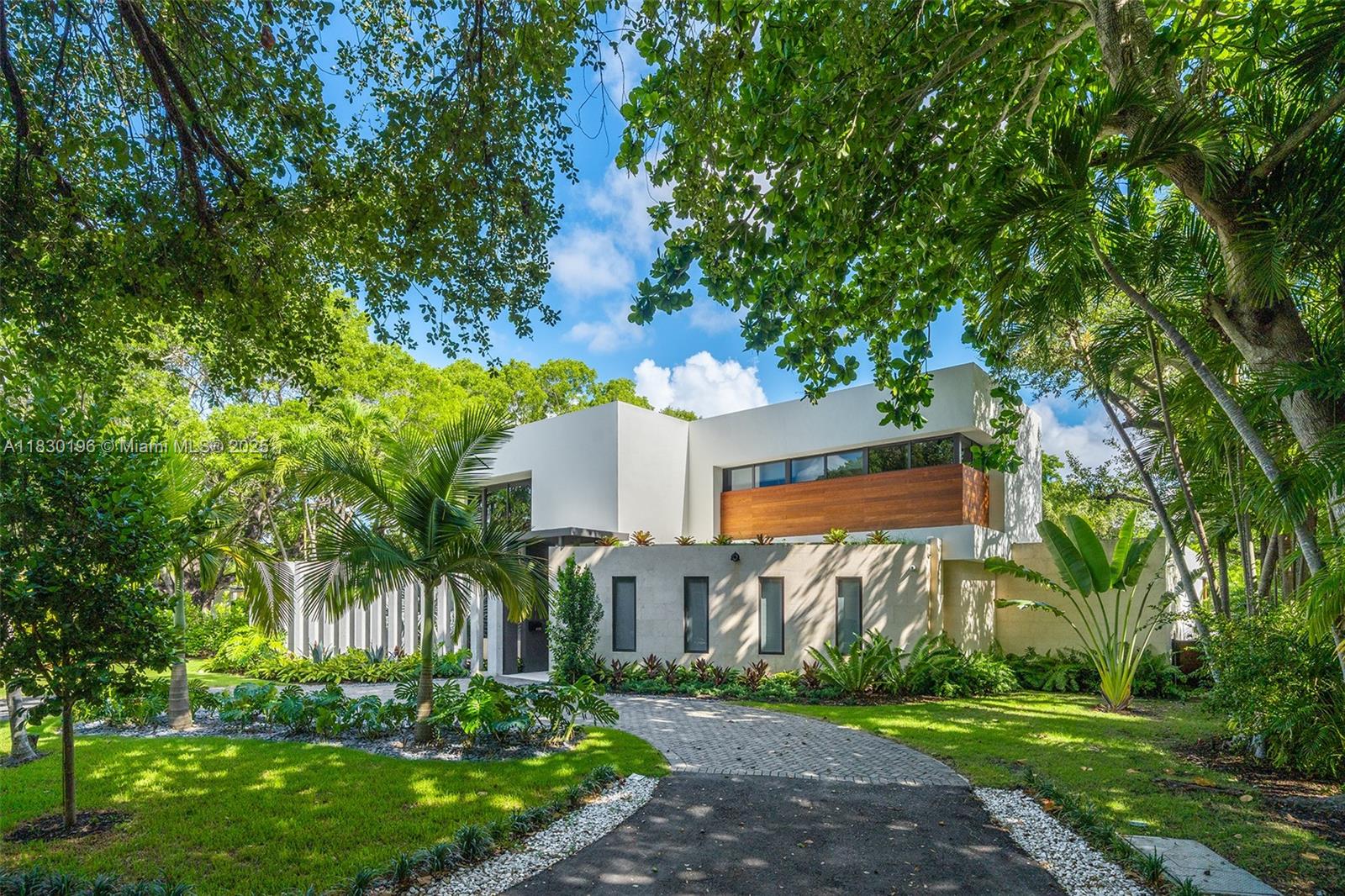 This luxurious 5-bedroom, 6-bath Florida Modern residence boasts over 5,500 square feet of elegantly designed indoor and outdoor living space, nestled among lush tropical landscaping for ultimate privacy and tranquility. Floor-to-ceiling windows bathe the interiors in natural light, highlighting an open-concept layout that effortlessly blends indoor sophistication with outdoor serenity—ideal for entertaining. A dramatic dining area with soaring 22-foot ceilings and a striking floating staircase sets the tone for the home’s impressive design. The impeccably curated Armazem kitchen—with a custom wine cellar—flows into a spacious great room that opens to a covered poolside terrace featuring a fully equipped outdoor kitchen with an icemaker.