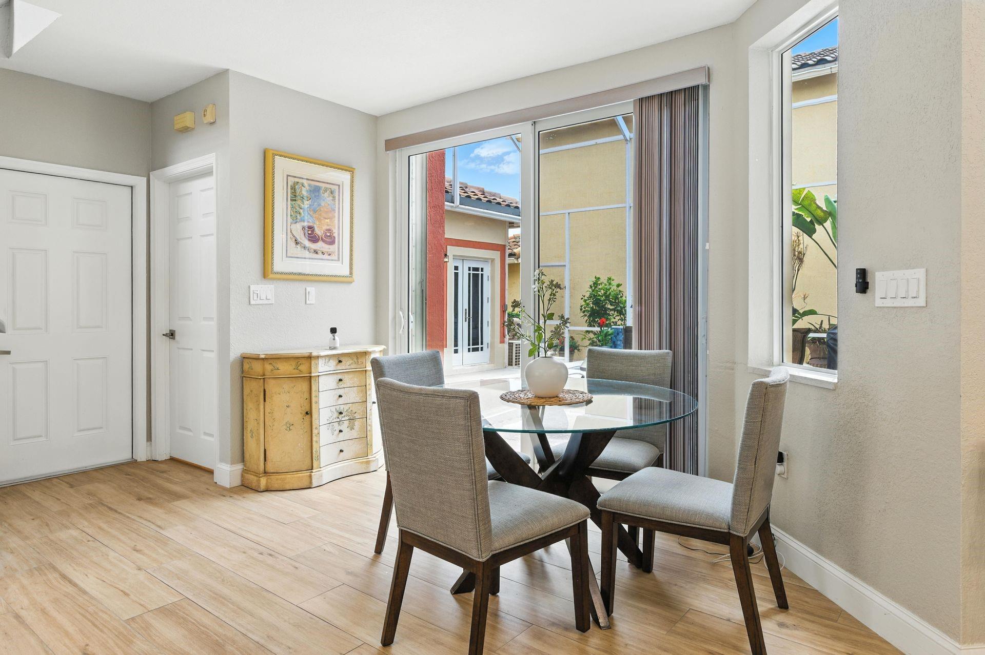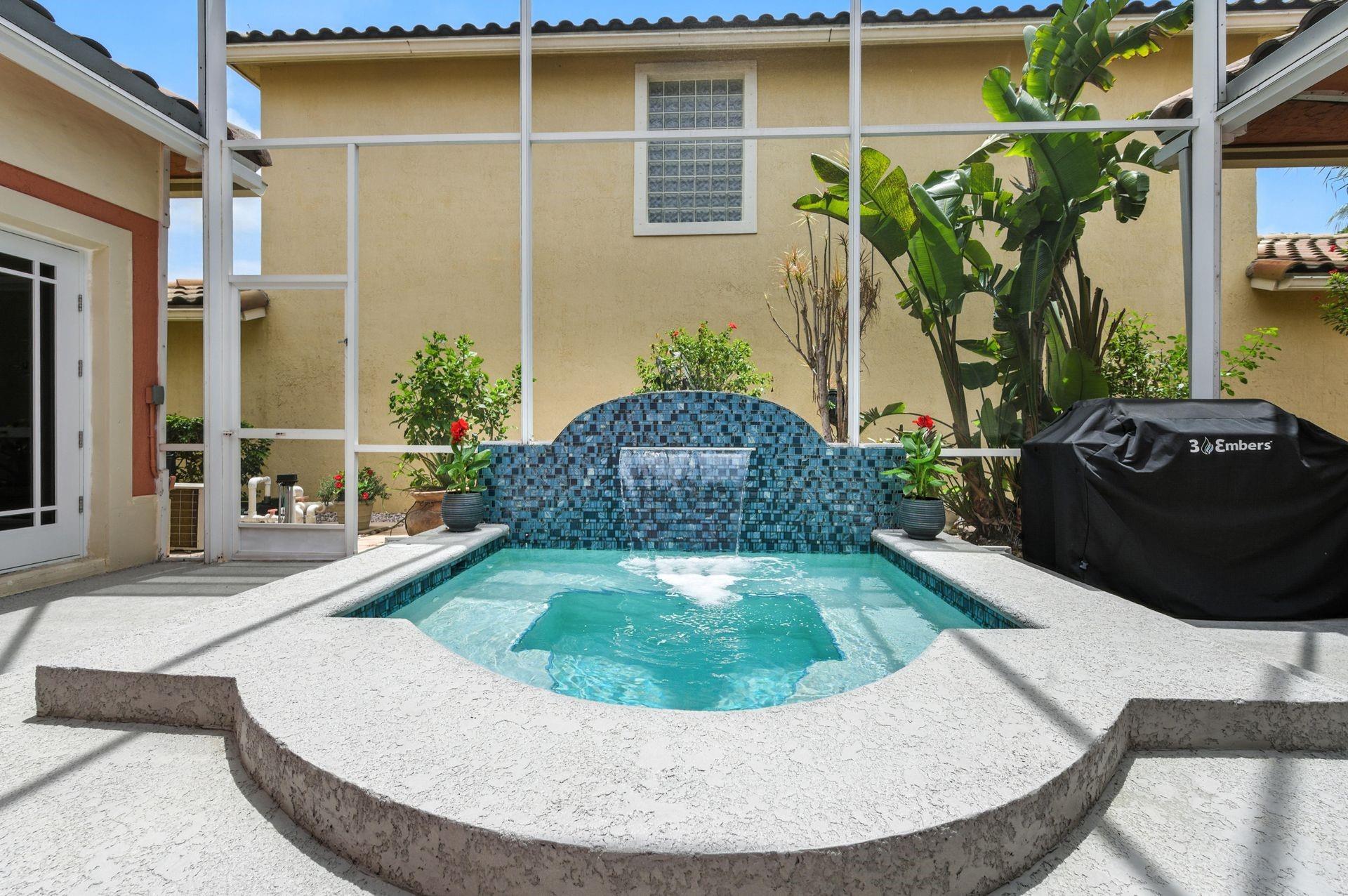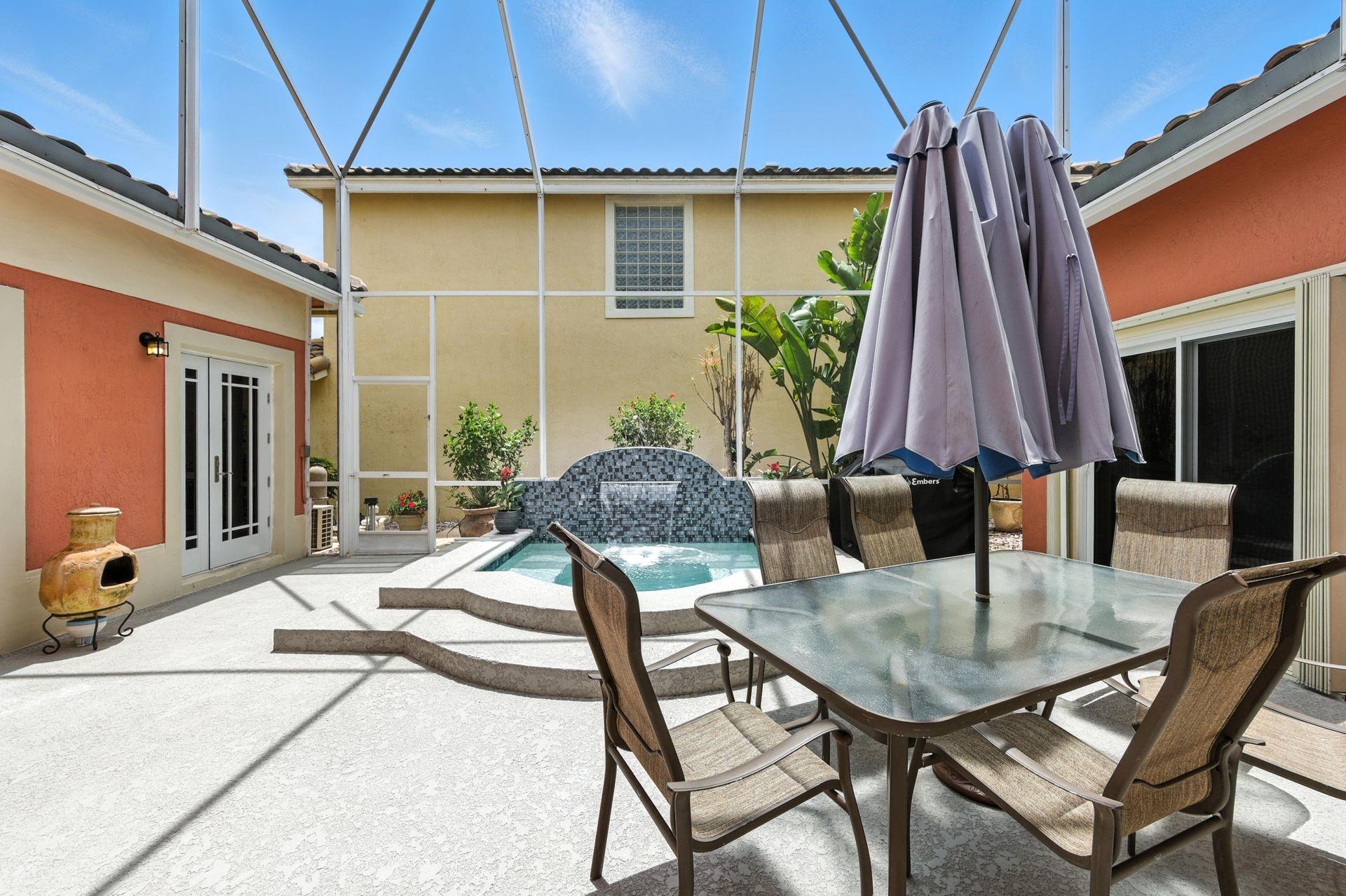 Discover this beautifully updated courtyard home offering complete privacy. The main house features 3 bedrooms, 2.5 baths, with a downstairs primary suite. A separate attached suite provides an additional bedroom and bath—perfect for guests or in-laws. Enjoy a stunning open kitchen, renovated bathrooms, and elegant tile flooring throughout. Impact windows/doors and a newer roof provide peace of mind. The courtyard boasts generous entertaining space with a plunge pool and tranquil water feature.
