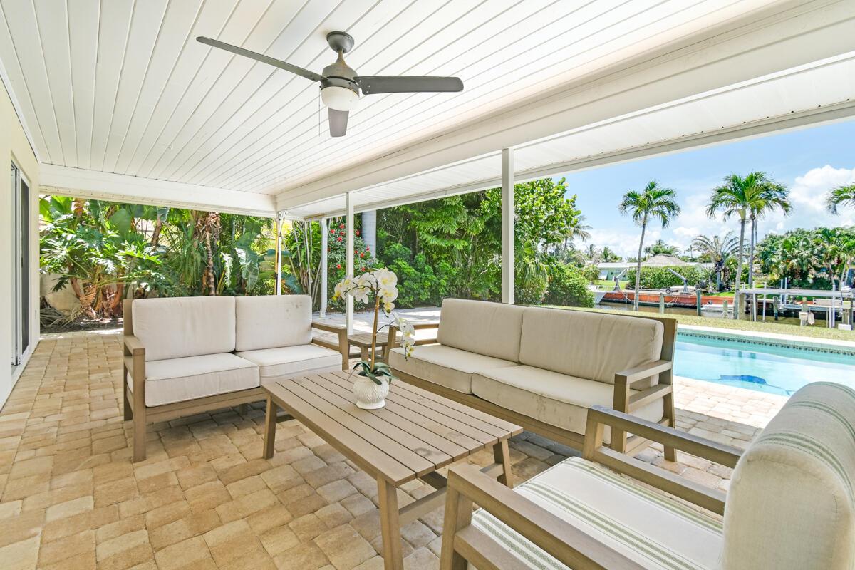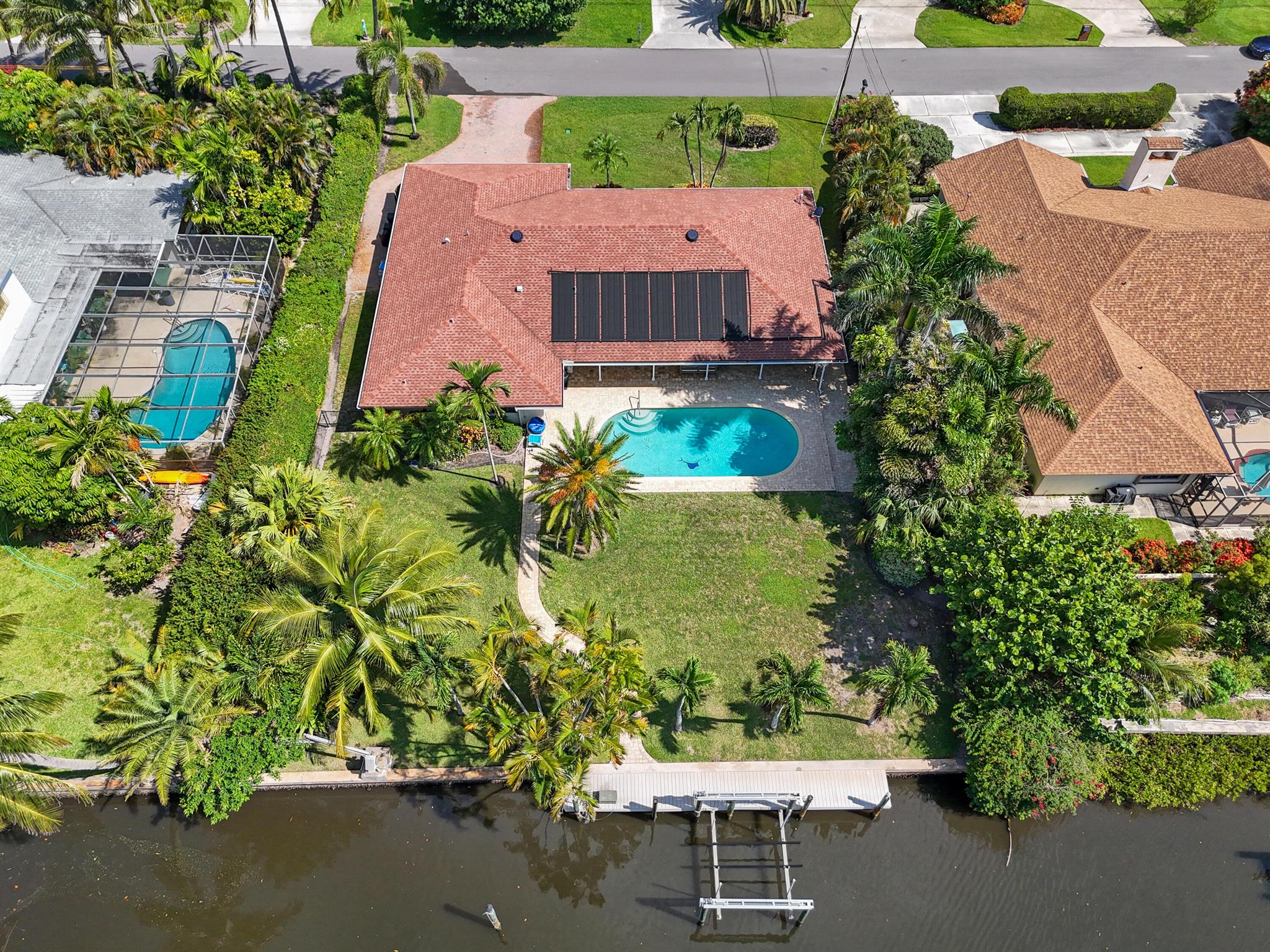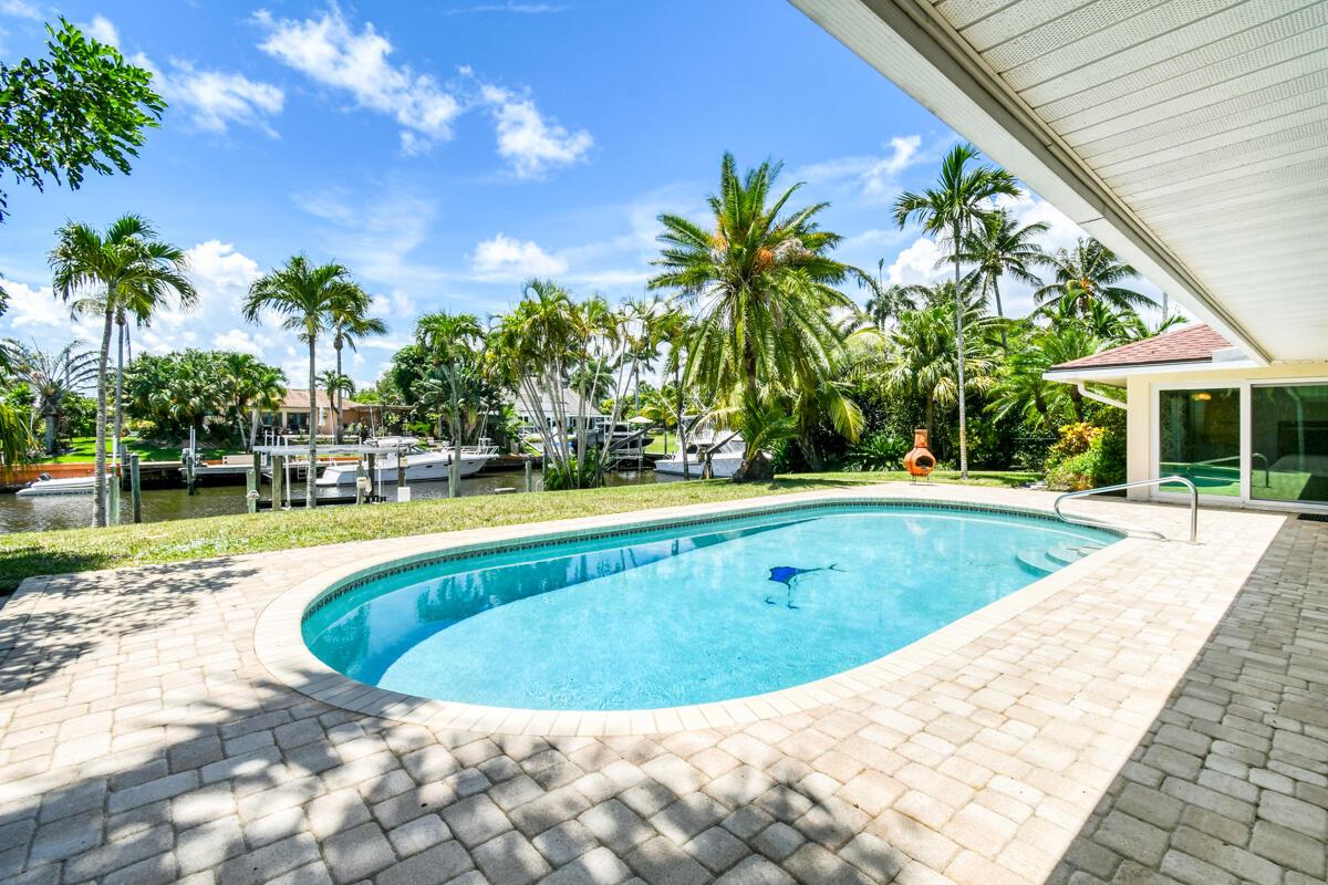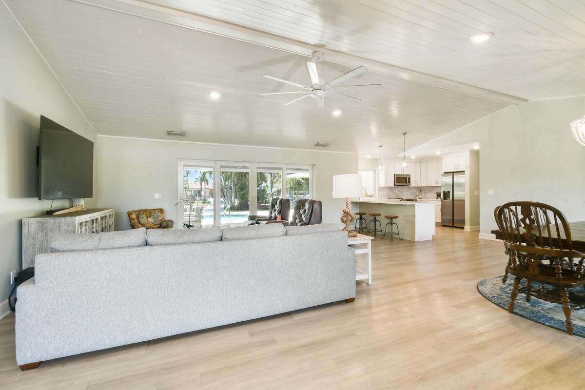 Coastal Waterfront Retreat with Southern Exposure. Welcome to this beautifully renovated coastal-style waterfront home offering the ultimate South Florida lifestyle. Situated on a spacious .32-acre lot with 100 feet of waterfront and no fixed bridges, this boater's paradise includes a 14,000 lb boat lift, seawall, and direct ocean access. Enjoy sun all day with prime southern exposure, perfect for relaxing poolside or entertaining in the expansive covered outdoor living space. The fenced backyard features a sparkling pool and lush, manicured landscaping for added privacy and charm. Inside, the light and bright open floor plan features volume shiplap ceilings, split bedroom layout, and impact windows throughout.
