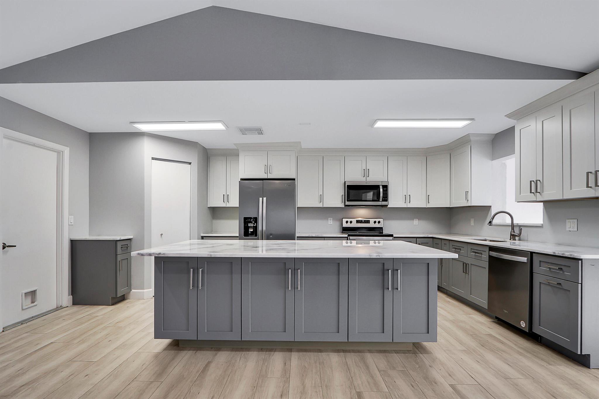 Fully renovated 4BR/2BA CBS home in central Jupiter. All-new electrical & plumbing, wood-look ceramic tile floors, exposed wood beams. The open kitchen with large island, quartz counters & new stainless appliances flows nicely to living/dining areas. Split plan; light-filled primary suite, features walk-in closet & private patio access. Fully fenced yard & an oversized 2-car garage. Deeded membership to nearby community pool & tennis courts conveys. Move-in ready, all sizes approx.