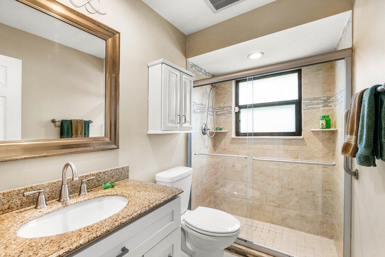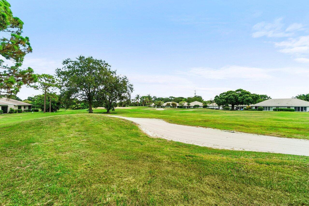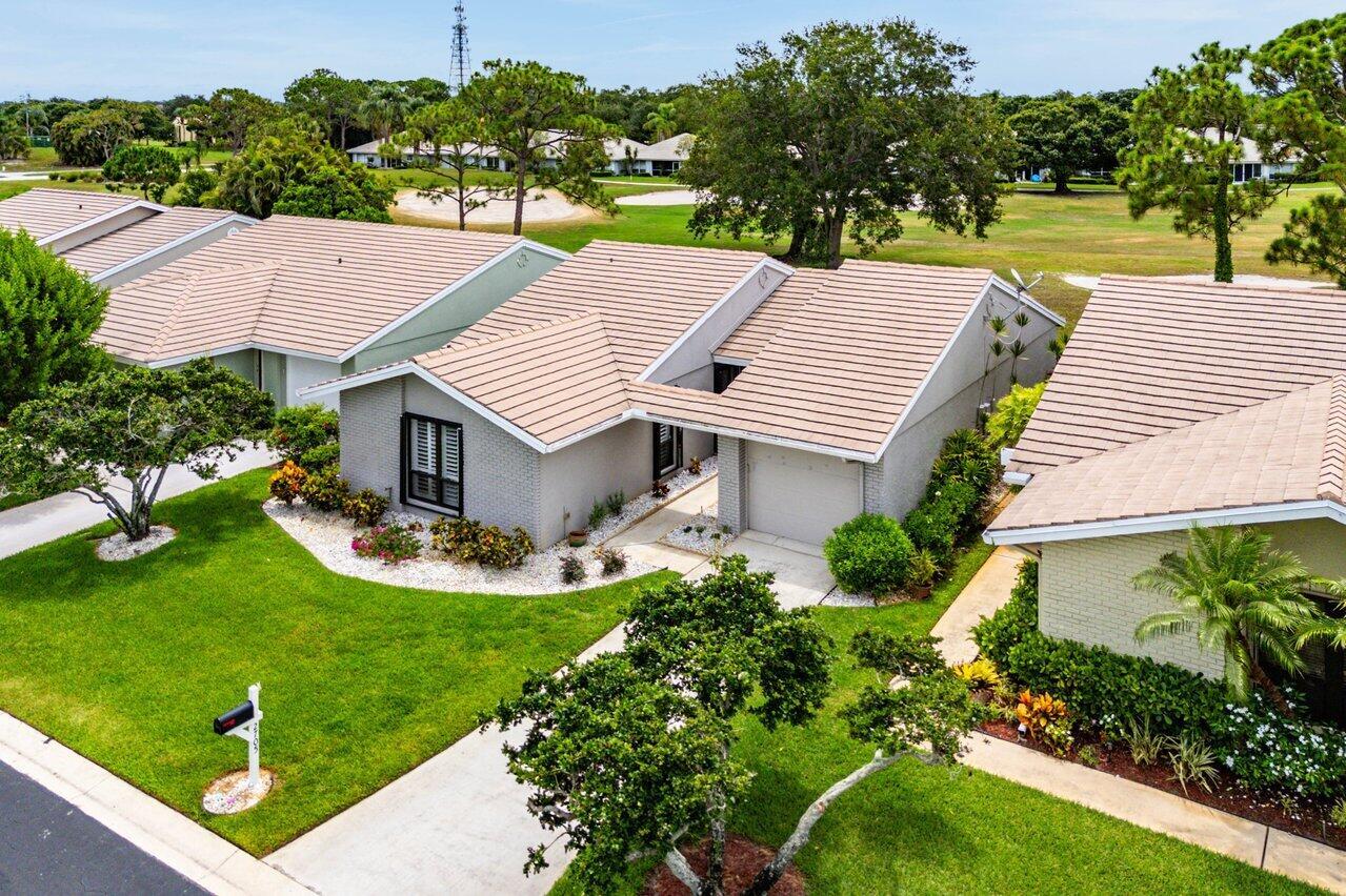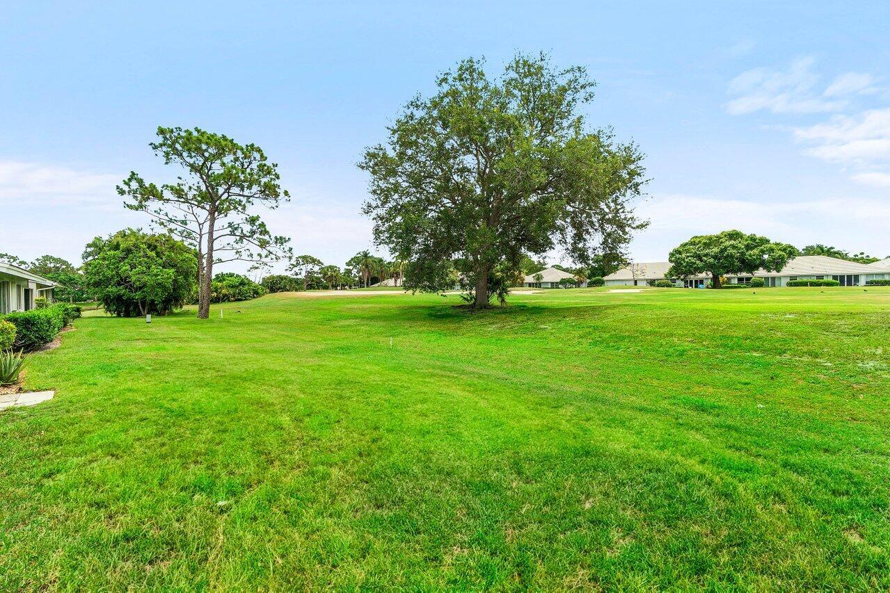 Enjoy 1-story living w/ gorgeous open views of the 17th fairway! CBS home w/ a combo of hurricane impact windows and Accordian shutters for easy breezy storm prep! Lovingly cared for and move-in ready. If you like a large living area and open, soaring ceilings - this one is for you! Double door entry greets with grandeur and makes moving simple. Light and bright with Southeastern views. Thoughtfully remodeled to include a new kitchen w/ white shaker style cabinetry, granite counters, stone backsplash & newer appliances including a Bosch dishwasher and 2025 refrigerator. Breakfast bar and dining area perfectly suit entertaining or meals for one. Floors have new tile throughout - no carpet! Bathrooms have also been updated w/ new vanities, new shower tile and glass enclosures.