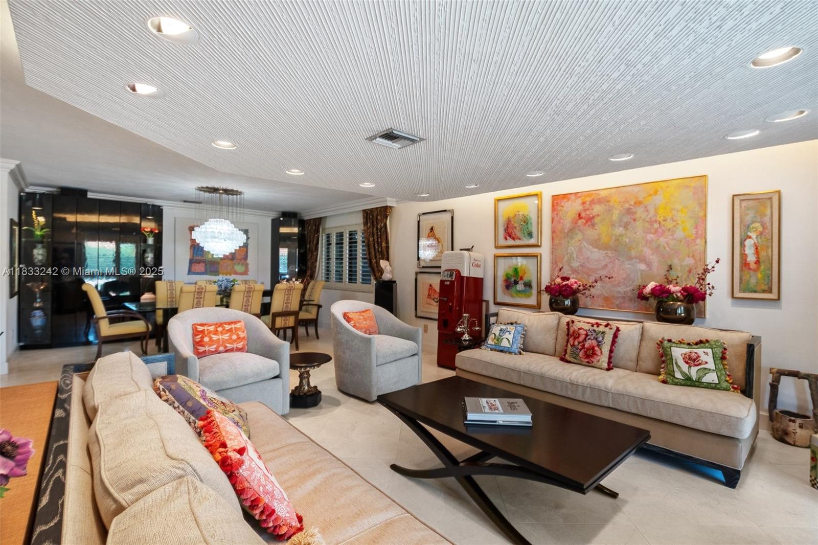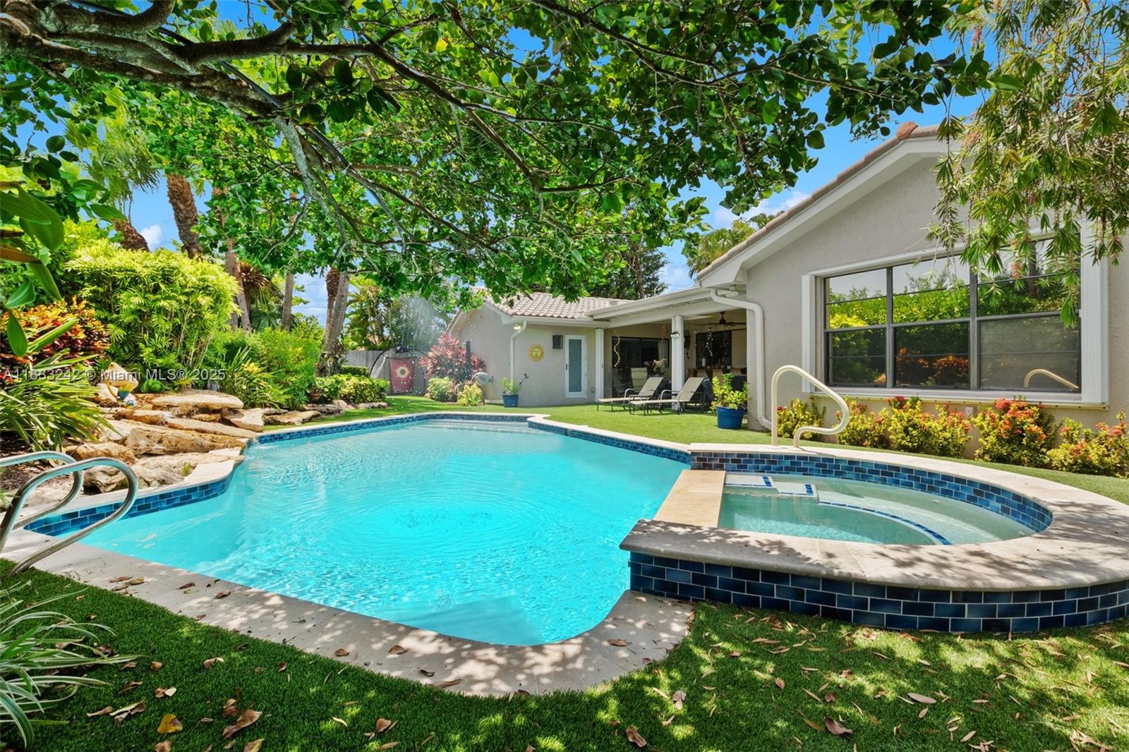 Beautifully updated 4BD/2BA home featuring marble floors in main areas and wood floors in all bedrooms. Gourmet kitchen with wood cabinetry, mosaic backsplash, granite counters, wine cooler, center island, and premium stainless appliances incl. oversized fridge, grill, and double oven. Primary suite offers walk-in closet, remote shades, and spa-like bath with steam shower, bidet, and Culligan system. Outdoor oasis boasts heated saltwater pool, spa, putting green, covered patio with TV, and 25 palm trees. A mix of hurricane doors, impact windows & shutters, tankless water heater, 5-ton A/C (2022), Nest system, and more. Motivated sellers & a must-see!