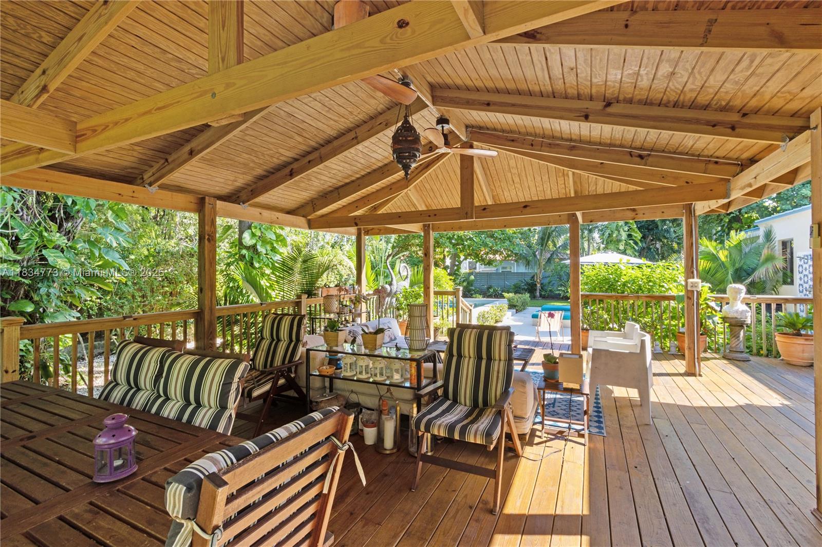 Unique resort style 3BD/3BA pool home in trending village of El portal with an oversized 10,700 sqft lot. Recently renovated form top to bottom it offers: open concept living/dinning and kitchen with great island and wine cooler, 3 bedrooms with wooden vaulted ceilings and fans, very ample bathrooms, walking closets and tons of storage space, aluminum roof, impact windows, wood floors, solar panels, water purifying system for the whole house and bathed in beautiful natural light. This is a dream house to entertain. The outdoor space, a true oasis, offers a state of the art oversized 760 sqft crafted pergola with vaulted ceilings and fans, pool, outdoor shower with hot/cold water, and a fabulous mature lush garden. Prepare to fall in love with this home!