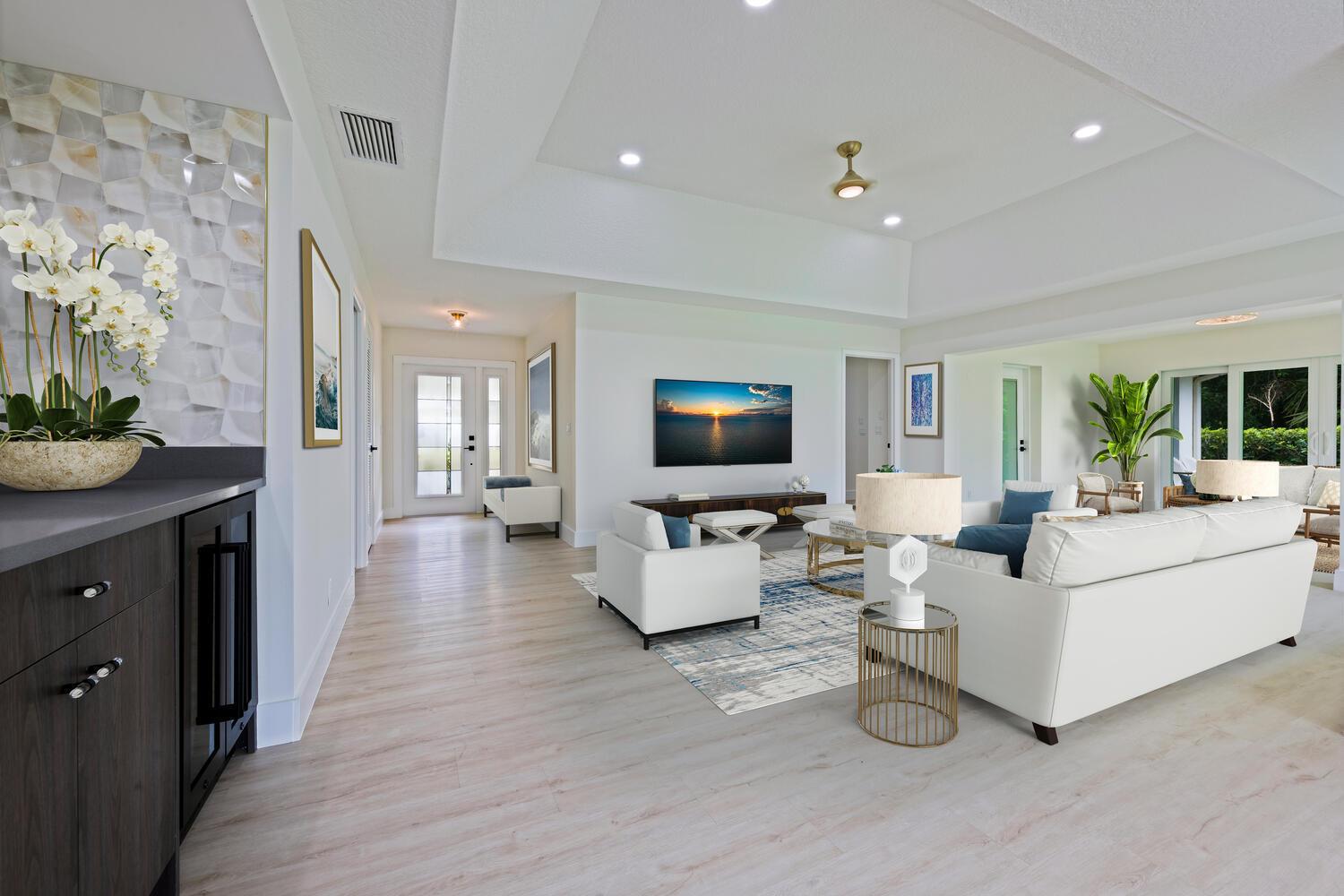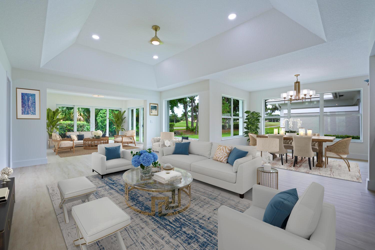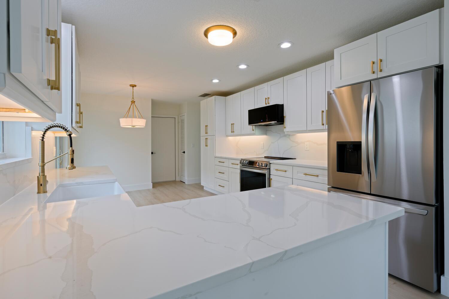 This home in Monarch Country Club is located on the 15th fairway of the Arnold Palmer Championship Golf Course, offering beautiful views from the living room. It features three bedrooms, two bathrooms, and a two-car garage with space for a golf cart. Recently remodeled, upgrades include a newer roof with leaf guard gutters, impact-resistant windows, and light oak luxury vinyl tile. The primary bathroom has modern Euro-style cabinets, and the kitchen includes new LG appliances and a wine fridge. An enclosed porch provides additional relaxation space. The monthly HOA fee of $541 covers gate maintenance, lawn care, cable, high-speed internet, and biannual roof cleaning, while the exterior, walkways, and driveways are pressure cleaned and repainted every six years.