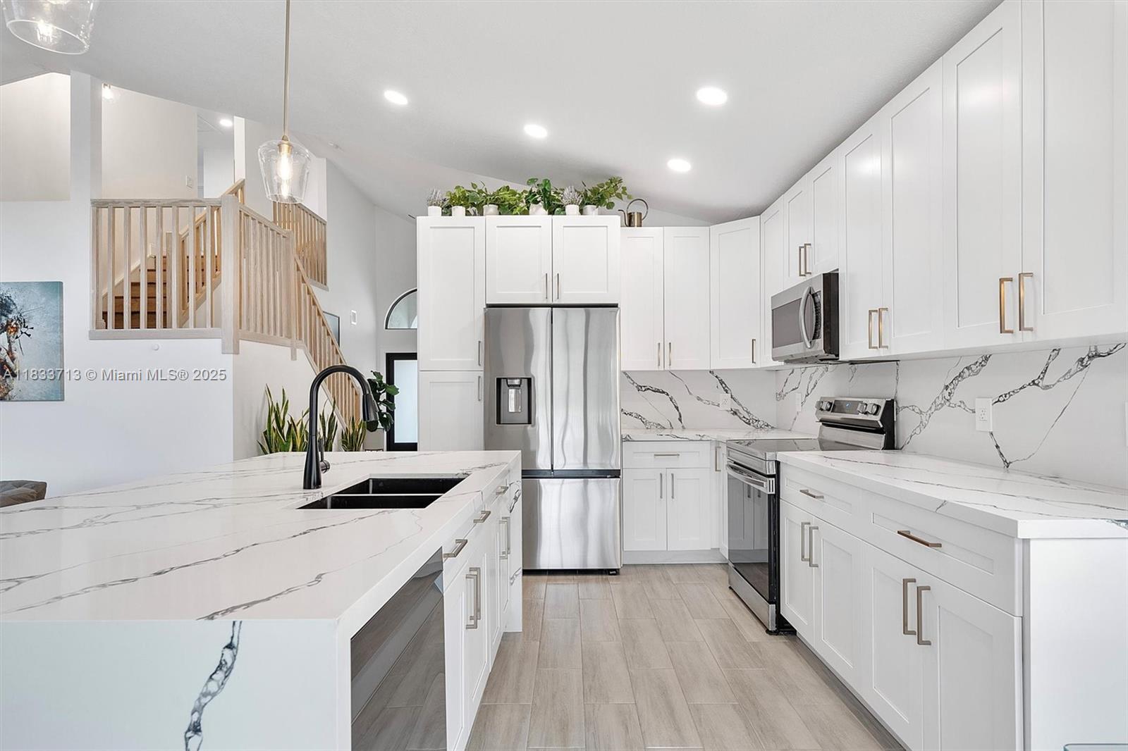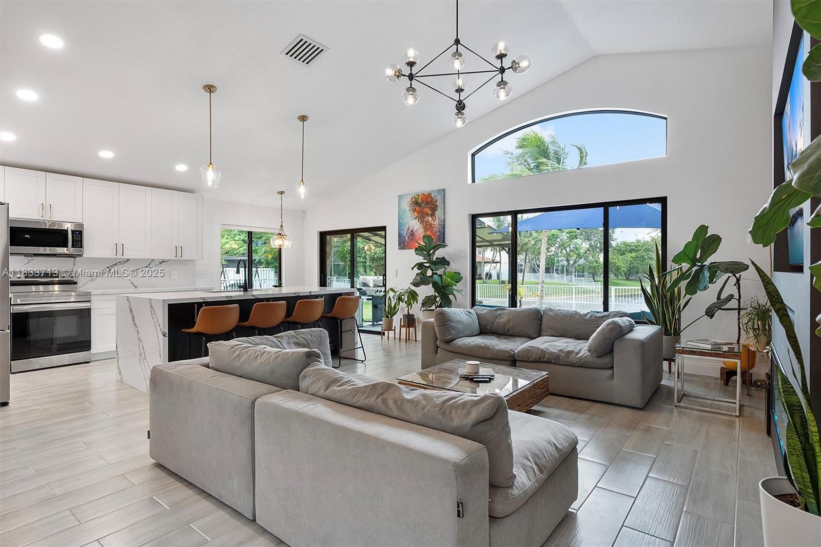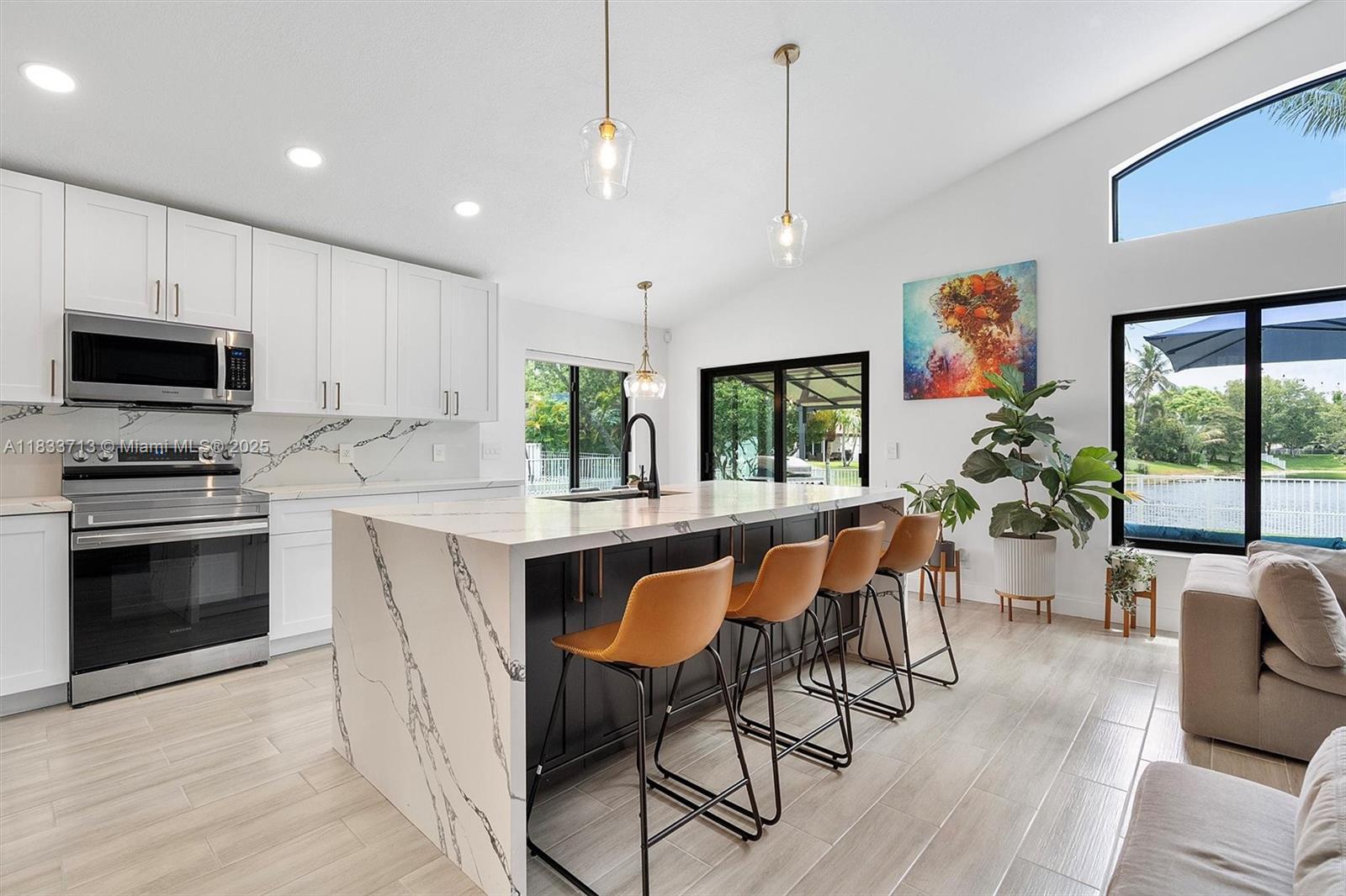 Stunning fully renovated 2-story waterfront home with 4-Bed / 2.5-Bath in gated community of Pembroke Falls! Contemporary kitchen featuring quartz countertops, large kitchen island, and stainless appliances. Open floor plan with soaring ceilings, luxury tile flooring, and a breathtaking panoramic lake view. Spacious primary suite on the first floor. 3 spacious bedrooms located on the 2nd floor. Half bathroom conveniently located on the 1st floor. Large fully fenced backyard with covered area, and plenty of space for a pool. Roof 2021, AC 2022, New Impact windows & doors. Resort-style amenities include a clubhouse with a gym, pools, tennis courts, etc. Prime location near major highways and shops! Bundled service pricing available for buyers. Connect with the listing agent for details.
