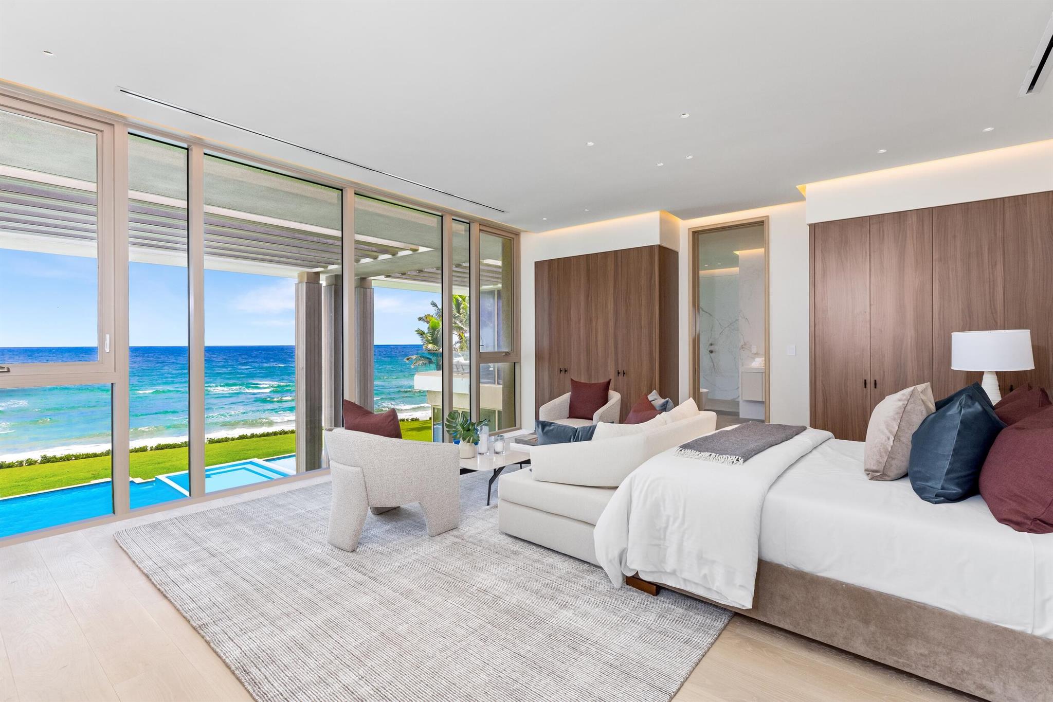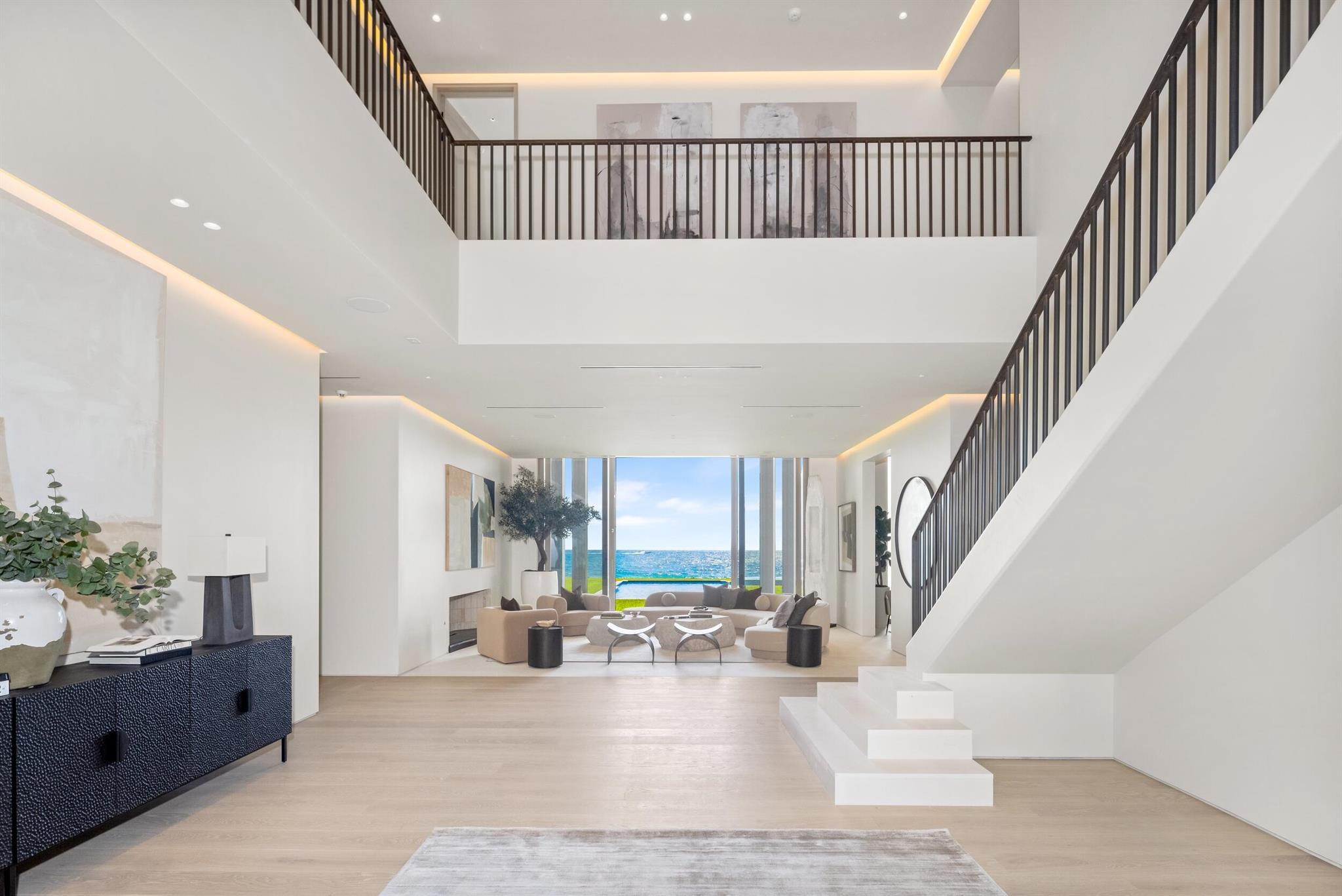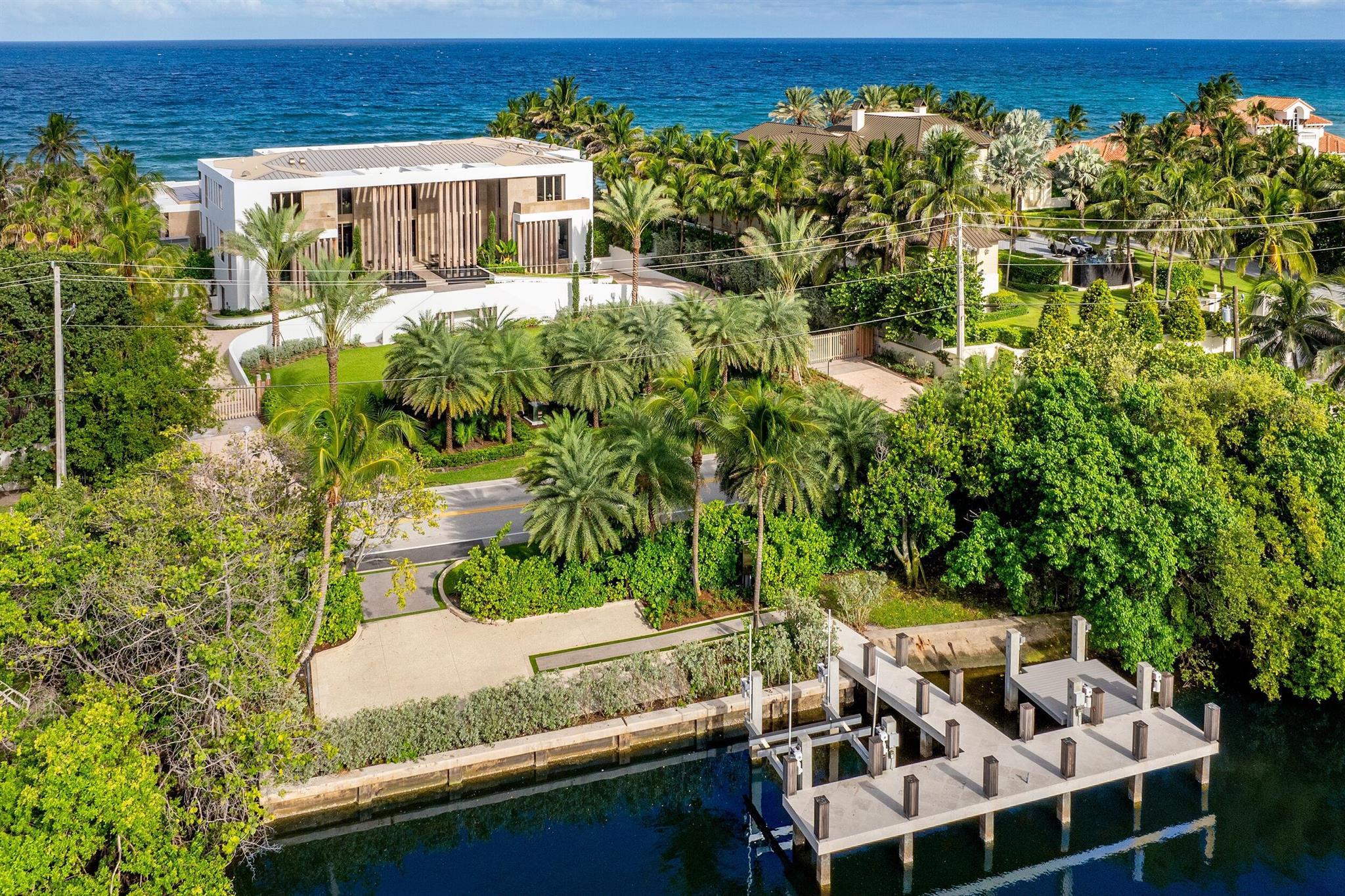 This exceptional 2024-built modern estate sets a new benchmark for luxury living in the exclusive community of Manalapan. Encompassing more than 25,500 square feet on a remarkable 1.5-acre double-frontage lot, the residence offers 172 feet of direct frontage on both the Atlantic Ocean and the Intracoastal Waterway. A private 50-foot dock with boat lift, dual jet ski lifts, and mooring piles provides effortless water access.A grand double-height foyer with cascading water features creates an unforgettable first impression. The open, light-filled interior showcases sweeping ocean views and an elegant blend of contemporary design and coastal refinement. Finishes include limestone slab flooring, wide-plank oak, and expansive walls of glass that elevate the interior with warmth and