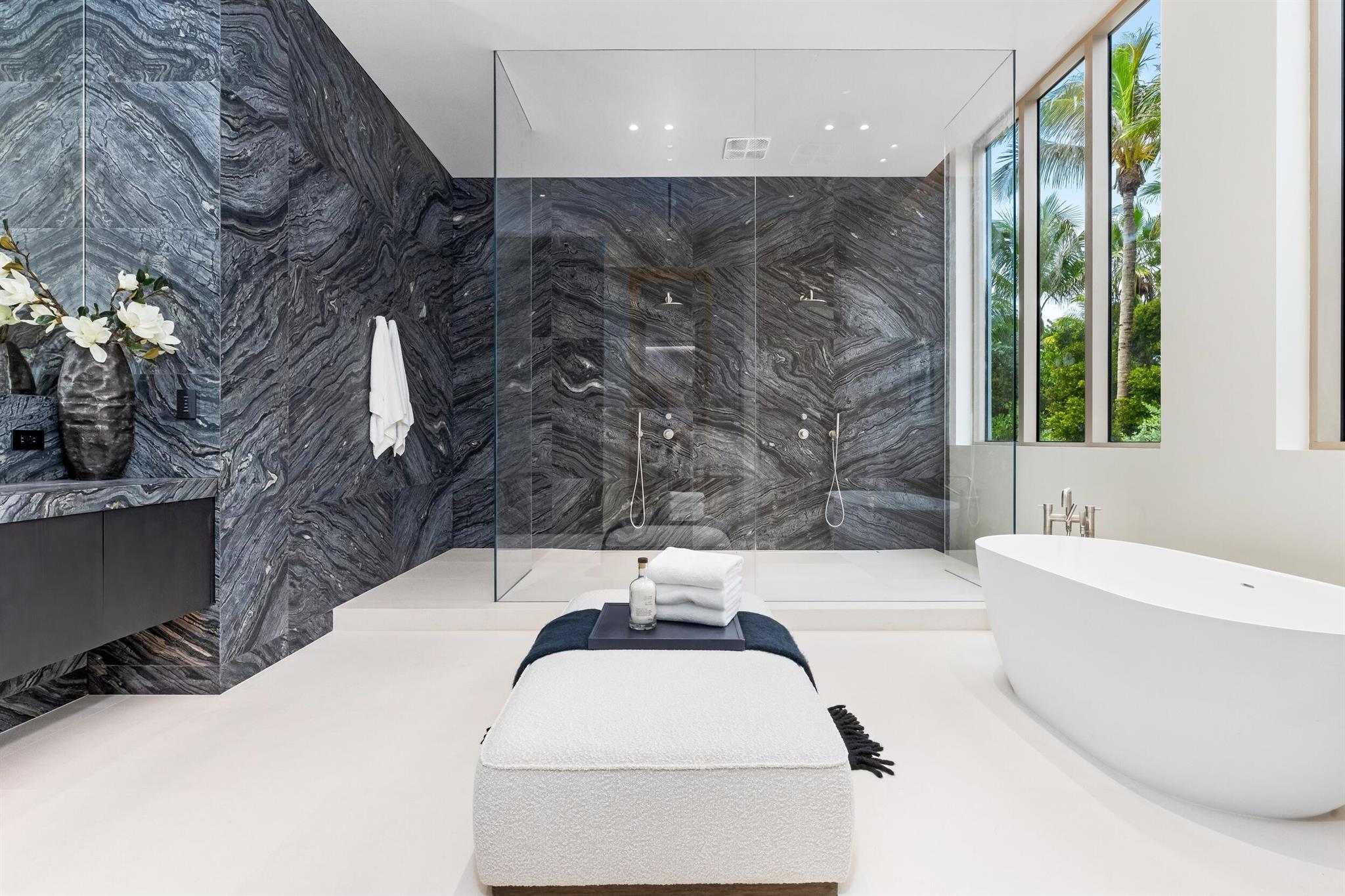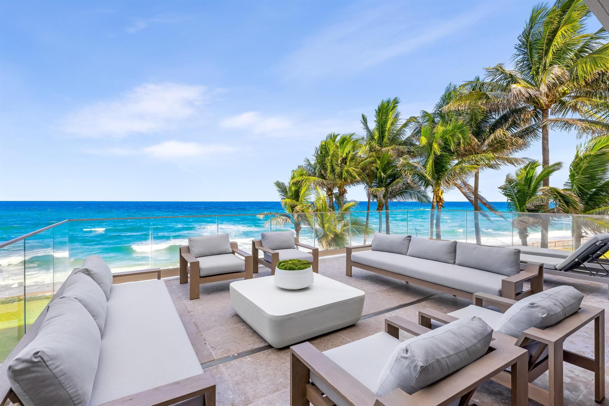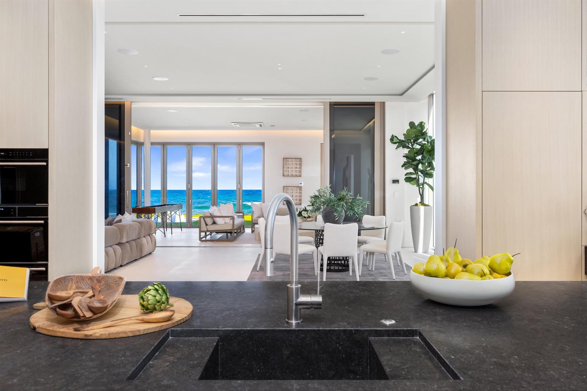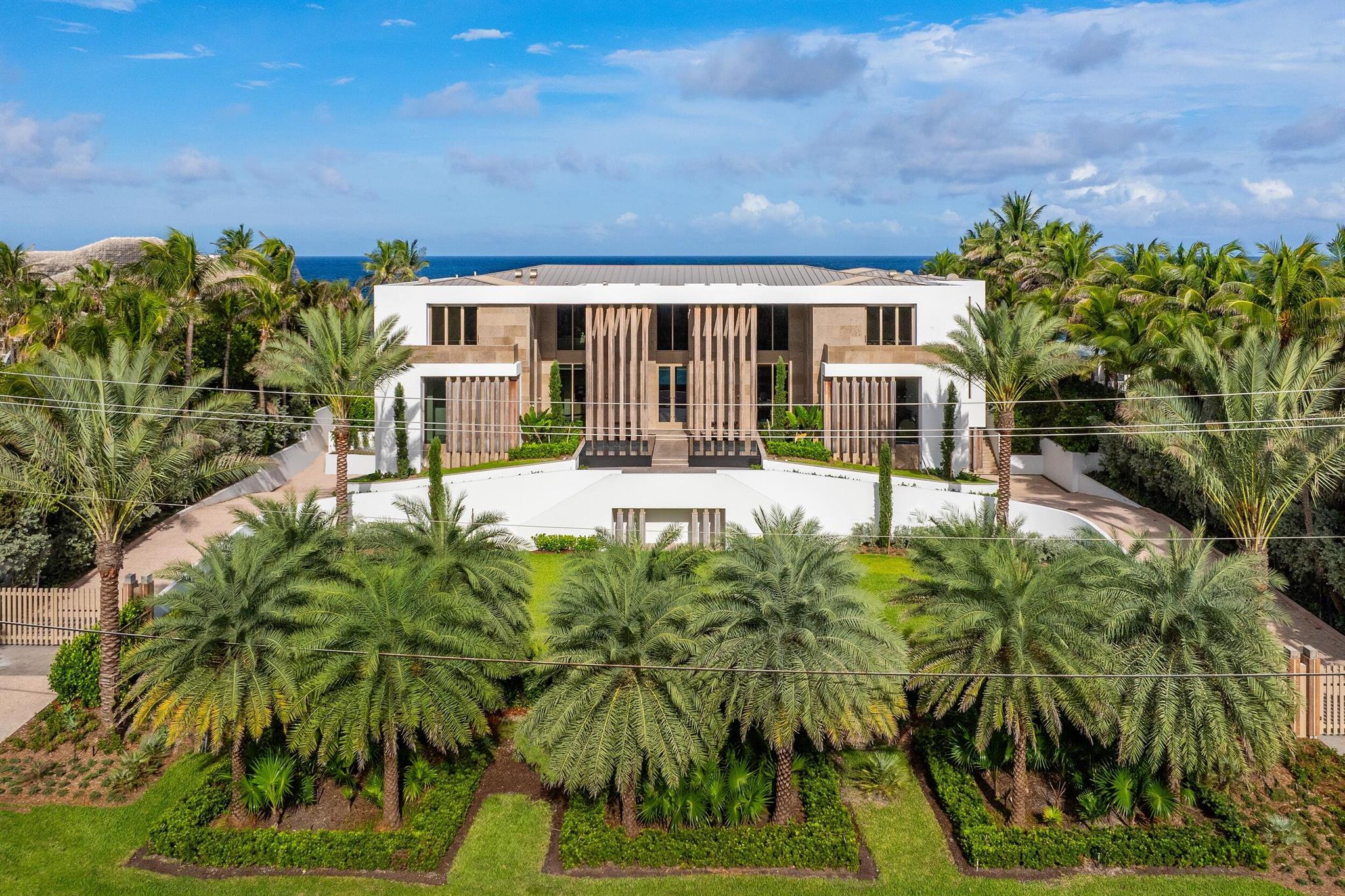 This exceptional 2024-built modern estate sets a new benchmark for luxury living in the exclusive community of Manalapan. Encompassing more than 25,500 square feet on a remarkable 1.5-acre double-frontage lot, the residence offers 172 feet of direct frontage on both the Atlantic Ocean and the Intracoastal Waterway. A private 50-foot dock with boat lift, dual jet ski lifts, and mooring piles provides effortless water access.A grand double-height foyer with cascading water features creates an unforgettable first impression. The open, light-filled interior showcases sweeping ocean views and an elegant blend of contemporary design and coastal refinement. Finishes include limestone slab flooring, wide-plank oak, and expansive walls of glass that elevate the interior with warmth and