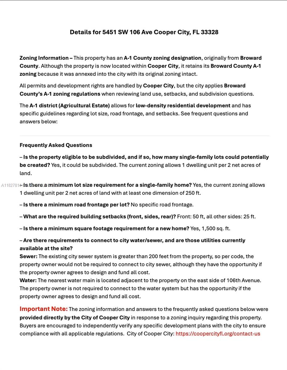 A truly spectacular opportunity awaits on this expansive 4.34 acre property located on the sought after 106th Avenue in Cooper City. Whether you are an investor, developer, or dream home visionary, this unique parcel offers limitless potential. Currently situated on the property are 3 existing structures. A 3 bed, 2 bath main house, 1 bed, 1 bath guest house & a stable. Rare chance to own prime land with endless development potential. Enjoy endless open green space & the freedom to create your dream estate or equestrian retreat. One-of-a-kind property, don’t miss this chance to build your vision in one of Broward County’s most desirable locations. Opportunities like this in Cooper City are extremely rare, bring your creativity and re-imagine this property into your own masterpiece.