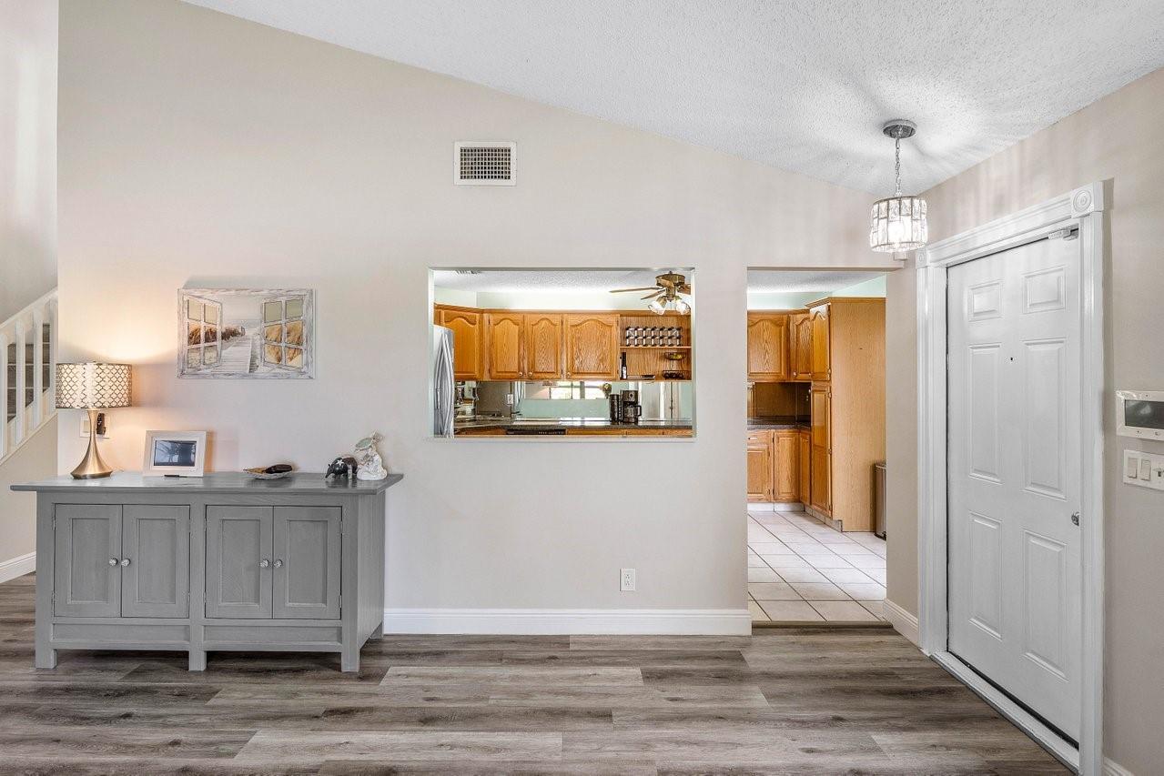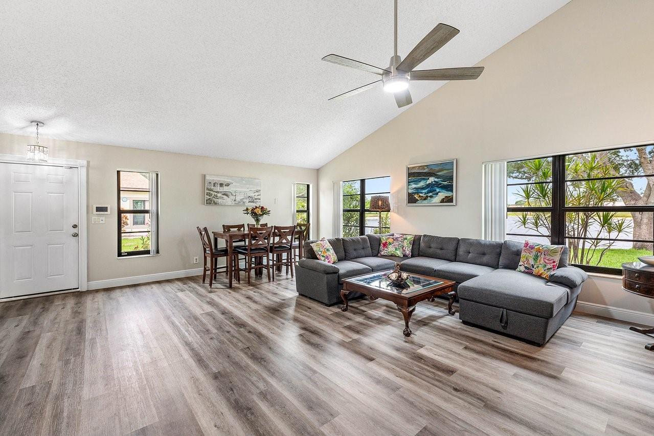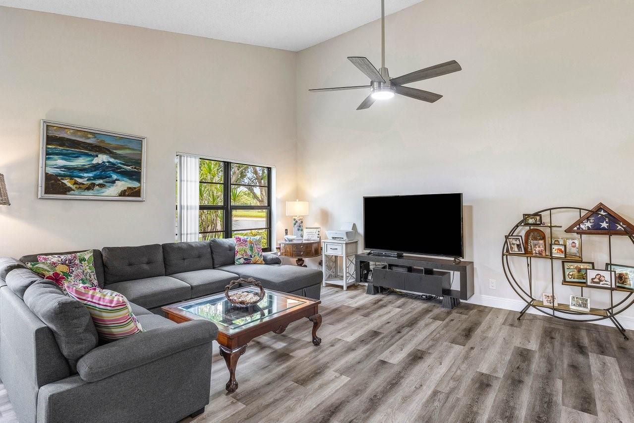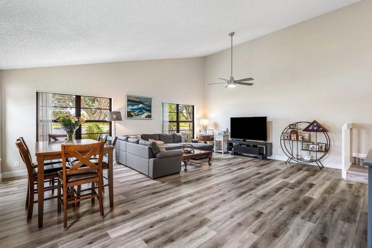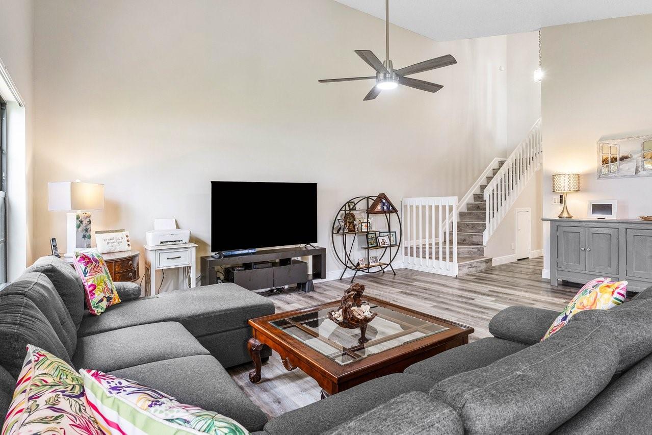 Exceptionally well kept, two-story townhome, 3-bedroom, 2.5-bathroom located in the desirable Lakeside Green community. This townhome offers a spacious open-concept layout with soaring vaulted ceilings & updated hurricane impact windows throughout. The main living & dining areas flow effortlessly into a enclosed lanai. The first-floor primary suite features a large walk-in closet, ensuite bath, and private sliding doors leading to lanai. Recent updates; tankless water heater(2024), new A/C unit(2022), roof replacement(2023), fresh interior paint & newer flooring. Enjoy resort-style amenities including two community pools, a clubhouse, fitness center, game room, tennis & badminton courts, playground, & scenic walking/bike trails. The HOA covers cable, exterior maintenance, & landscaping.