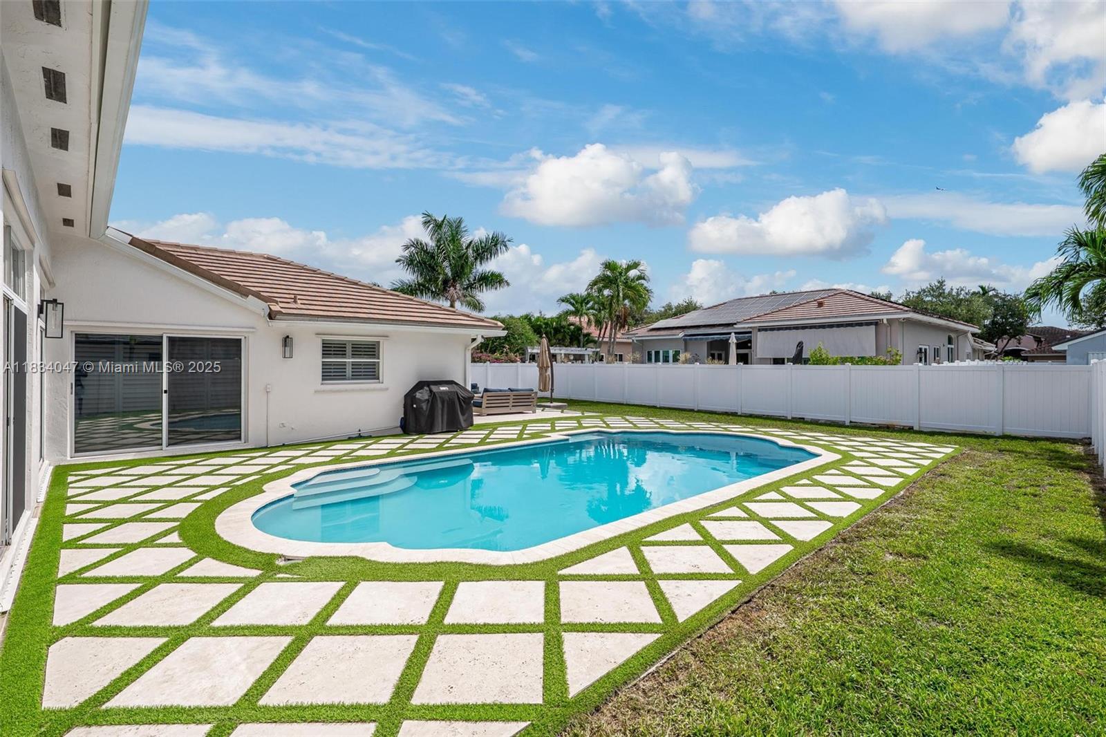 Standout 3-bedroom 2-bath pool home on an oversize lot, in the desirable Bristol Isle section of Huntington. The backyard is an entertainer's dream with a custom pool and diamond-design turf patio upgraded in 2022. The interior features a split-plan layout and vaulted ceilings allowing lots of light. Other highlights include a 2021 roof, freshly painted interior and exterior, plantation shutters, a PVC fence, a separate laundry room, and a large 2 car garage with additional storage area. Great walkable neighborhood with park and playground nearby. Conveniently located near top-rated schools, Memorial Hospital, Pembroke Gardens Mall, Miramar Regional Park, and I-75. Low HOA. Move quick on this one!