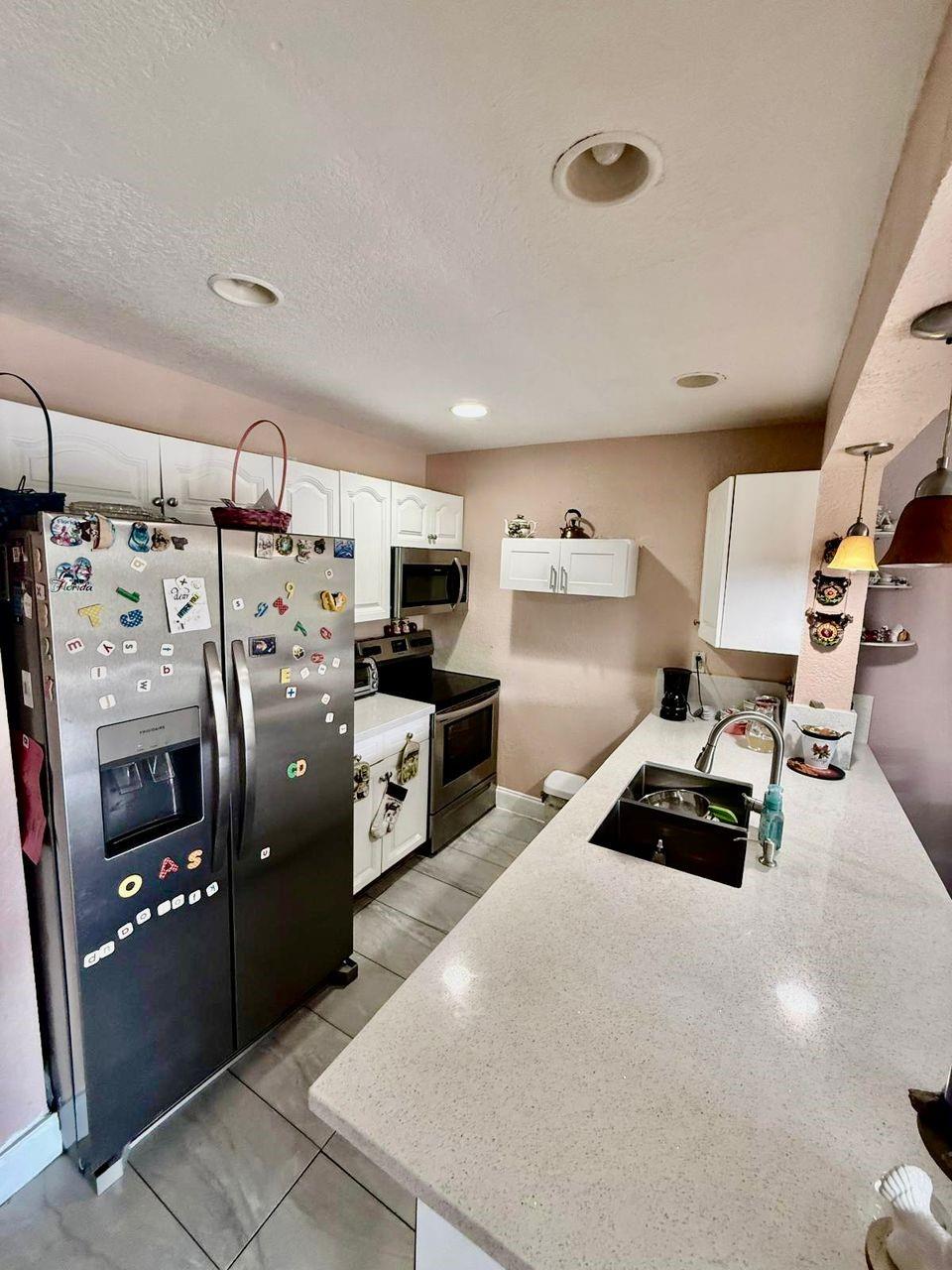 Spacious 3-bedroom, 2.5-bath two-story condo offering 1,428 sq ft of interior living space. The first level features a bright living and dining area, tile flooring, and a kitchen with updated countertops, cabinetry, and an extended serving bar. A half bath and laundry room are also located downstairs. Upstairs includes three bedrooms with wood-style flooring and two full bathrooms, including a tub/shower combo. The primary suite offers generous space and closet storage. Enjoy a screened-in patio and fully fenced garden area with outdoor access. Assigned parking included. Centrally located near schools, major roads, and shopping centers.