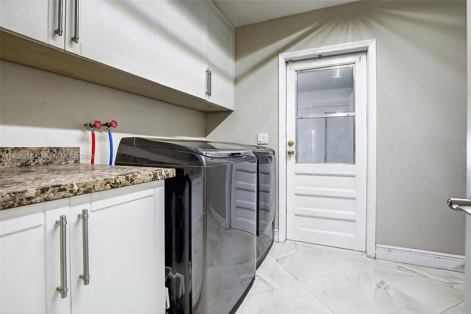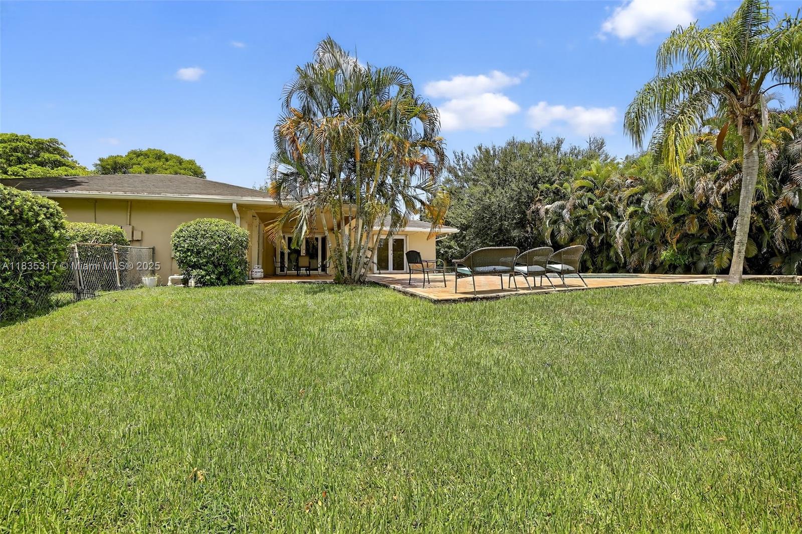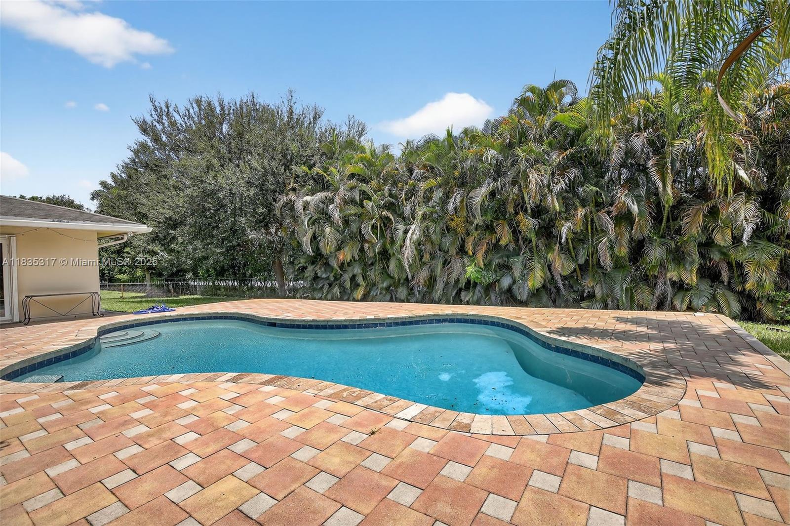 This great pool home in Davie is situated on a builder's acre in a private cul-de-sac. It features 3 bedrooms and 2 full bathrooms, a master bath with a frameless shower and a walk-in closet. This home offers porcelain tile flooring throughout. The updated kitchen boasts quartz countertops, a breakfast bar, and stainless steel appliances, and it seamlessly opens to both the living room and the family room. The spacious backyard includes a large stone paver deck and a covered patio surrounding a newly refinished free-form pool, all within a fully fenced yard. For added safety, the home is equipped with hurricane protection for all windows and doors. Conveniently located, this property is close to a variety of parks, dining, and entertainment options, and it lies within an A+ school district