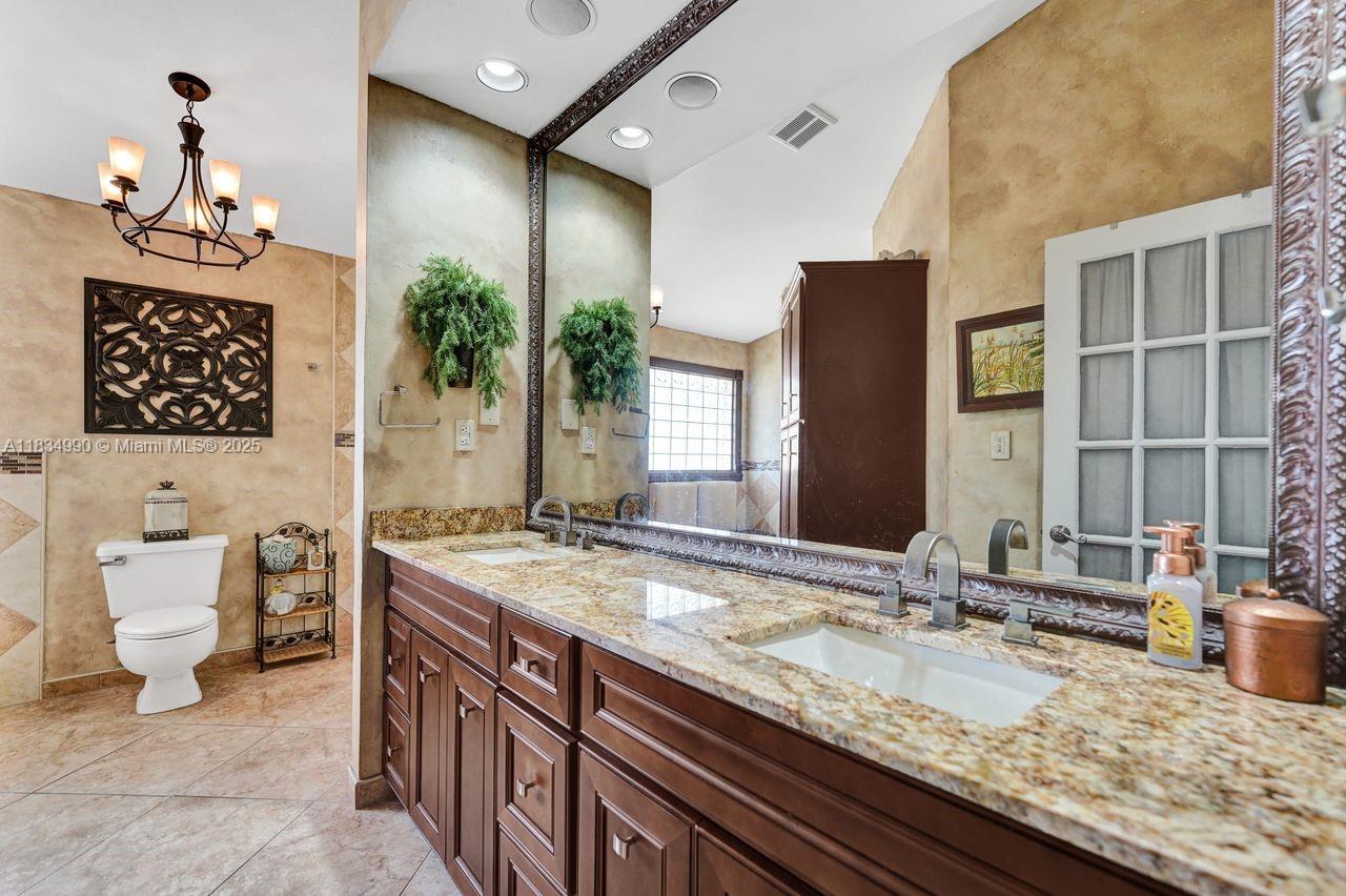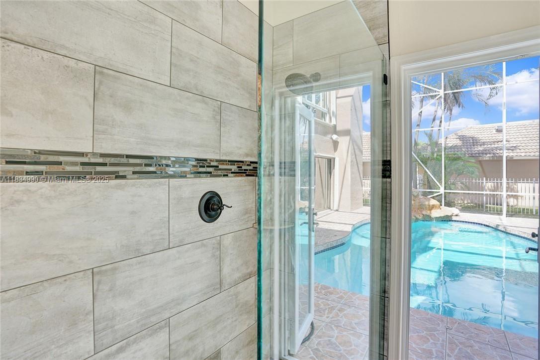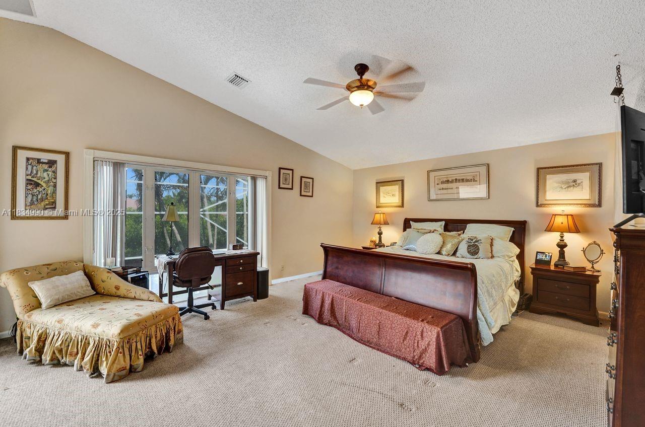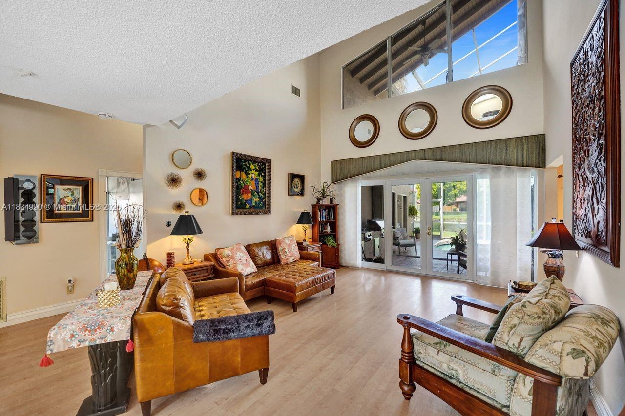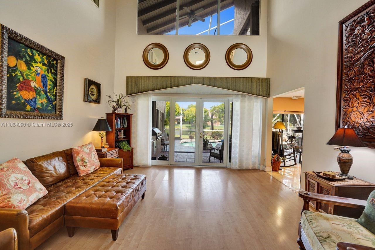 Tucked away on a quiet cul-de-sac in Jacaranda Cove, this stunning waterfront home offers a total of 3700 sq ft of elegant living on an expansive 11,200 sq ft lot. Featuring 5 bedrooms and 4.5 baths, including two spacious en suite master suites—one upstairs and one downstairs—this layout is ideal for multigenerational living. Enjoy soaring ceilings, abundant natural light, and open living areas. The main-level master opens to a screened patio with a 25-ft pool and waterfall. Highlights include some impact windows, accordion shutters, a newer A/C (2019), a loft, and an open and spacious kitchen with a granite island…Discover this rare gem before it's gone…