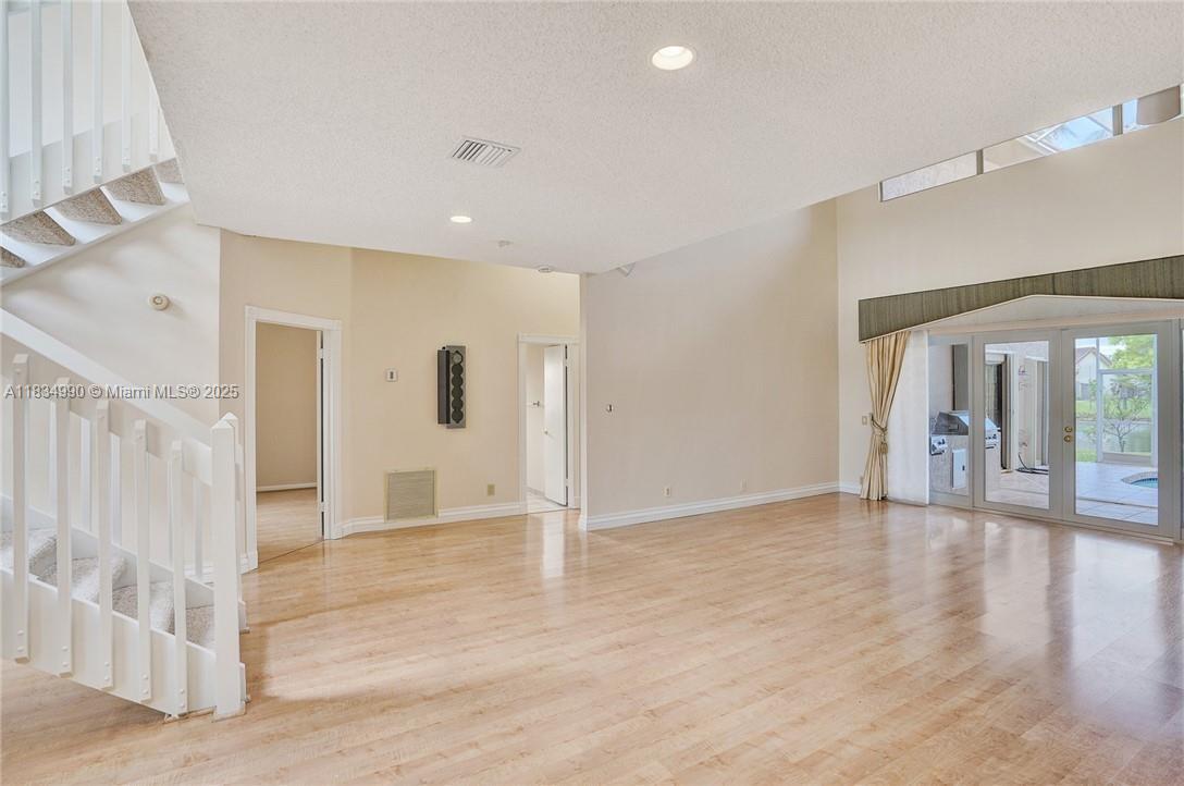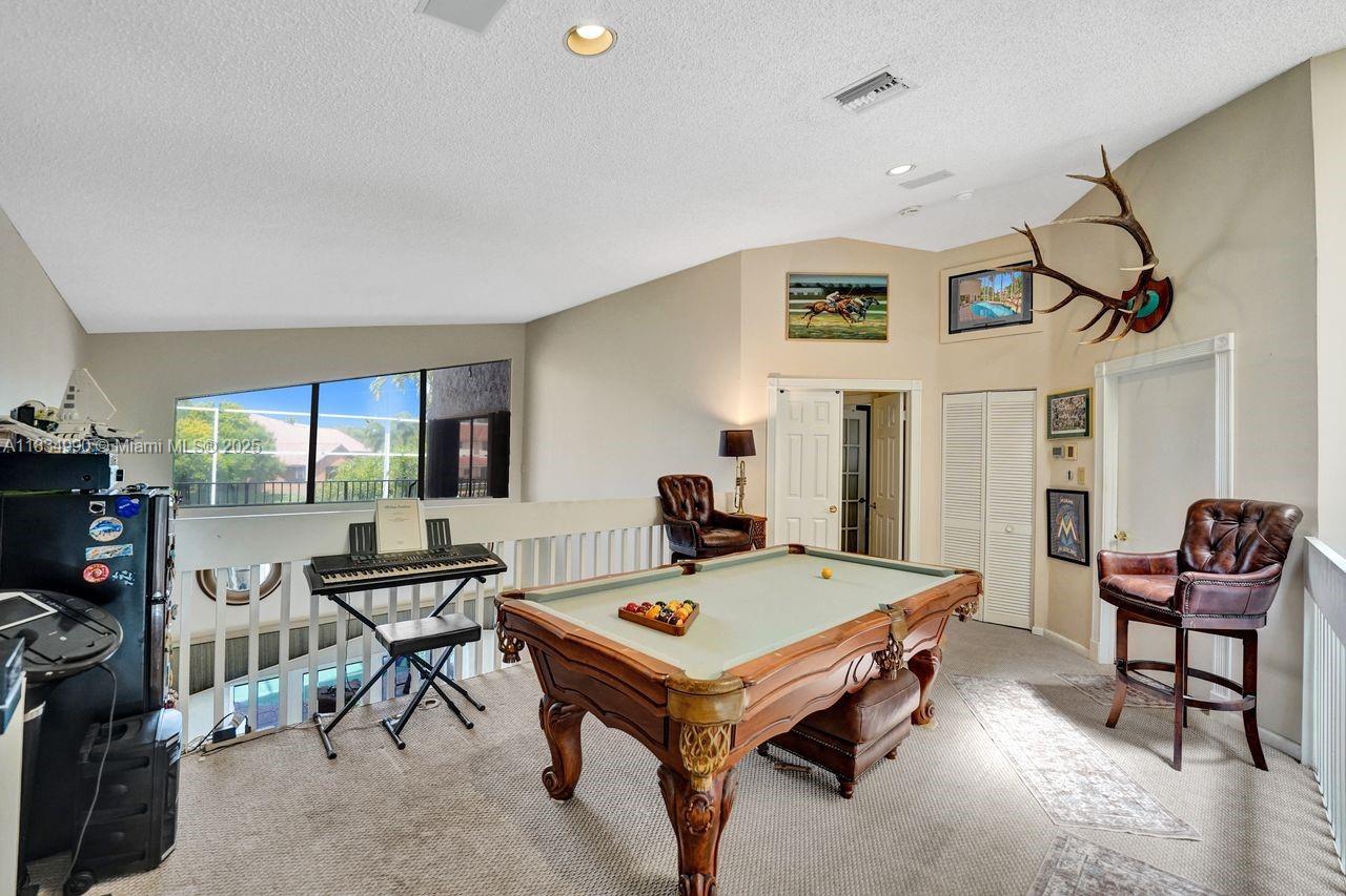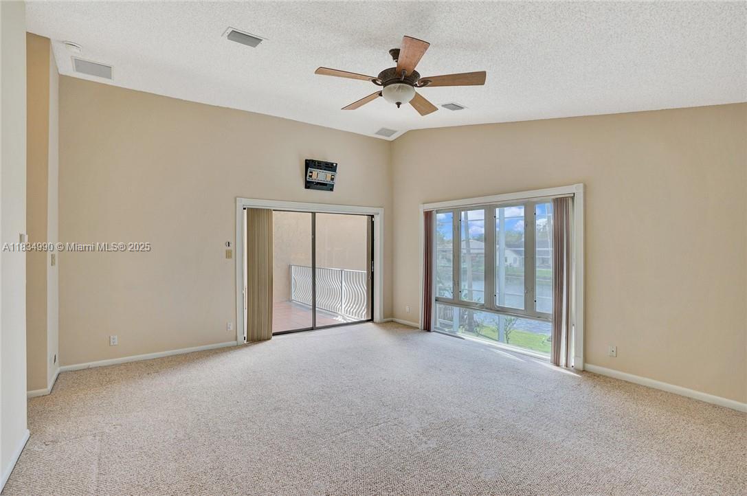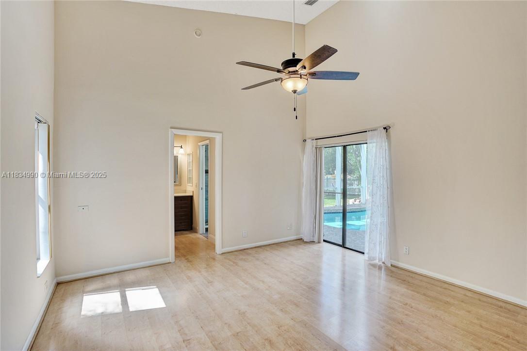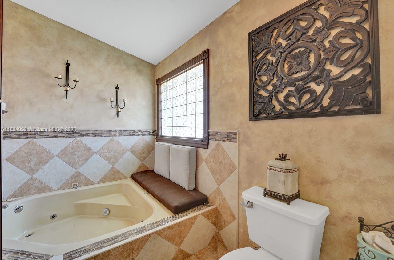 Tucked away on a quiet cul-de-sac in Jacaranda Cove, this stunning waterfront home offers a total of 3700 sq ft of elegant living on an expansive 11,200 sq ft lot. Featuring 5 bedrooms and 4.5 baths, including two spacious en suite master suites—one upstairs and one downstairs—this layout is ideal for multigenerational living. Enjoy soaring ceilings, abundant natural light, and open living areas. The main-level master opens to a screened patio with a 25-ft pool and waterfall. Highlights include some impact windows, accordion shutters, a newer A/C (2019), a loft, and an open and spacious kitchen with a granite island…Discover this rare gem before it's gone…