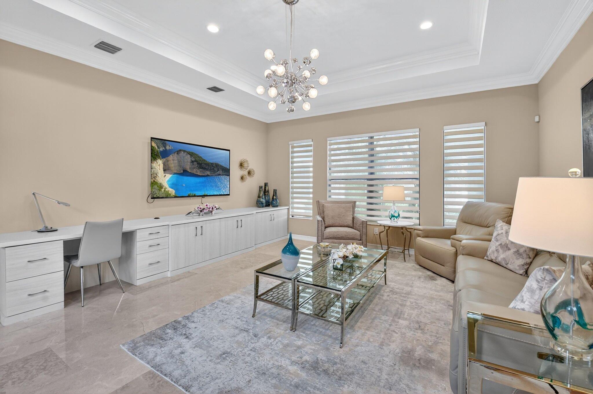 Step into refined luxury in this fully furnished, custom-furnished, designer-upgraded residence located in the prestigious community of The Bridges. Offering 3 bedrooms, 3.5 bathrooms, and a custom clubroom/office, this exceptional home seamlessly blends sophisticated style with modern convenience. A private courtyard entry with etched glass double doors leads to a welcoming foyer, setting the tone for the elegance found throughout. Step into a grand living area featuring gleaming marble floors, impact windows and doors, soaring coffered ceilings, surround sound, and crown molding throughout. The living room is enhanced by a custom wet bar and striking white stone columns, while newly installed oversized sliding glass doors with transom glass panels bathe the space in natural light.