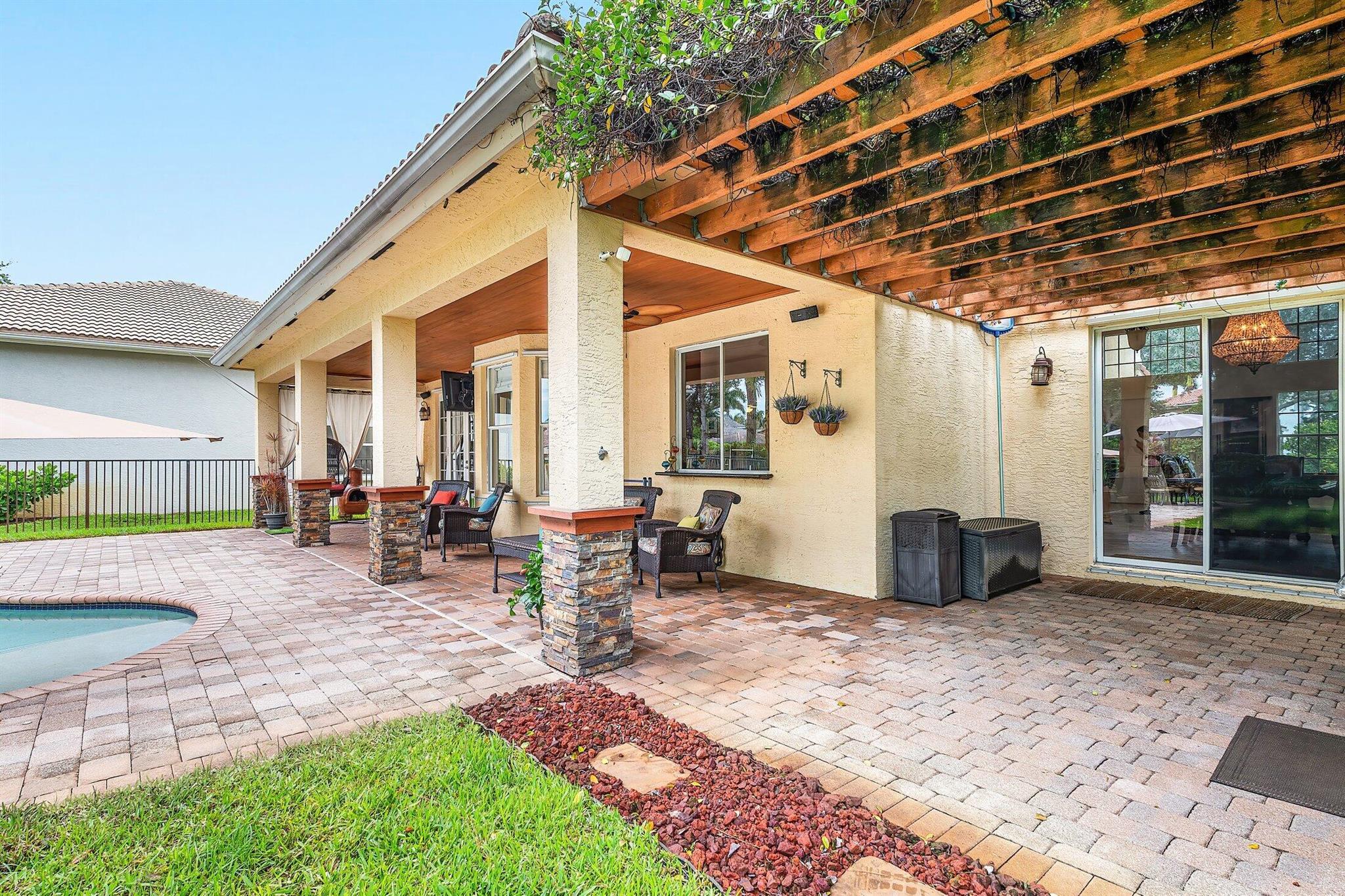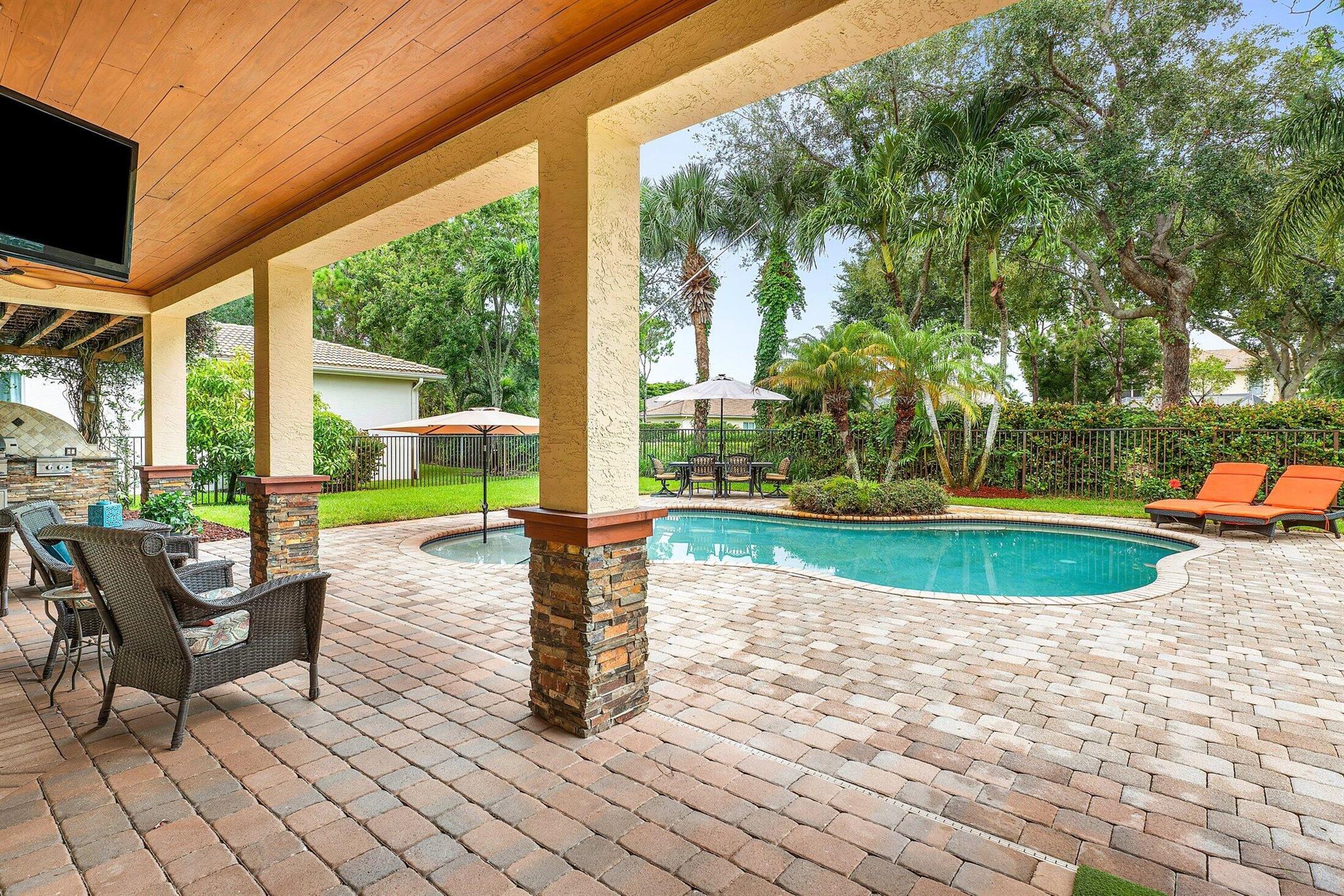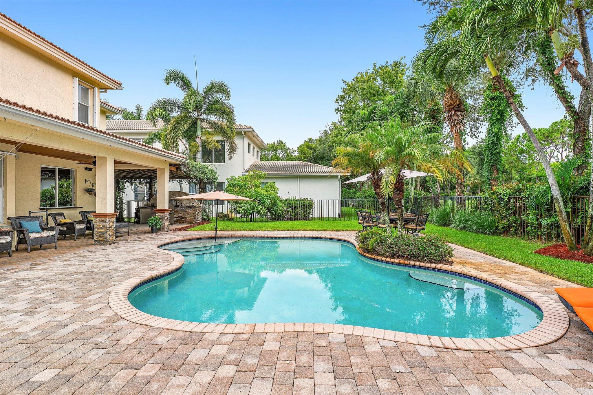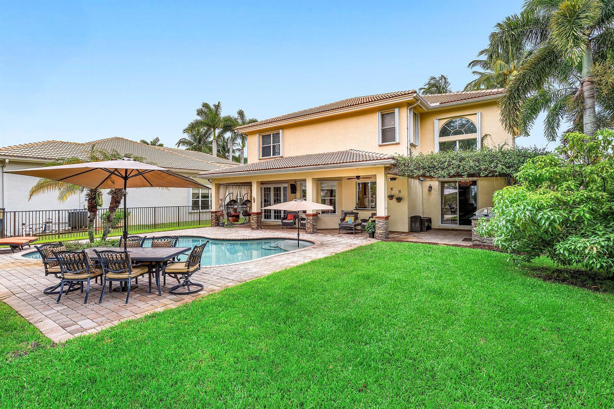 This Spectacular 5 Bedroom Home with Resort Style Backyard in Canyon Isles is Nestled on a Quiet Culdesac. Pulling Up to the Impressive Home Notice the Lush Landscaping that Surrounds You. Entering You will be Greeted by Incredible Two Story Volume Ceilings that Bring In Tons of Natural Light. The Chef's Kitchen Boasts 42'' Wood Cabinets, S.S. Appliances and a Walk-In Pantry. The 1st Floor Guest Room has a Hand Painted Mural that Creates a Perfect Playroom. French Doors from the Family Room Lead to Your Private Backyard Resort. The Covered Patio with Tongue & Groove Wood Ceiling and Stone Accents Overlooks a Custom Summer Kitchen with Pergola and a Massive Freeform Pool. There are Hand Scraped Wood Floors Throughout the Second Floor. .The Huge Primary Bedroom has a Large Sitting Area.