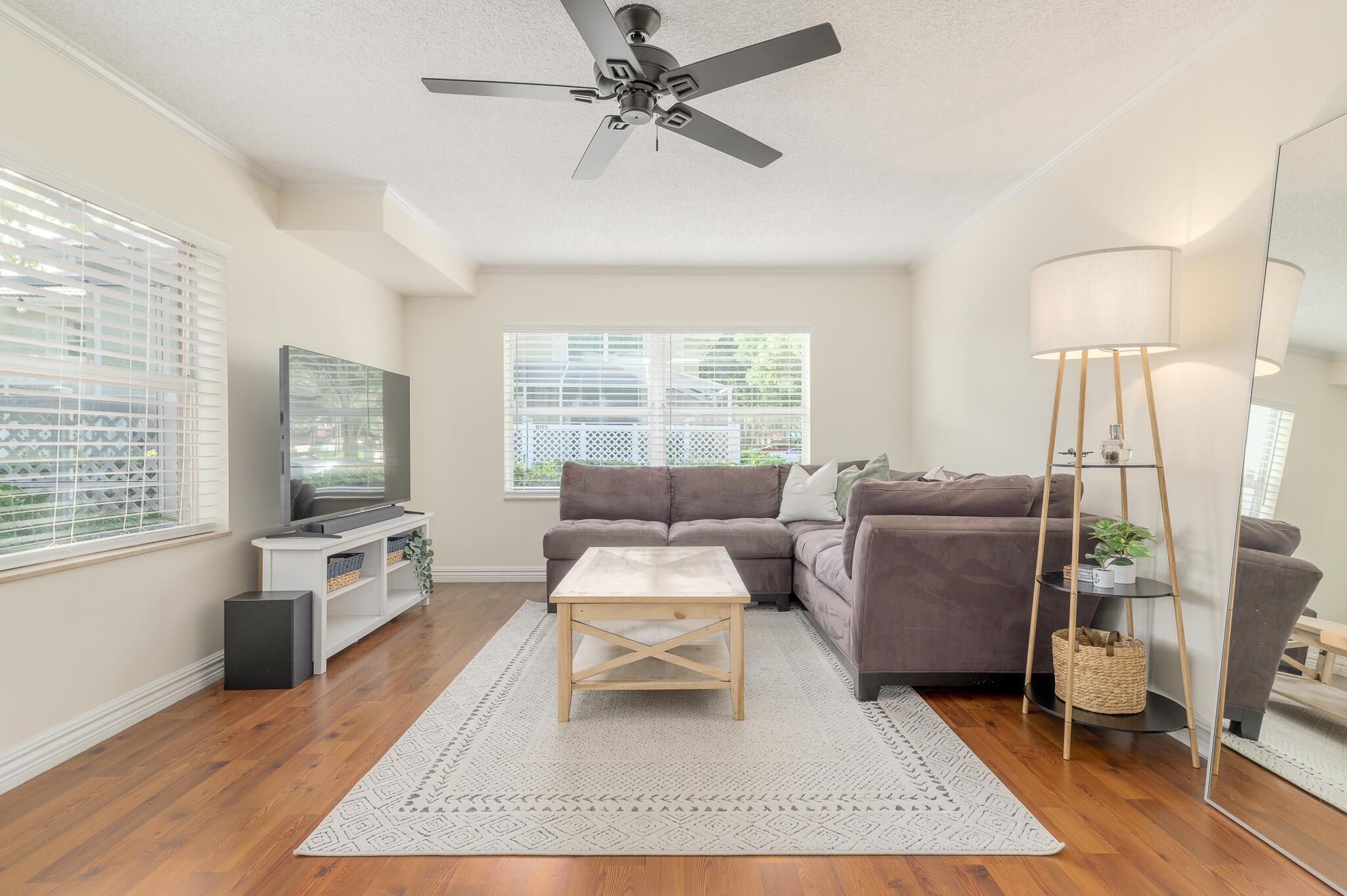 Beautifully Updated Townhome with Lake Views!! Your light & bright 2-bed, 2.5-bath townhome offers serene lake views from every room. The spacious layout features 2 ensuite bedrooms upstairs and a convenient half bath and washer/dryer on the main level. The kitchen has been tastefully updated, and the stunning primary bath includes quartz countertops & modern finishes. Easy-care laminate flooring flows through the dining & living areas. Enjoy peaceful mornings & tranquil evenings with lake views & exceptional privacy from your spacious, screened patio. Located in the highly sought-after Stamford at the Villages of Palm Beach Lakes, known for its tree-lined streets & park-like setting. Amenities include pools, parks, & tennis courts. Nearby PBI airport, shopping, dining, and entertainment.