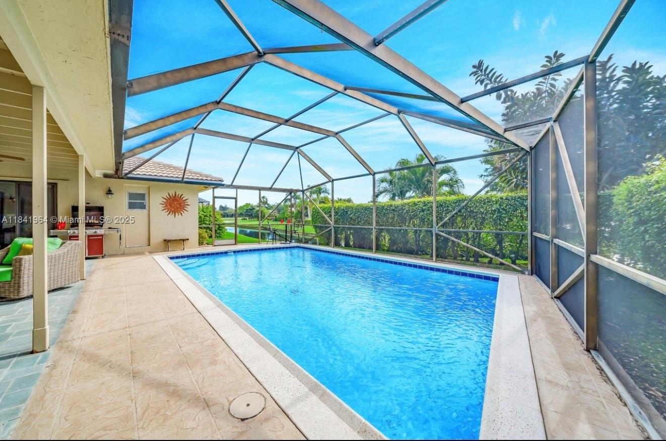 Renovated Corner Lot Home with 3 Bedrooms, 2 Baths, 2-Car Garage, Pool, and Lake Views in the prestigious Boca Greens Country Club—a gated golf community. Features include hurricane-proof impact windows and the door, cathedral ceilings, crown molding, tile and laminate flooring, recessed lighting, and surround sound. The gourmet kitchen boasts granite countertops, stainless steel appliances, and ample cabinet space. The spacious master suite includes vaulted ceilings, three walk-in closets, and pool access. Fully renovated bathrooms offer floor-to-ceiling tile and dual sinks. The backyard oasis has a screened patio, sparkling pool with mosaic designs, and serene lake views with native wildlife. Pet-friendly, all-ages community with top-rated schools and nearby houses of worship.