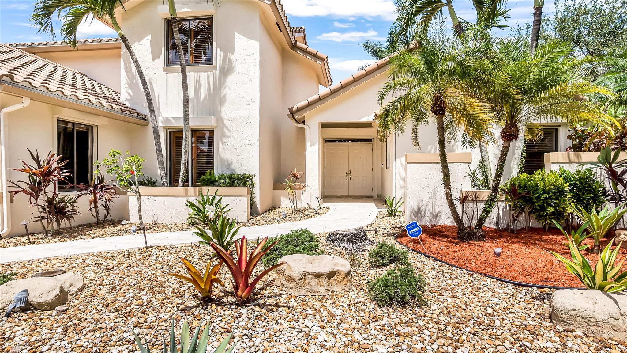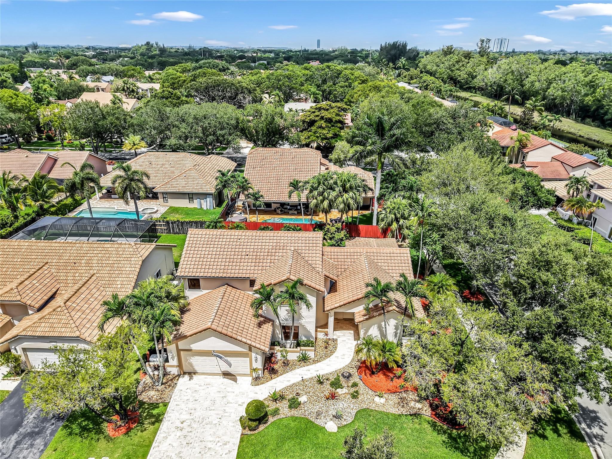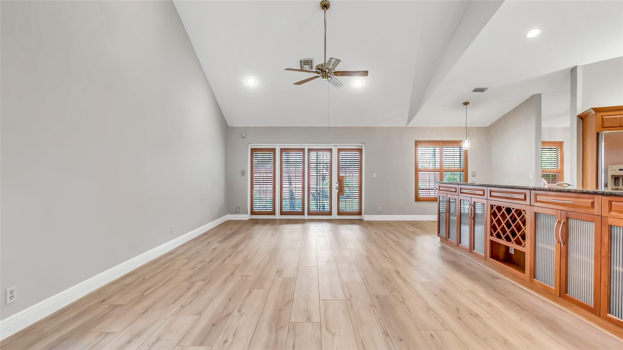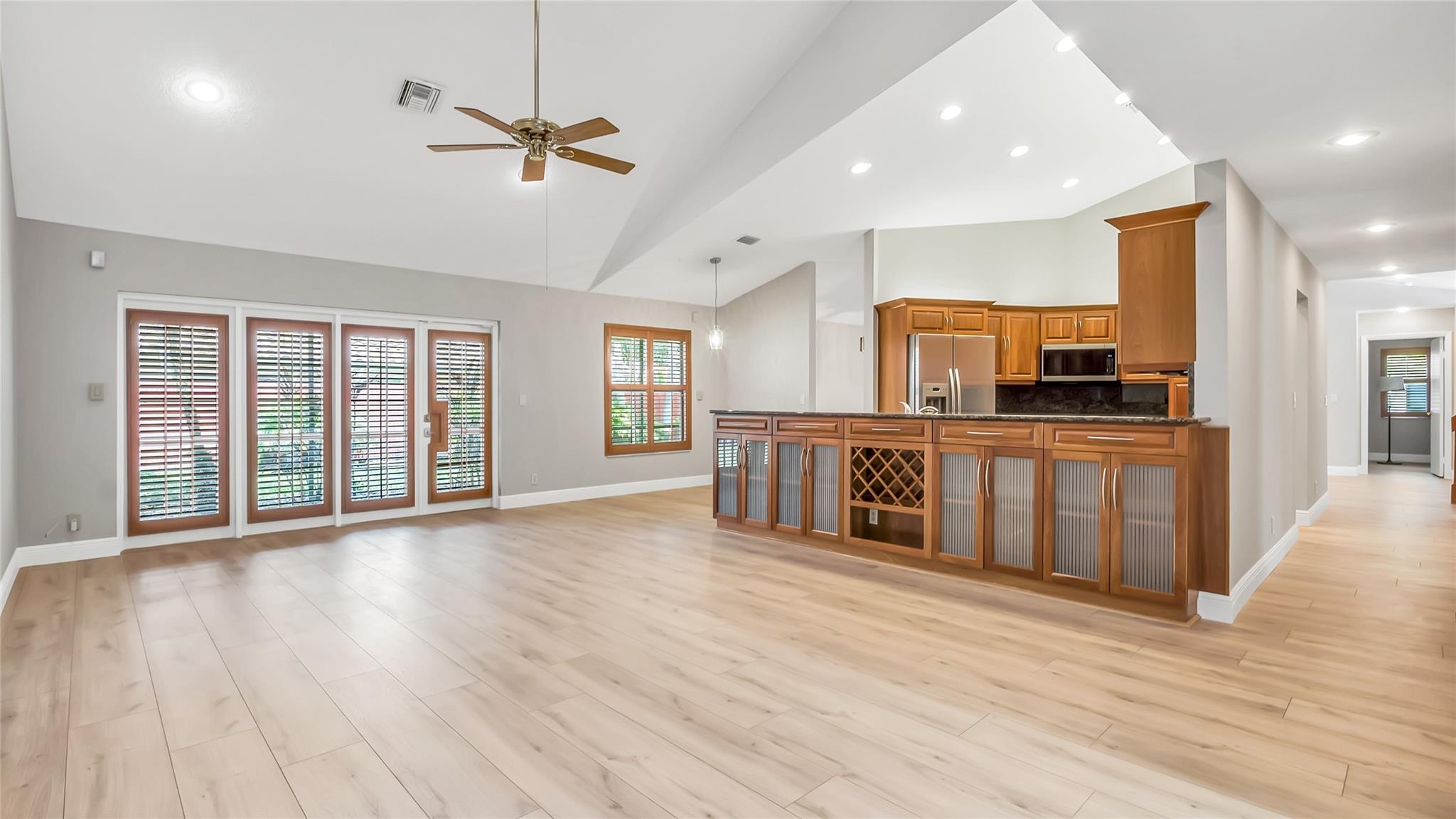 Beautifully updated corner lot home, soaring ceilings, smart, functional layout! 2025 improvements include fresh interior/exterior paint, popcorn ceiling removed & upgraded laminate flooring throughout. First-floor primary suite features: walk-in closet, roman tub, stall shower, quartz vanity, private office/den w/wood floors, built-ins & impact windows Additional downstairs bedroom & full bath; 2 more bedrooms upstairs w/renovated full bath. Kitchen offers granite counters, wood cabinets, pantry pull-outs, under/upper cabinet lighting & abundant recessed lighting. Family room w/dry bar w/quartz counters, inside laundry room & Plantation shutters throughout. Whole-house 22KW propane generator, 2022 A/C, electric rolldown shutters, alarm system w/cameras, lush landscaping complete this home
