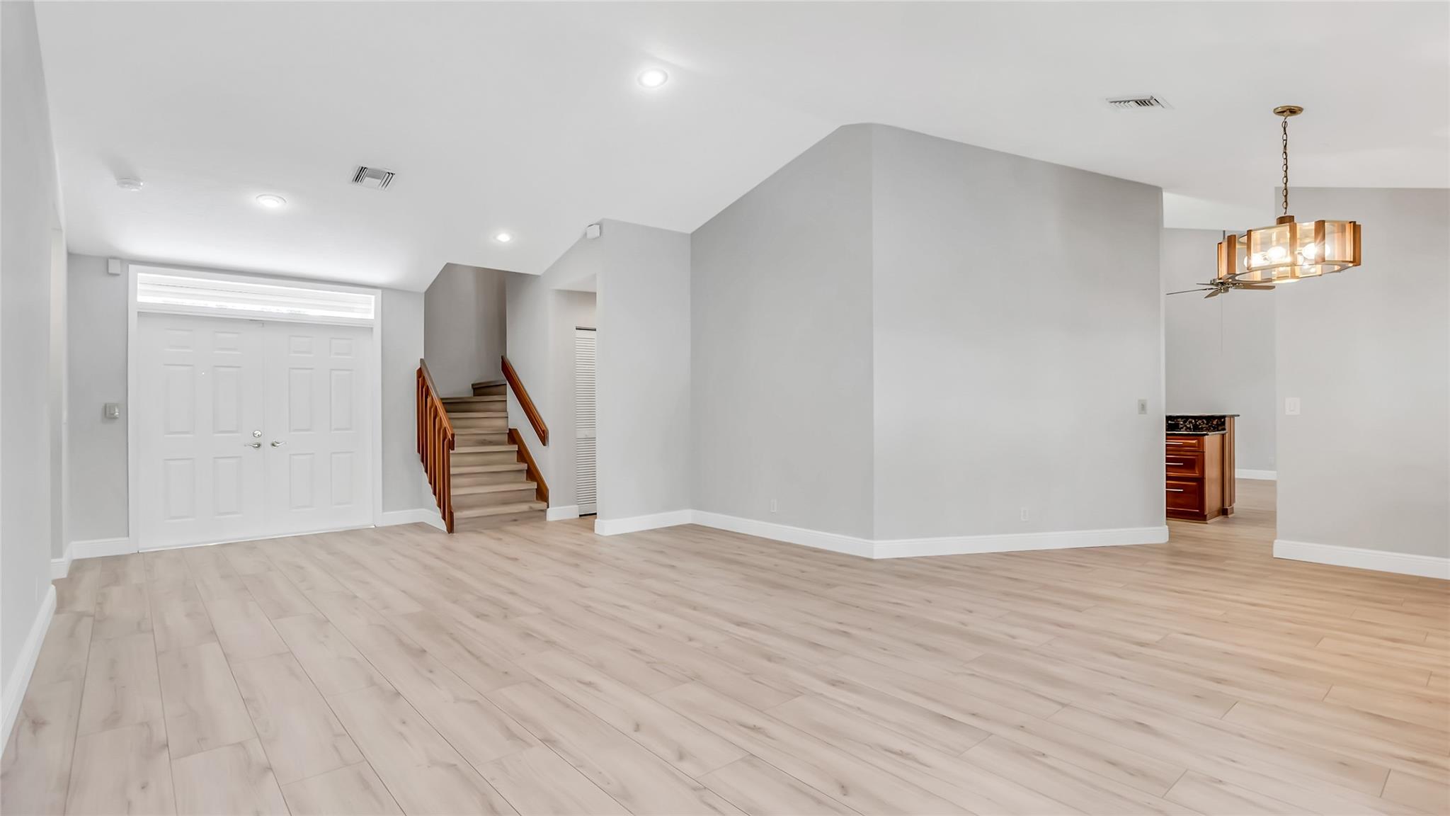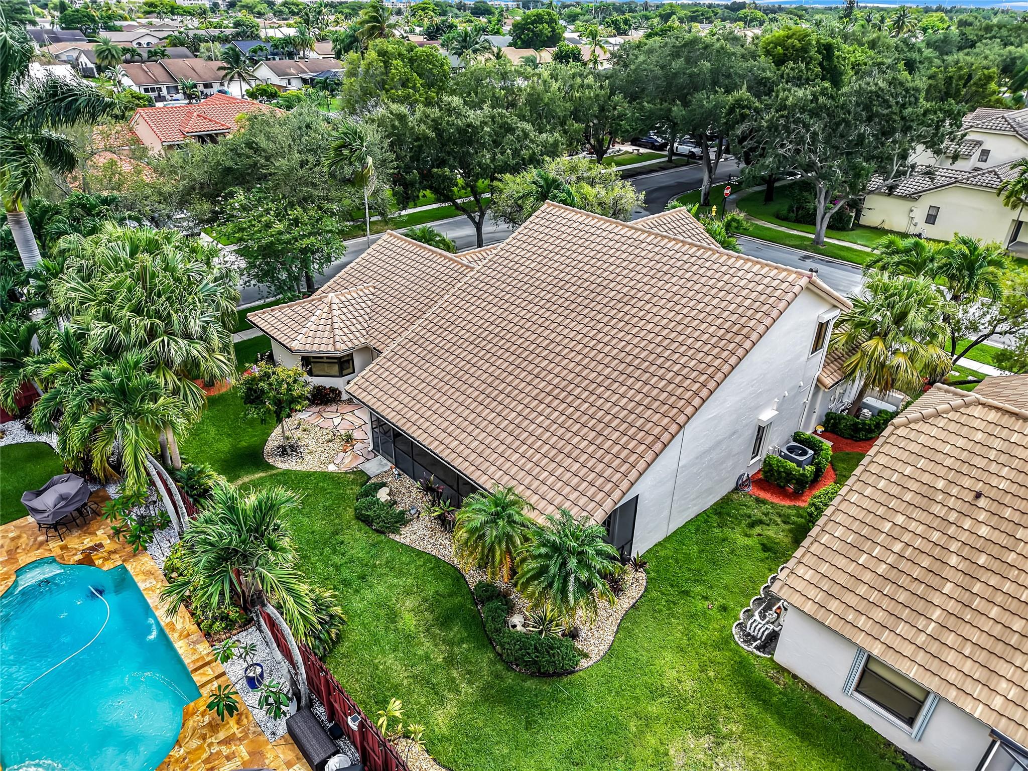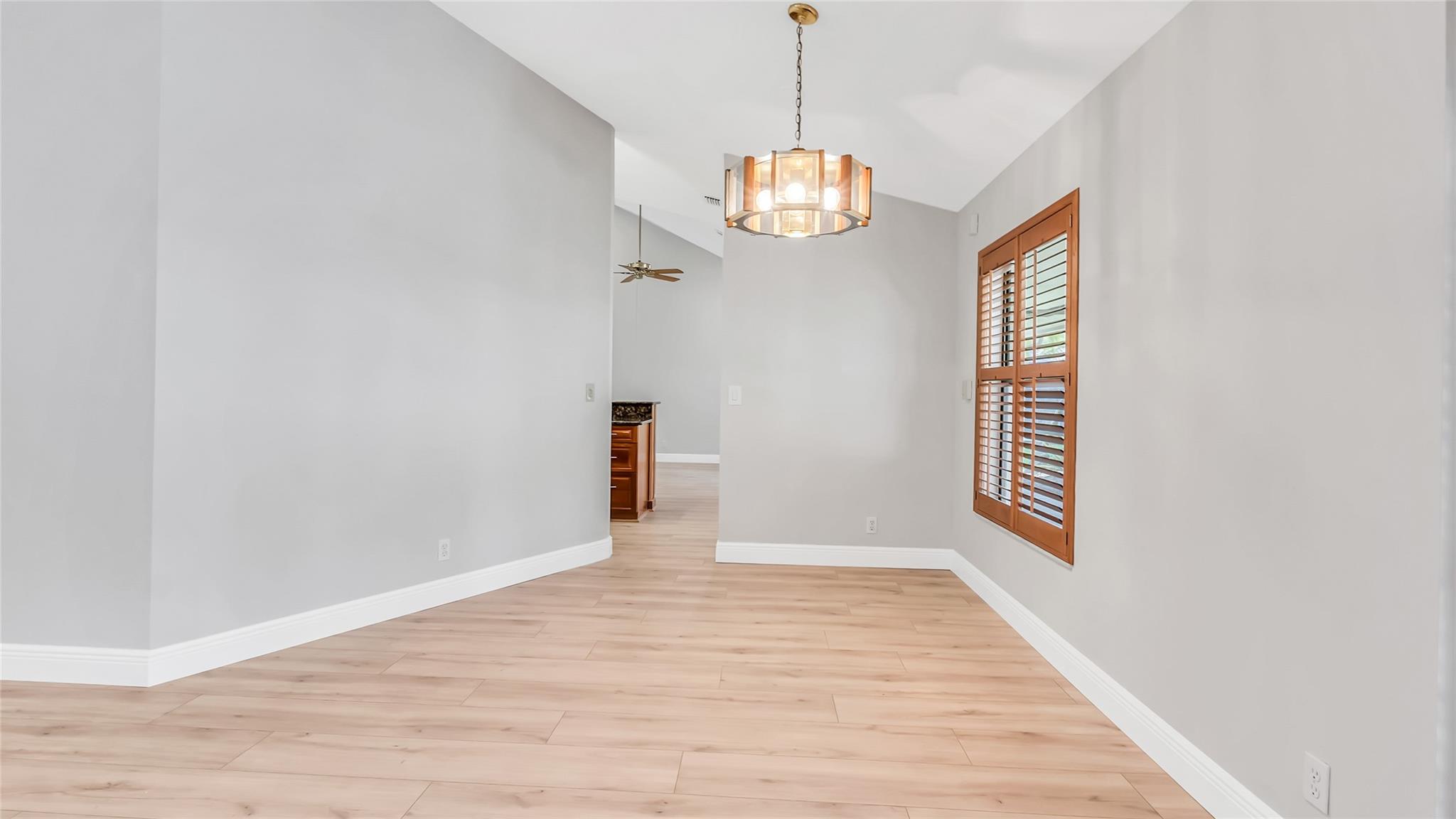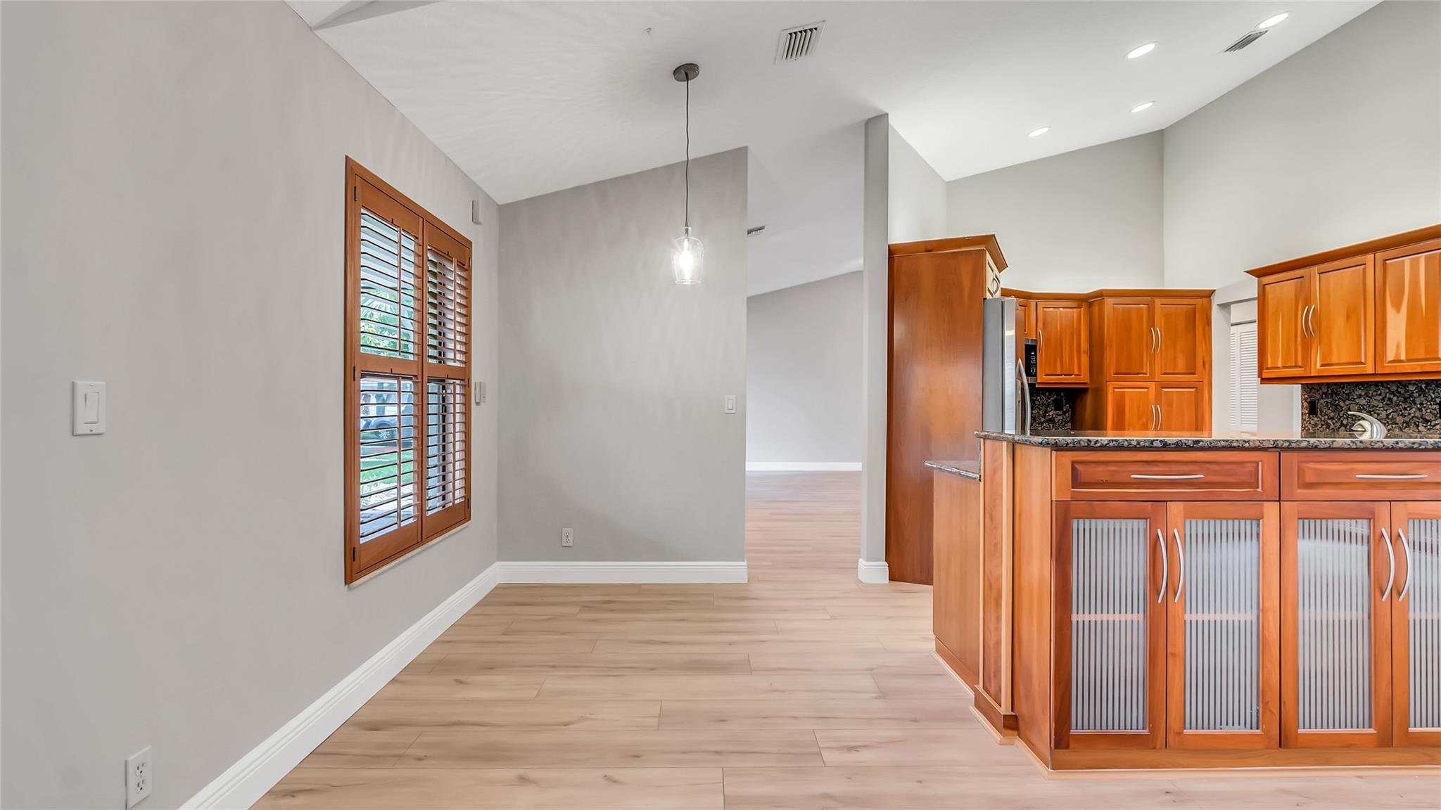 Beautifully updated corner lot home, soaring ceilings, smart, functional layout! 2025 improvements include fresh interior/exterior paint, popcorn ceiling removed & upgraded laminate flooring throughout. First-floor primary suite features: walk-in closet, roman tub, stall shower, quartz vanity, private office/den w/wood floors, built-ins & impact windows Additional downstairs bedroom & full bath; 2 more bedrooms upstairs w/renovated full bath. Kitchen offers granite counters, wood cabinets, pantry pull-outs, under/upper cabinet lighting & abundant recessed lighting. Family room w/dry bar w/quartz counters, inside laundry room & Plantation shutters throughout. Whole-house 22KW propane generator, 2022 A/C, electric rolldown shutters, alarm system w/cameras, lush landscaping complete this home