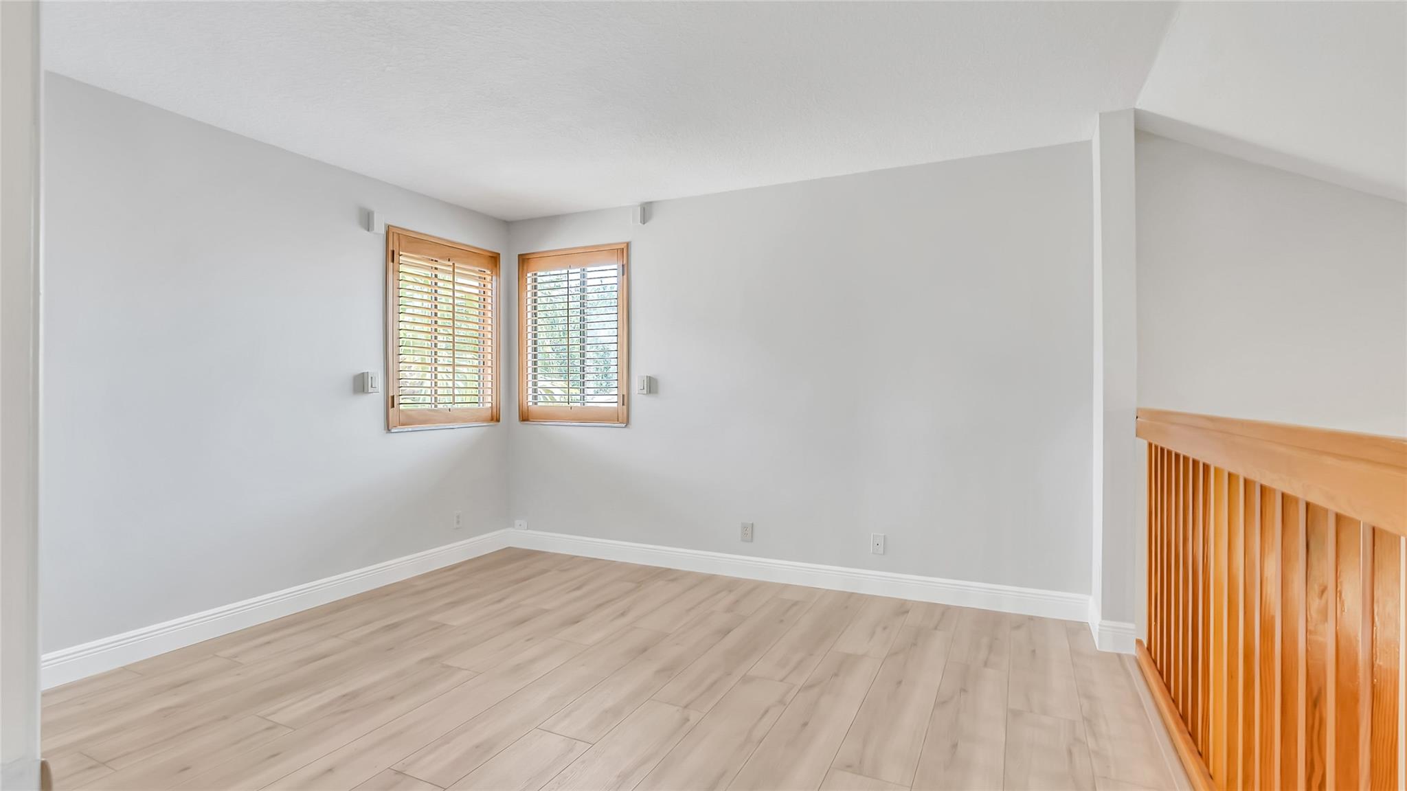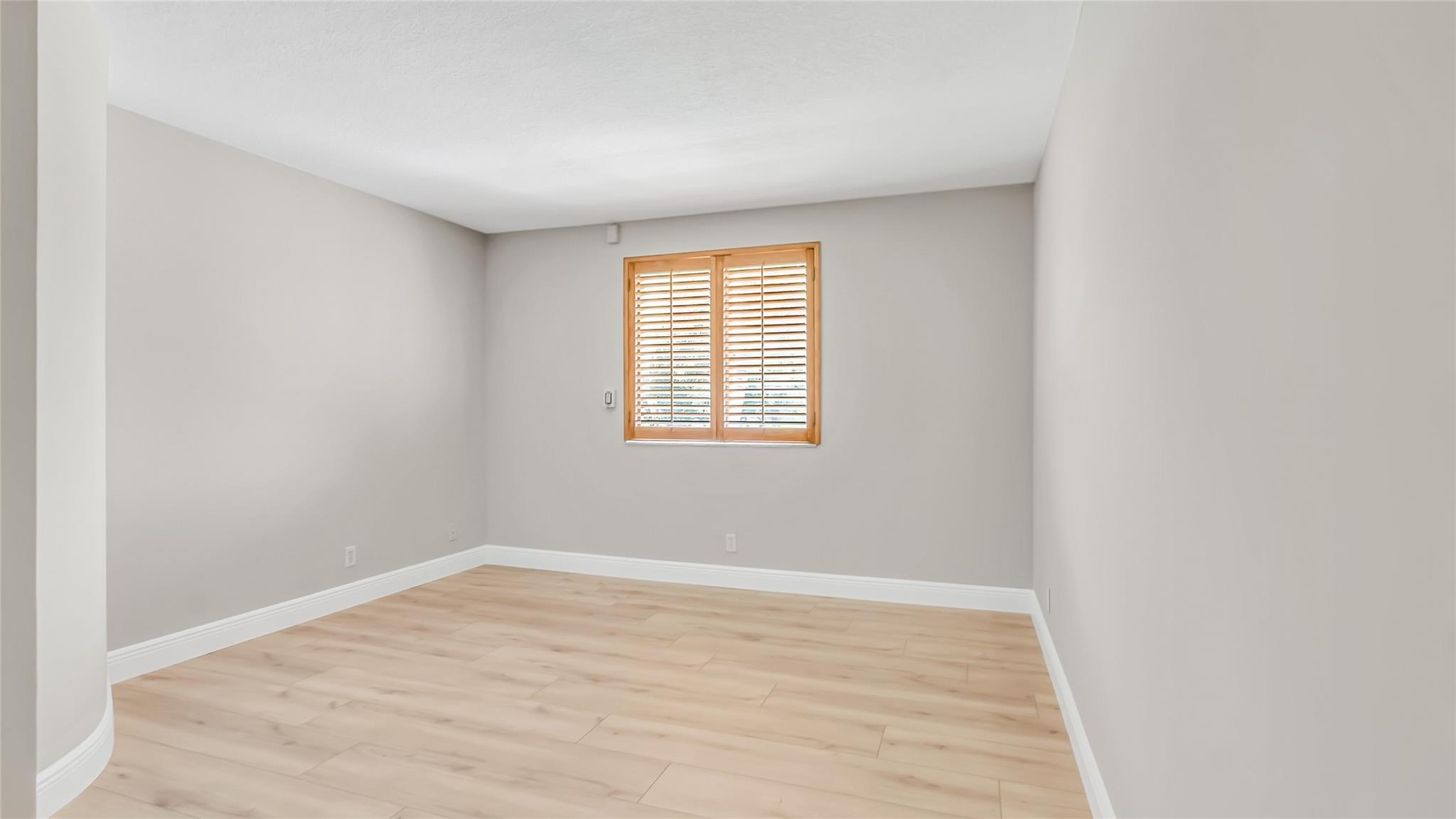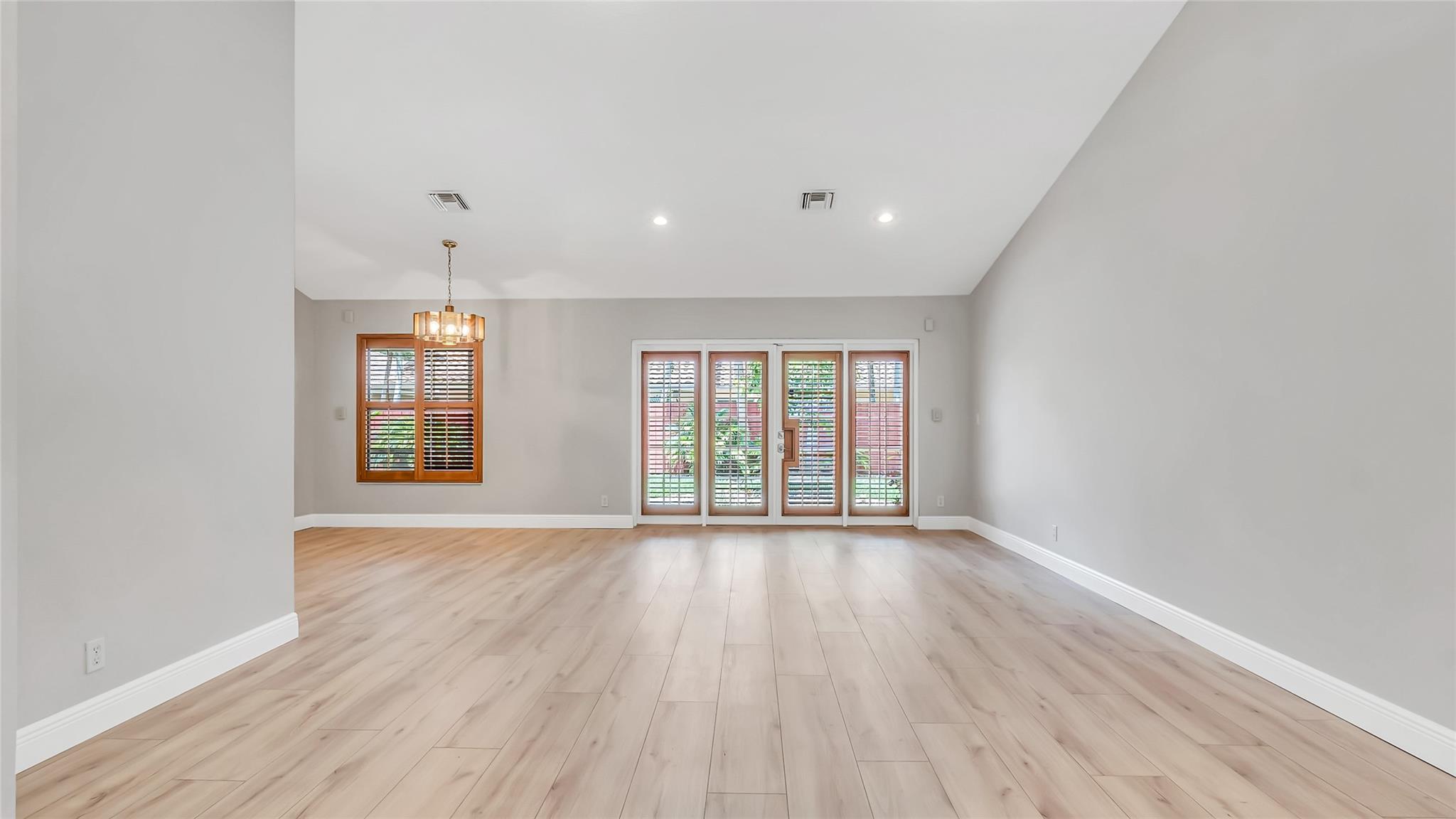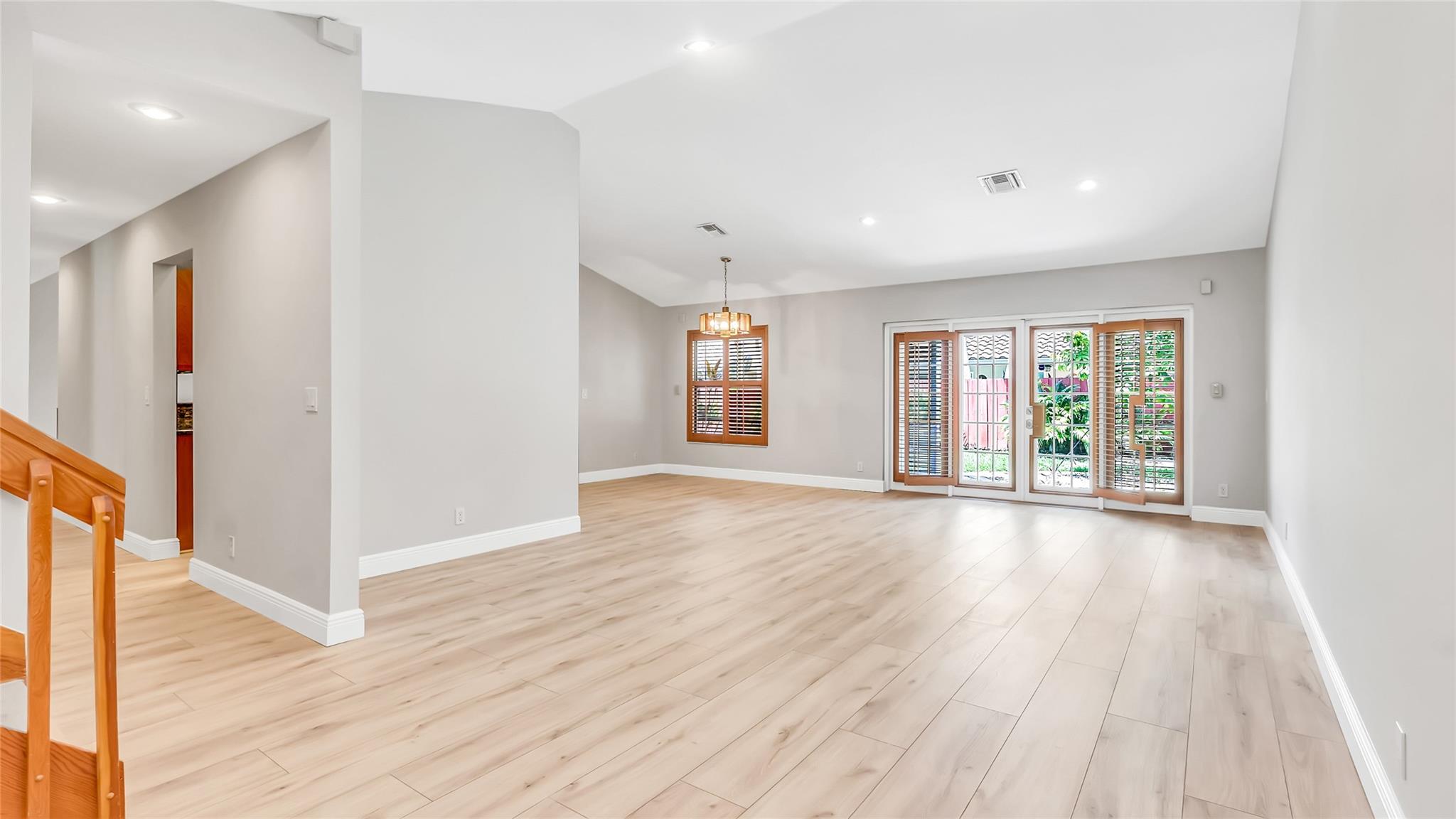Beautifully updated corner lot home, soaring ceilings, smart, functional layout! 2025 improvements include fresh interior/exterior paint, popcorn ceiling removed & upgraded laminate flooring throughout. First-floor primary suite features: walk-in closet, roman tub, stall shower, quartz vanity, private office/den w/wood floors, built-ins & impact windows Additional downstairs bedroom & full bath; 2 more bedrooms upstairs w/renovated full bath. Kitchen offers granite counters, wood cabinets, pantry pull-outs, under/upper cabinet lighting & abundant recessed lighting. Family room w/dry bar w/quartz counters, inside laundry room & Plantation shutters throughout. Whole-house 22KW propane generator, 2022 A/C, electric rolldown shutters, alarm system w/cameras, lush landscaping complete this home