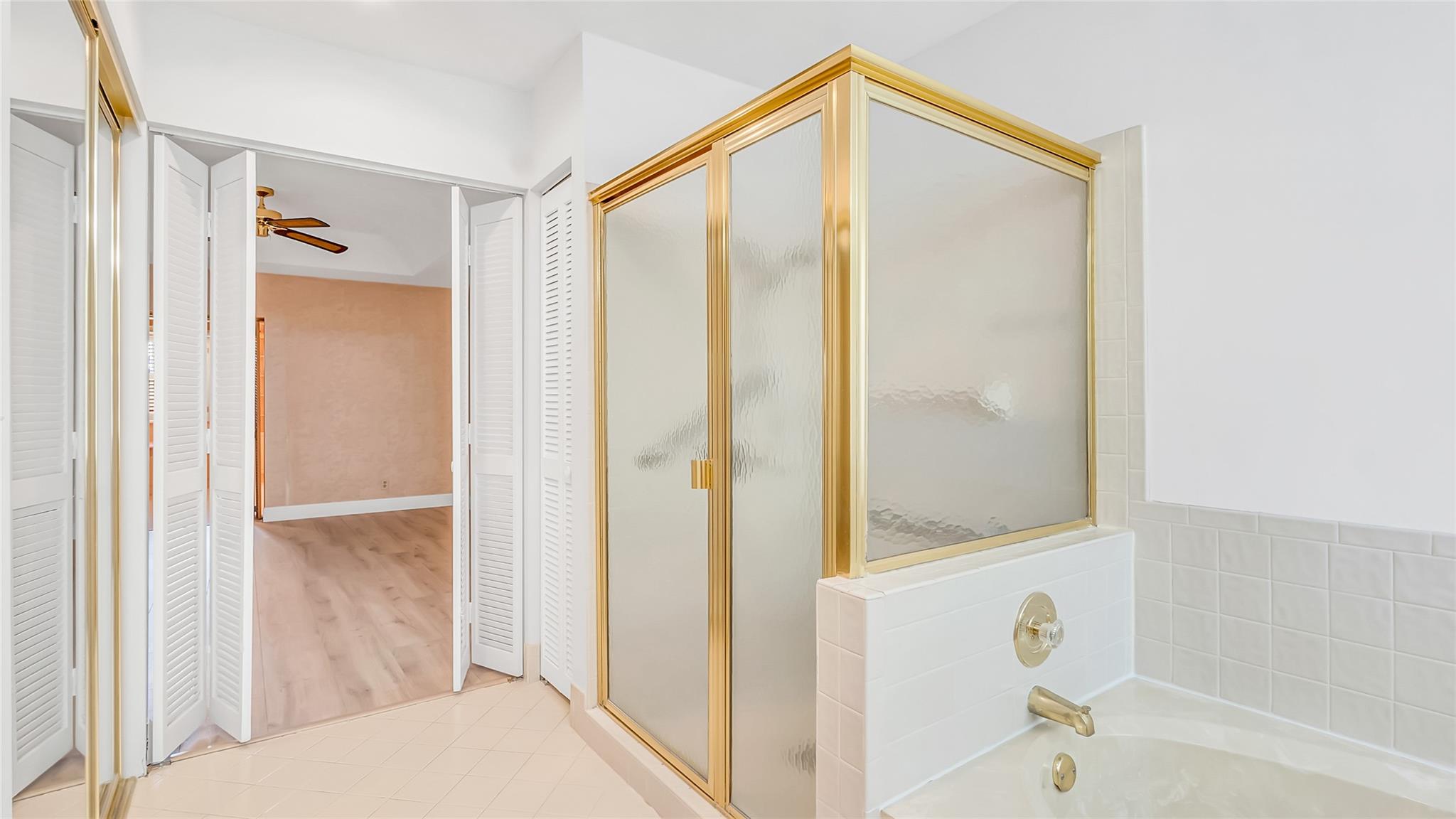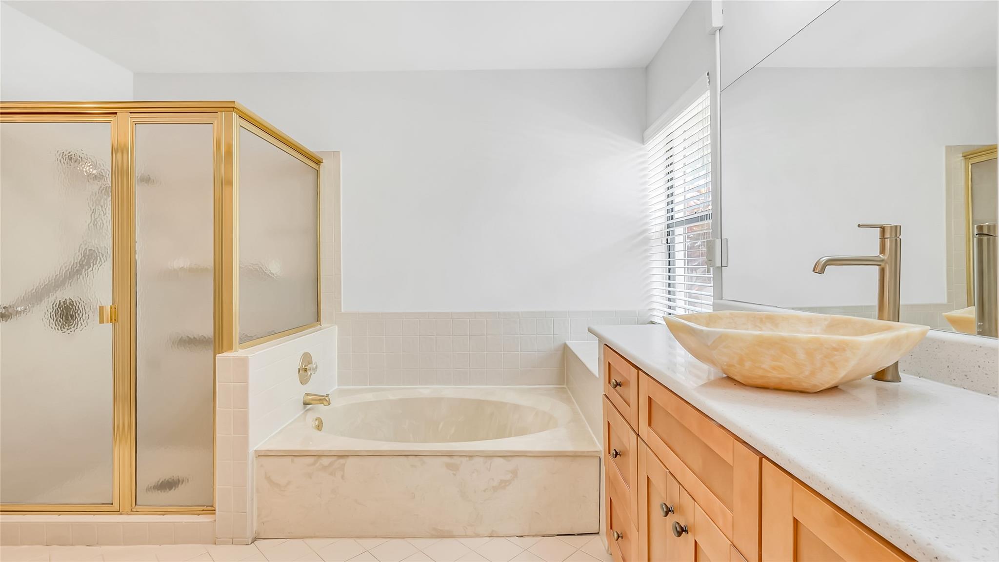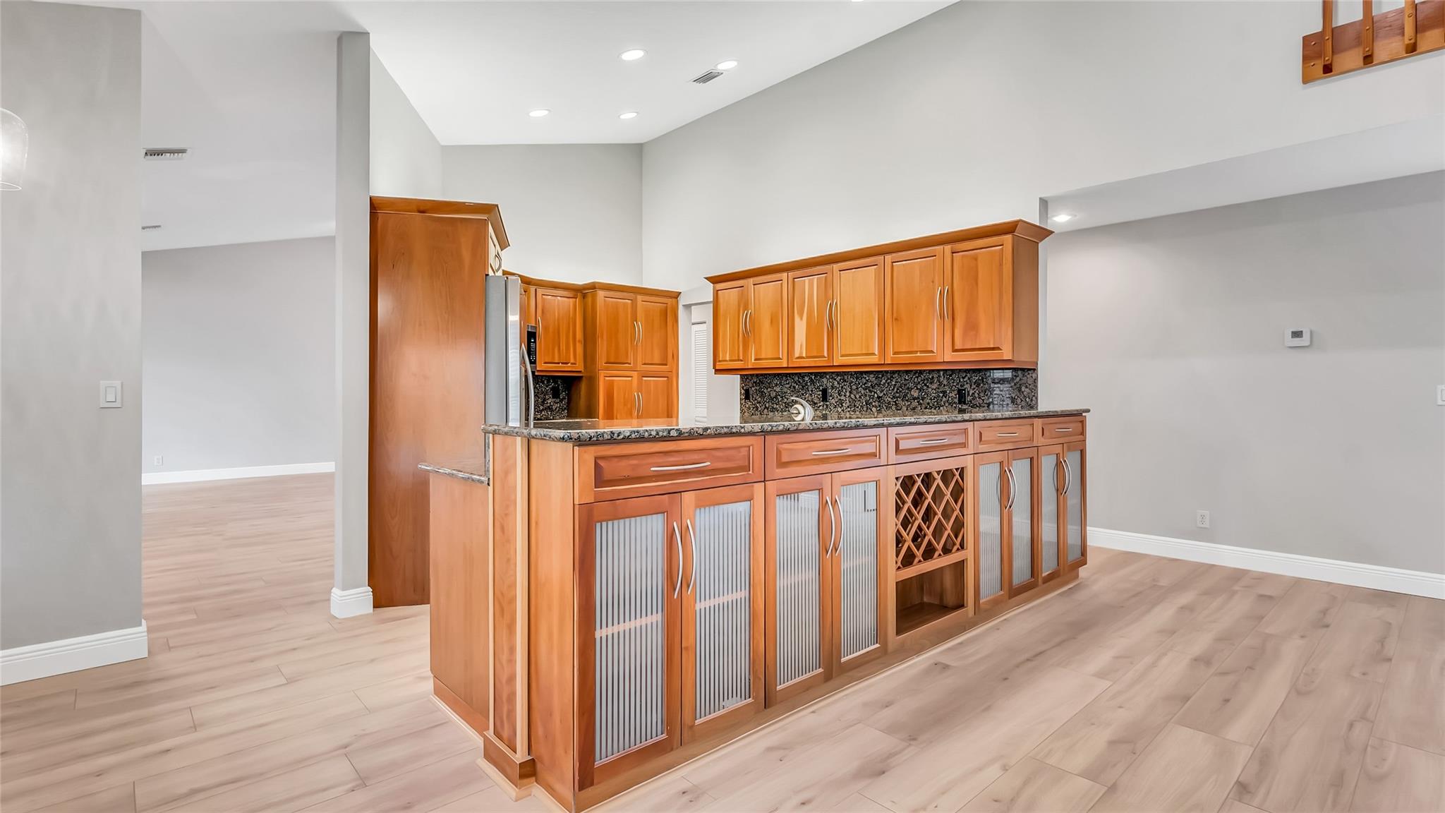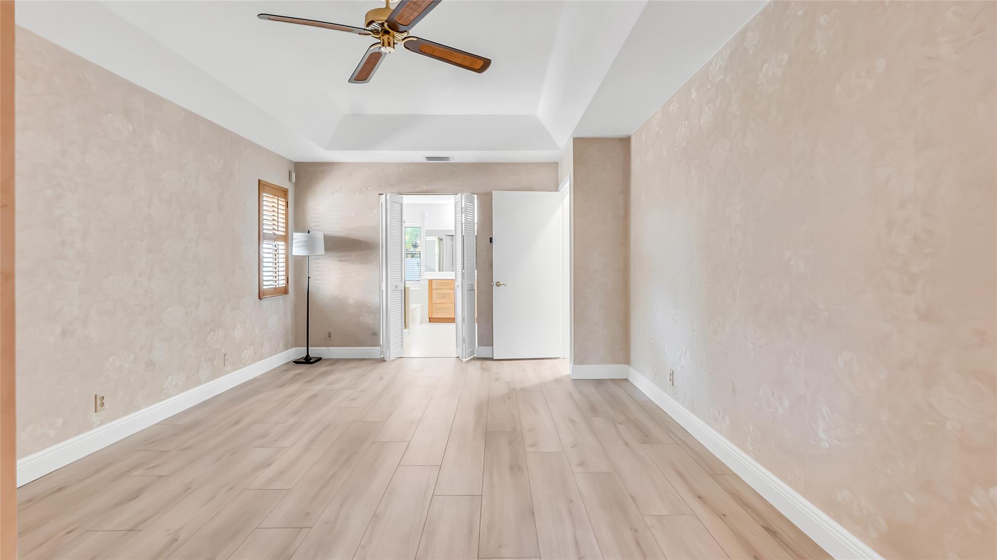 Beautifully updated corner lot home, soaring ceilings, smart, functional layout! 2025 improvements include fresh interior/exterior paint, popcorn ceiling removed & upgraded laminate flooring throughout. First-floor primary suite features: walk-in closet, roman tub, stall shower, quartz vanity, private office/den w/wood floors, built-ins & impact windows Additional downstairs bedroom & full bath; 2 more bedrooms upstairs w/renovated full bath. Kitchen offers granite counters, wood cabinets, pantry pull-outs, under/upper cabinet lighting & abundant recessed lighting. Family room w/dry bar w/quartz counters, inside laundry room & Plantation shutters throughout. Whole-house 22KW propane generator, 2022 A/C, electric rolldown shutters, alarm system w/cameras, lush landscaping complete this home