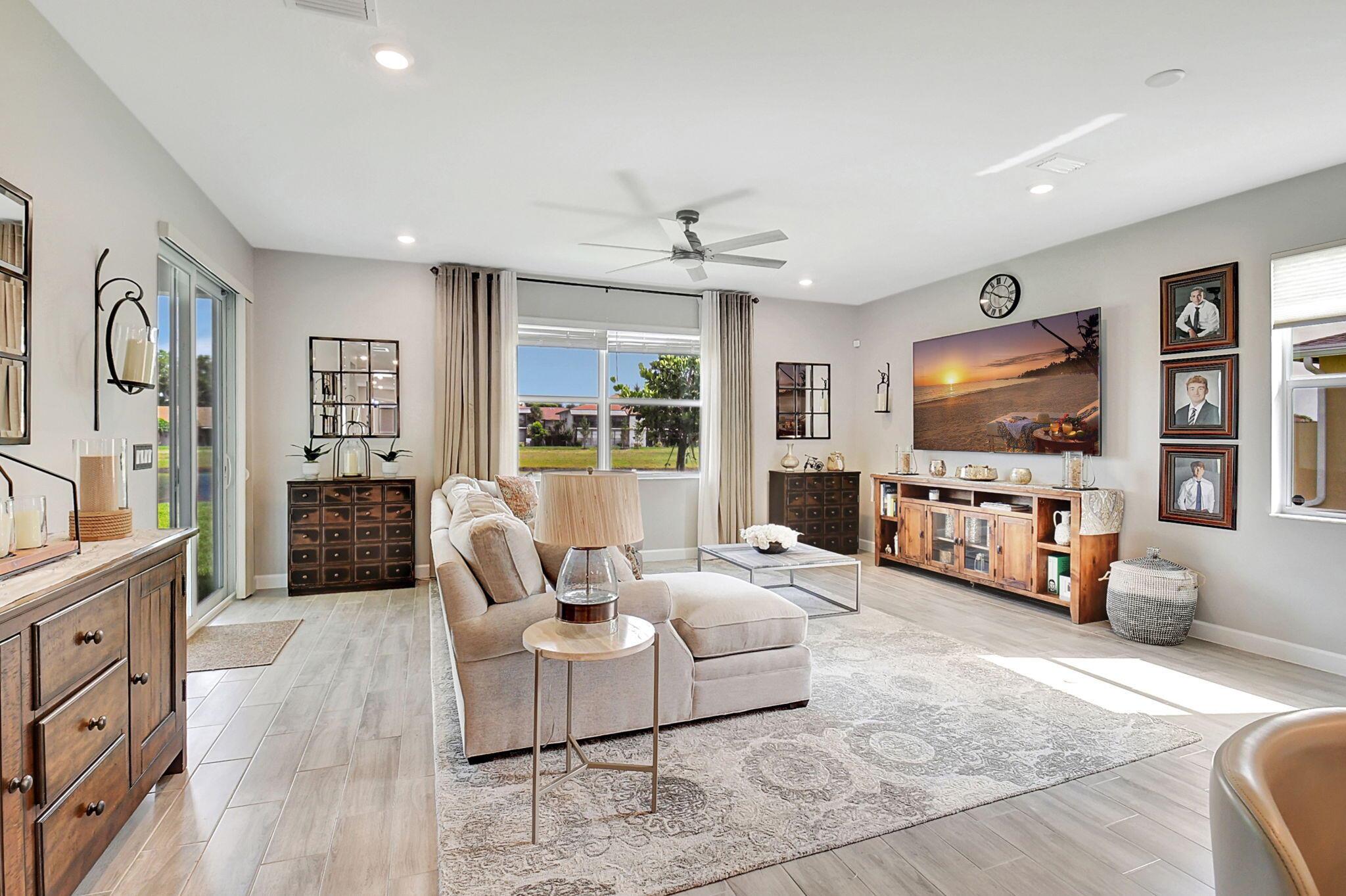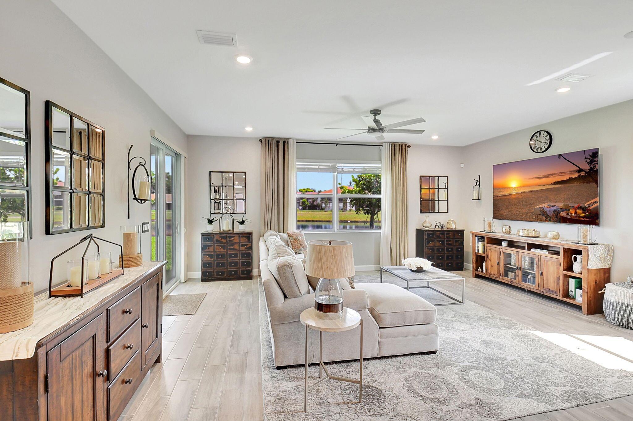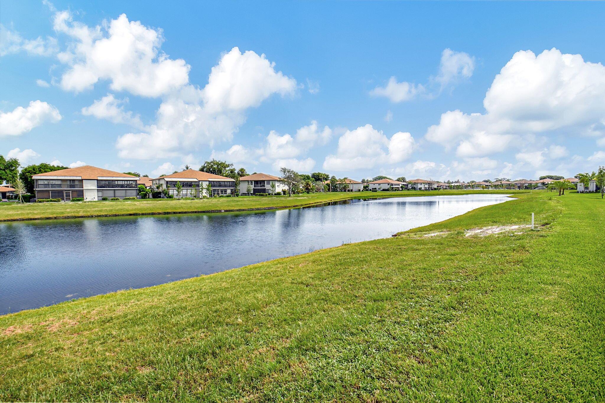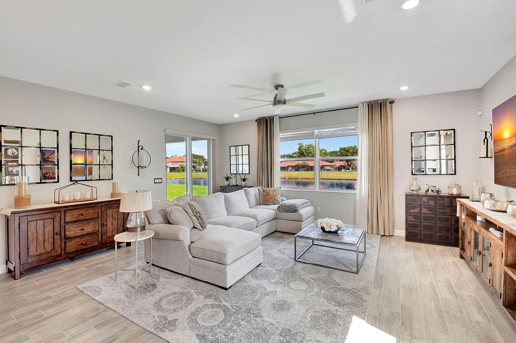 Fantastic opportunity to own this elegant NOW VACANT home with a lakefront view in active 55+ community with luxury amenities, just minutes to the beach, boutiques, and dining on the Ave, or charming Pineapple Grove. Lightly lived in seasonal home impeccably cared for is beautifully appointed with designer upgrades including porcelain tile, custom mirror backsplash, glass entry, a current palate; and practical ones like full impact windows that fill the home with light without excess solar gain. Enjoy the best of Florida living with 3 resort style pools, clubhouse, fitness facility, restaurant, tennis, and pickleball. Sidewalks and street lights offer a walkable community and this home's ideal location places you a short stroll to the amenities. See docs for more upgrades and features.
