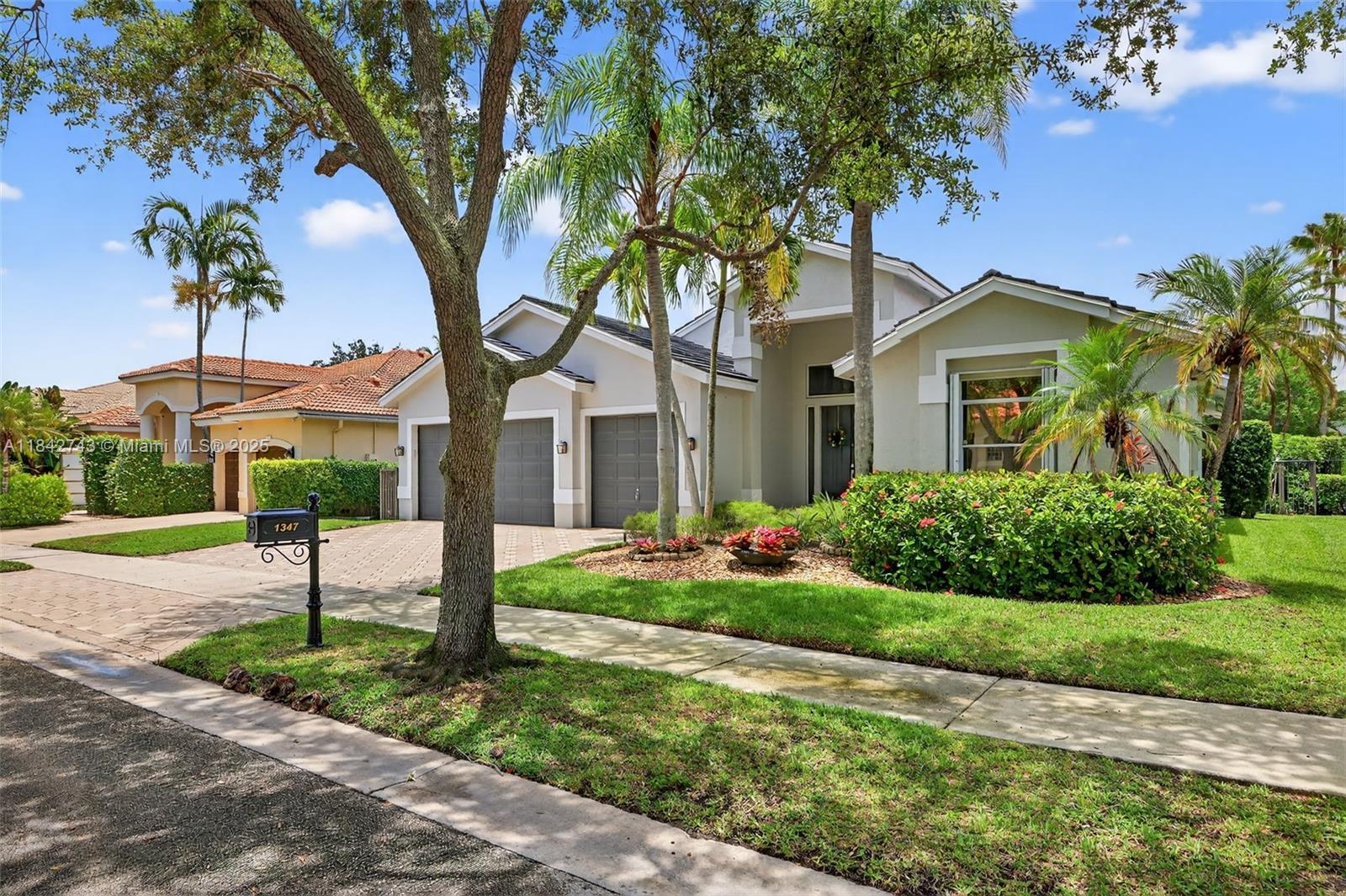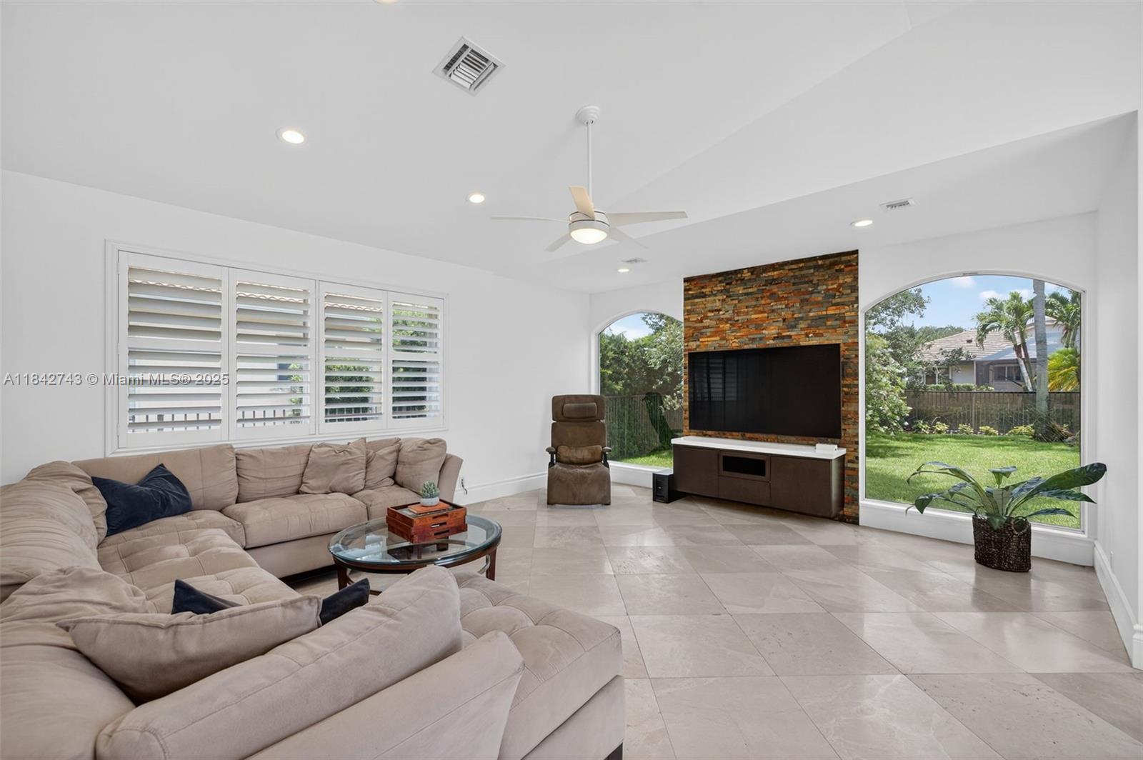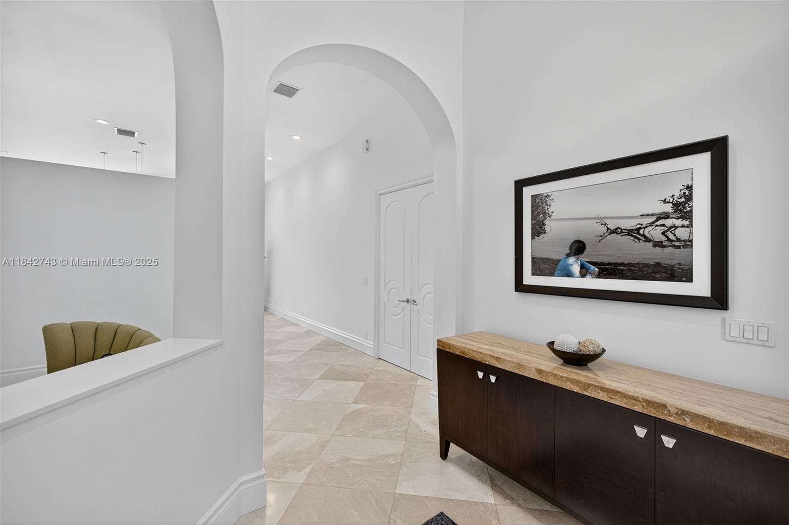 Located in a quiet, pet-friendly neighborhood with 24-hr manned gate and walkable access to the town center, this 4/3 features a Grand foyer, high ceilings and marble floors. Open kitchen with quartz counters, granite tabletop, prep sink, full-length appliance garage, retractable island, pull-out pantry, induction stove, double ovens, soft-close drawers, and built-in hutch. Master suite has flex room, sound-buffered walls, soaking tub, dual shower heads, floating furniture, and floor-to-ceiling closets. Guest suite is also sound-buffered. Living room features impact picture windows and floating TV unit. Wired for ceiling speakers. Accordion shutters, tinted windows, fenced yard, 3-car garage with workbench. Community has basketball, volleyball, and playground.