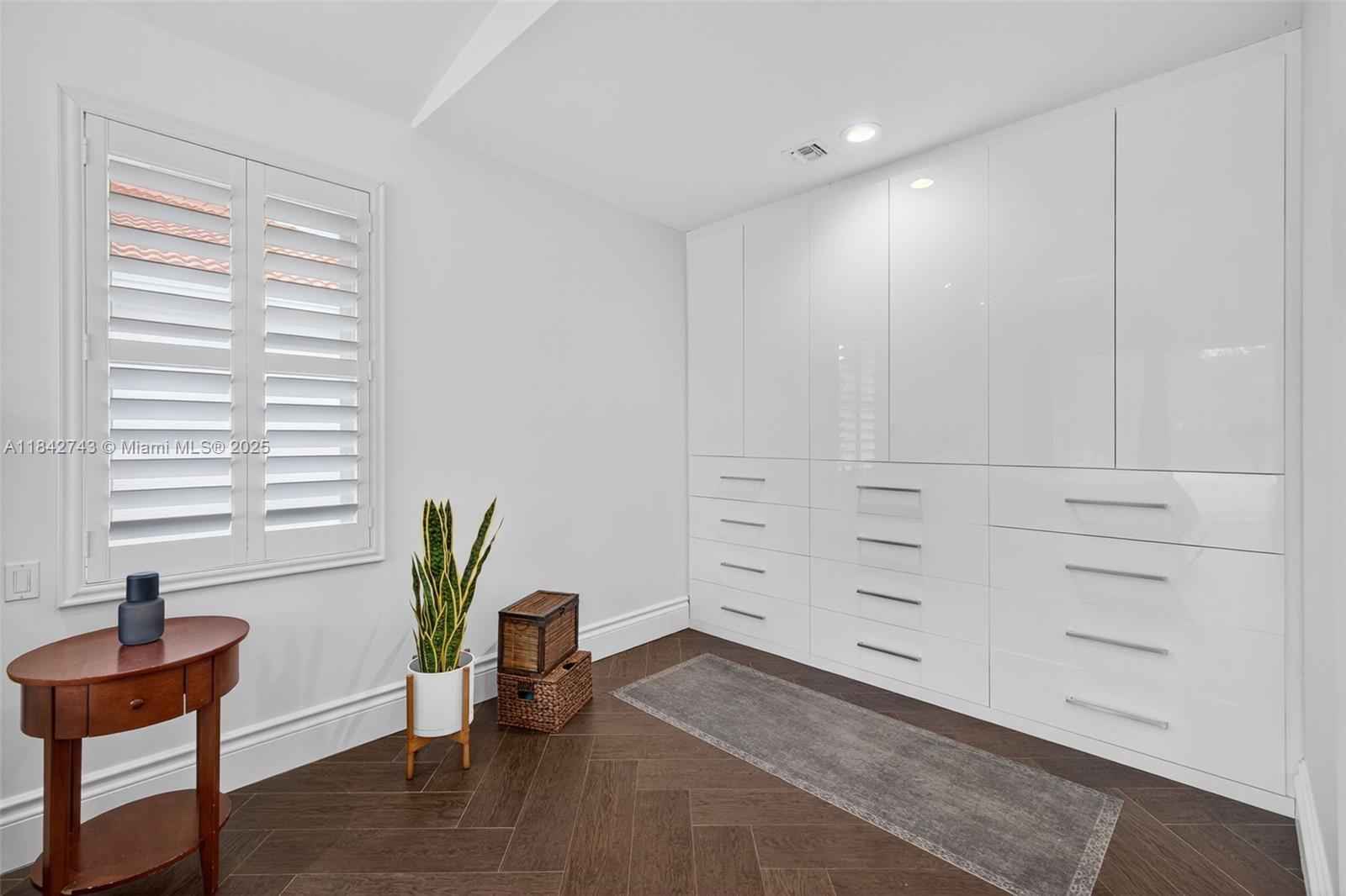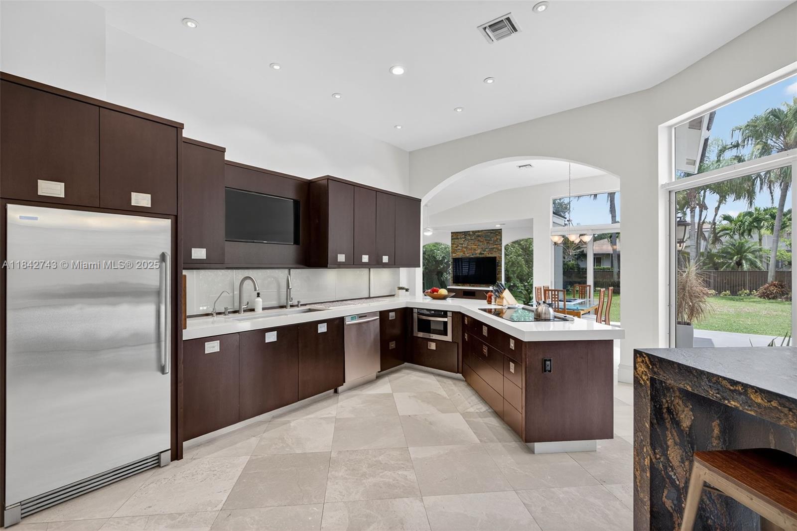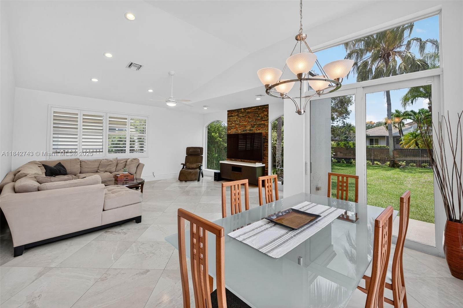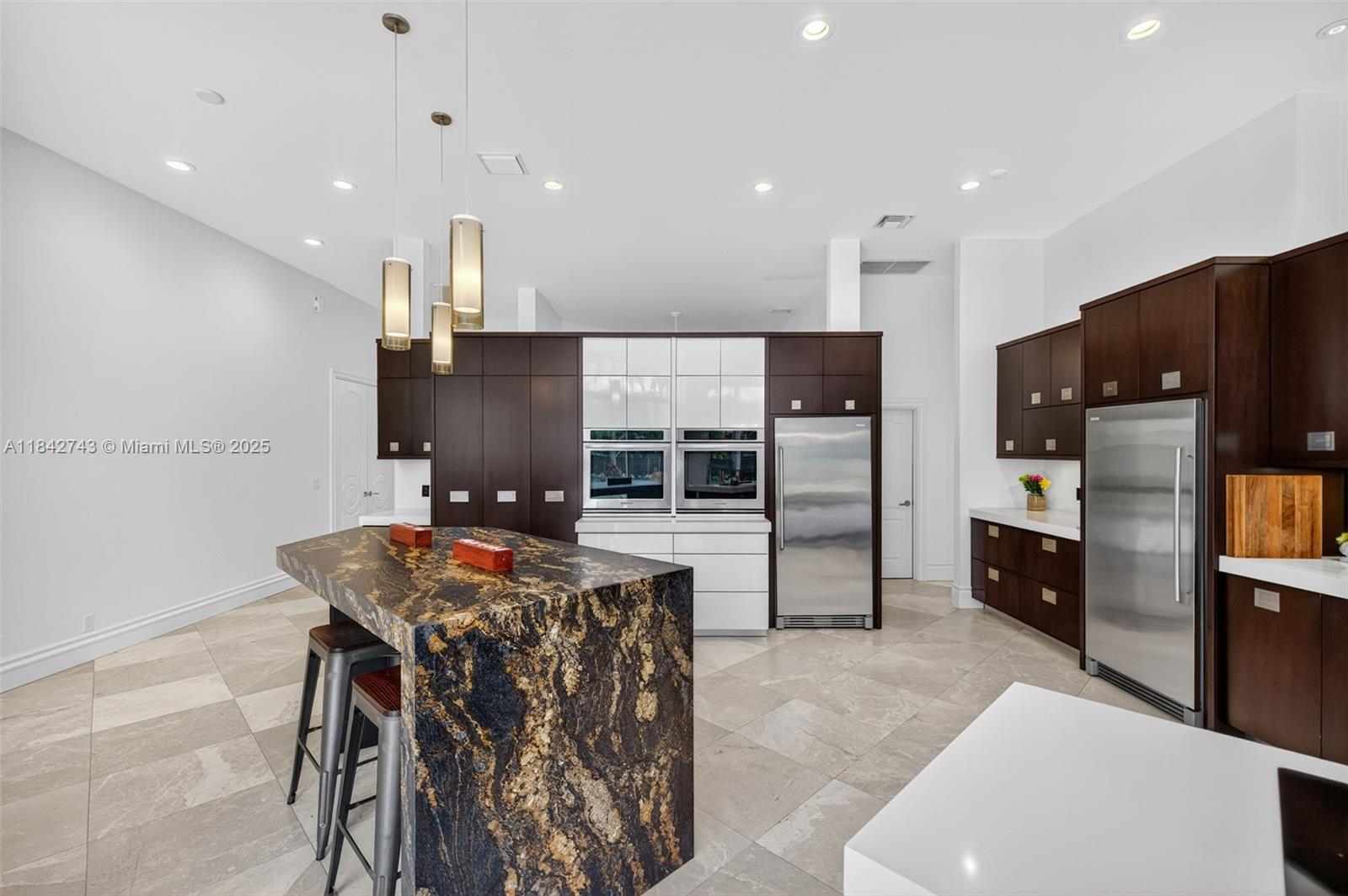 Located in a quiet, pet-friendly neighborhood with 24-hr manned gate and walkable access to the town center, this 4/3 features a Grand foyer, high ceilings and marble floors. Open kitchen with quartz counters, granite tabletop, prep sink, full-length appliance garage, retractable island, pull-out pantry, induction stove, double ovens, soft-close drawers, and built-in hutch. Master suite has flex room, sound-buffered walls, soaking tub, dual shower heads, floating furniture, and floor-to-ceiling closets. Guest suite is also sound-buffered. Living room features impact picture windows and floating TV unit. Wired for ceiling speakers. Accordion shutters, tinted windows, fenced yard, 3-car garage with workbench. Community has basketball, volleyball, and playground.